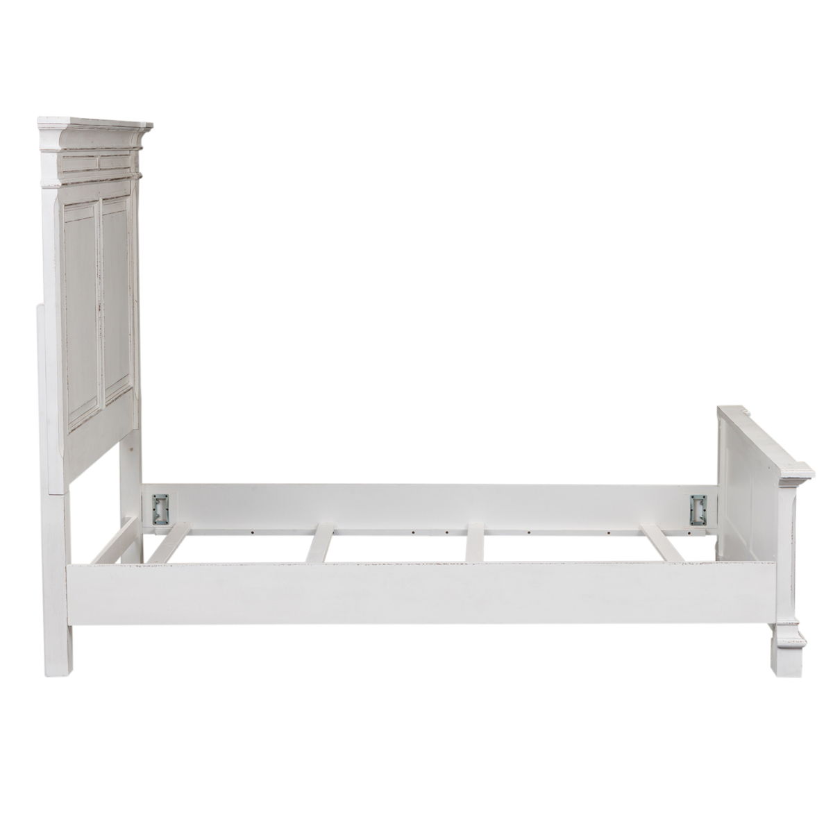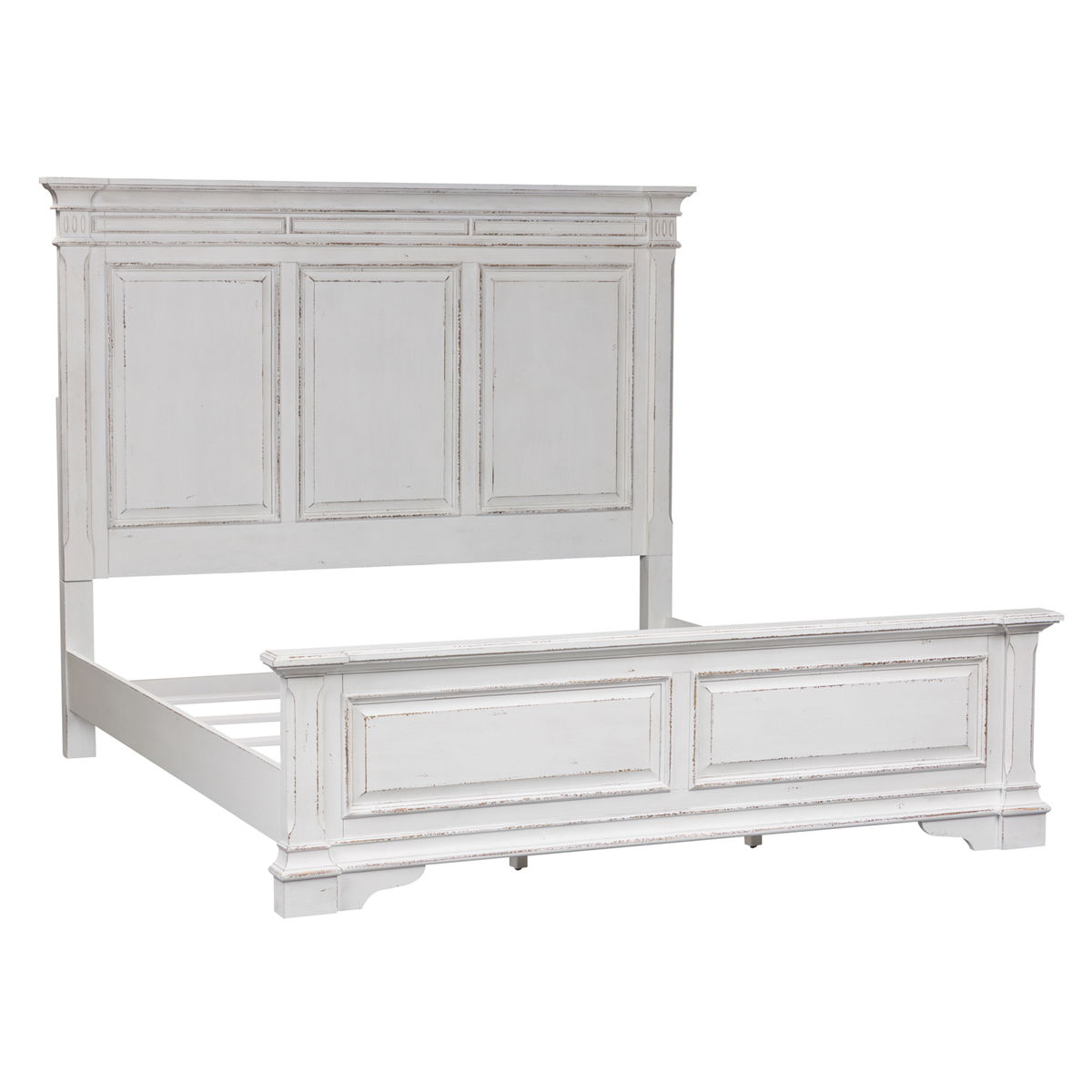 This panel bed is the perfect way to accent your room with an effortless blend of European Traditional design. Crafted with poplar solids and cathedral white oak veneers, this piece features a bolt on rail system and a center support slat system. The antique whitewash combined with heavy chipping, creates a truly unique look.
