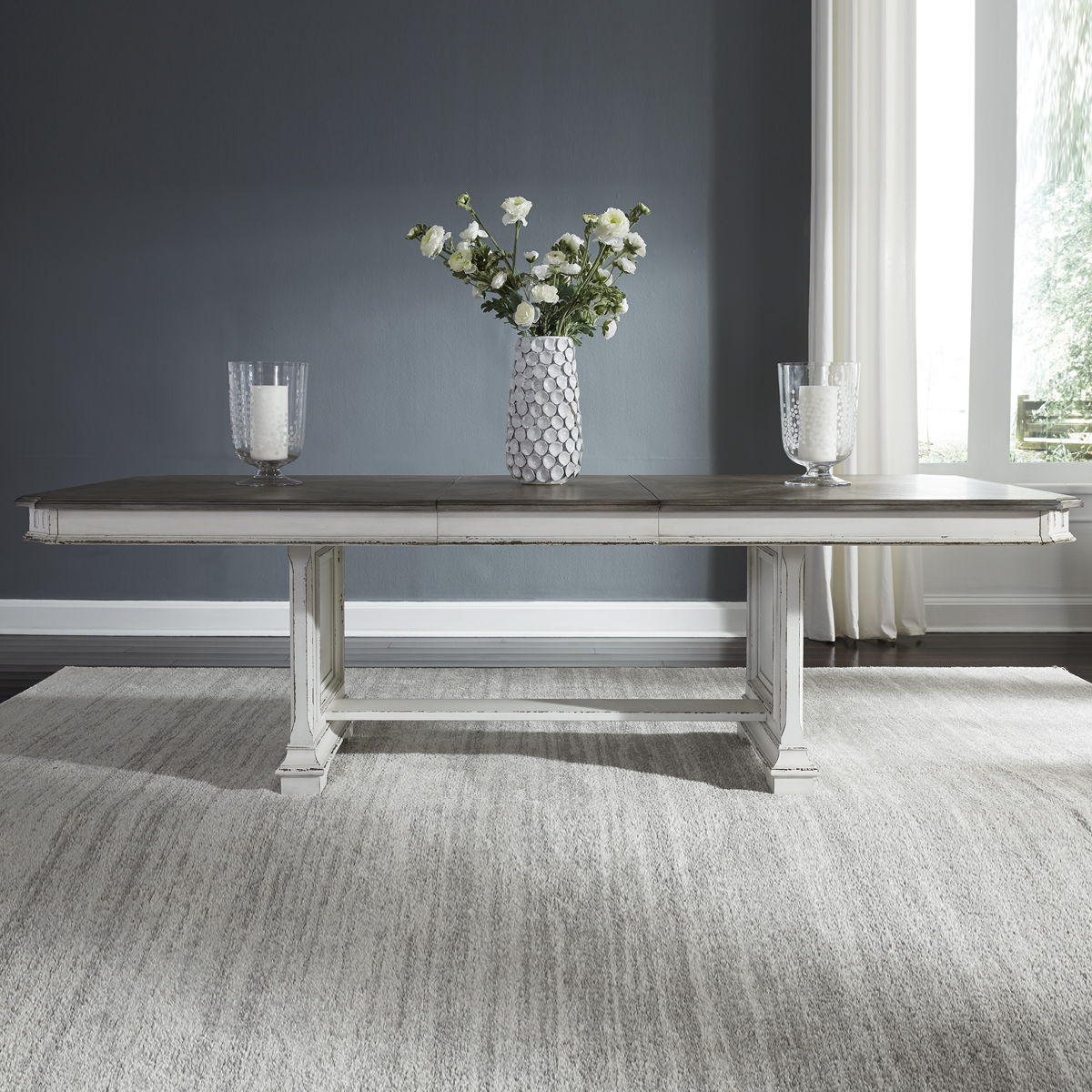 Blending of European traditional design influences makes Abbey Park a truly unique style for any living space. Warm antique finishes and artistic distressing along with grand scale makes Abbey Park a group to be passed to generations. The antique white finish with heavy chipping combines with the weathered brown white wash tops for a truly unique look. Bail and drop ring hardware in antique pewter add the finishing touch to the cases.
