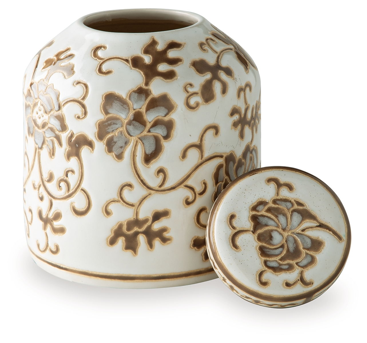 Evoke the feeling of a treasured heirloom with this exquisite jar. The warm palette and delicate floral pattern add a layer of curated worldly style to your favorite spot. Let it stand alone as a sophisticated art piece on your mantel, or fill it with a few fresh stems to bring a touch of life to your room.