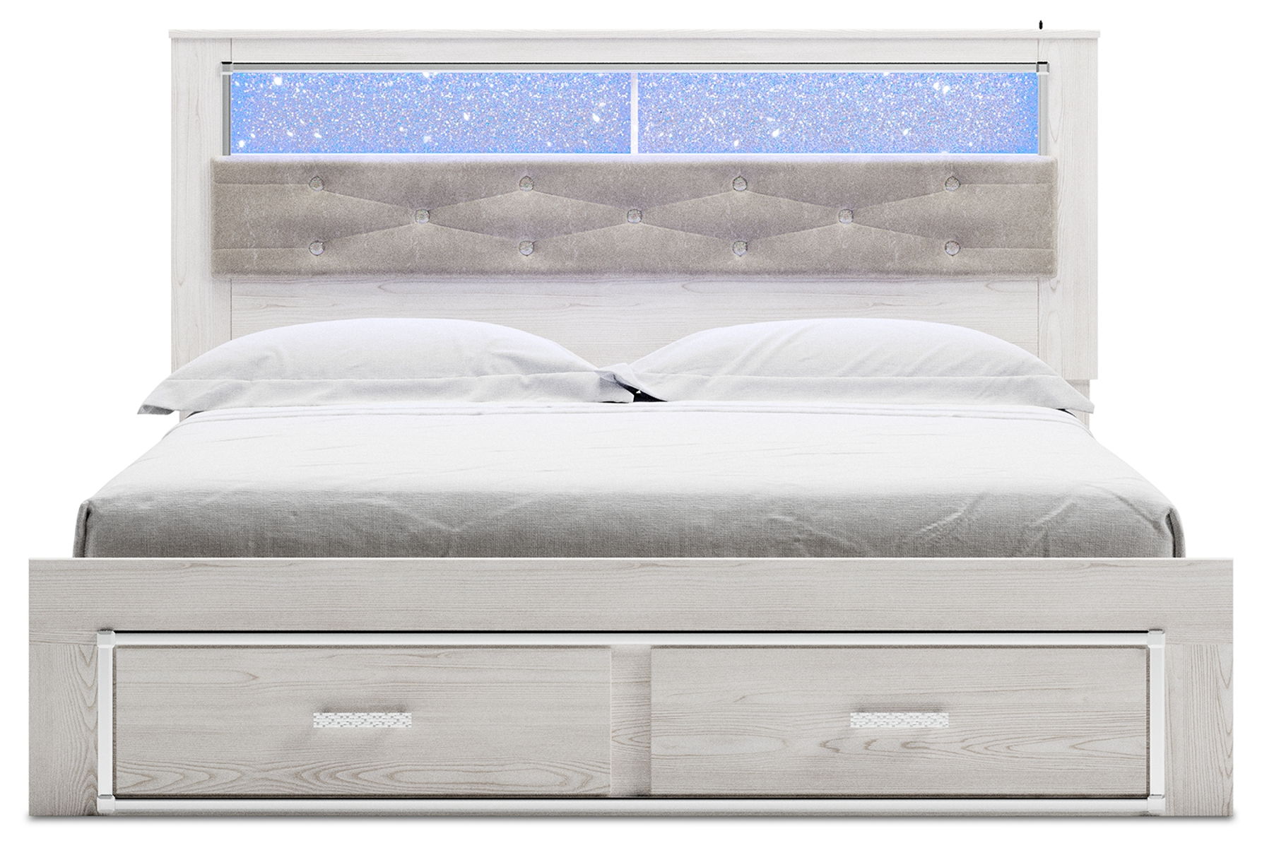 - Includes king upholstered panel bookcase headboard, storage footboard, platform rails and roll slats