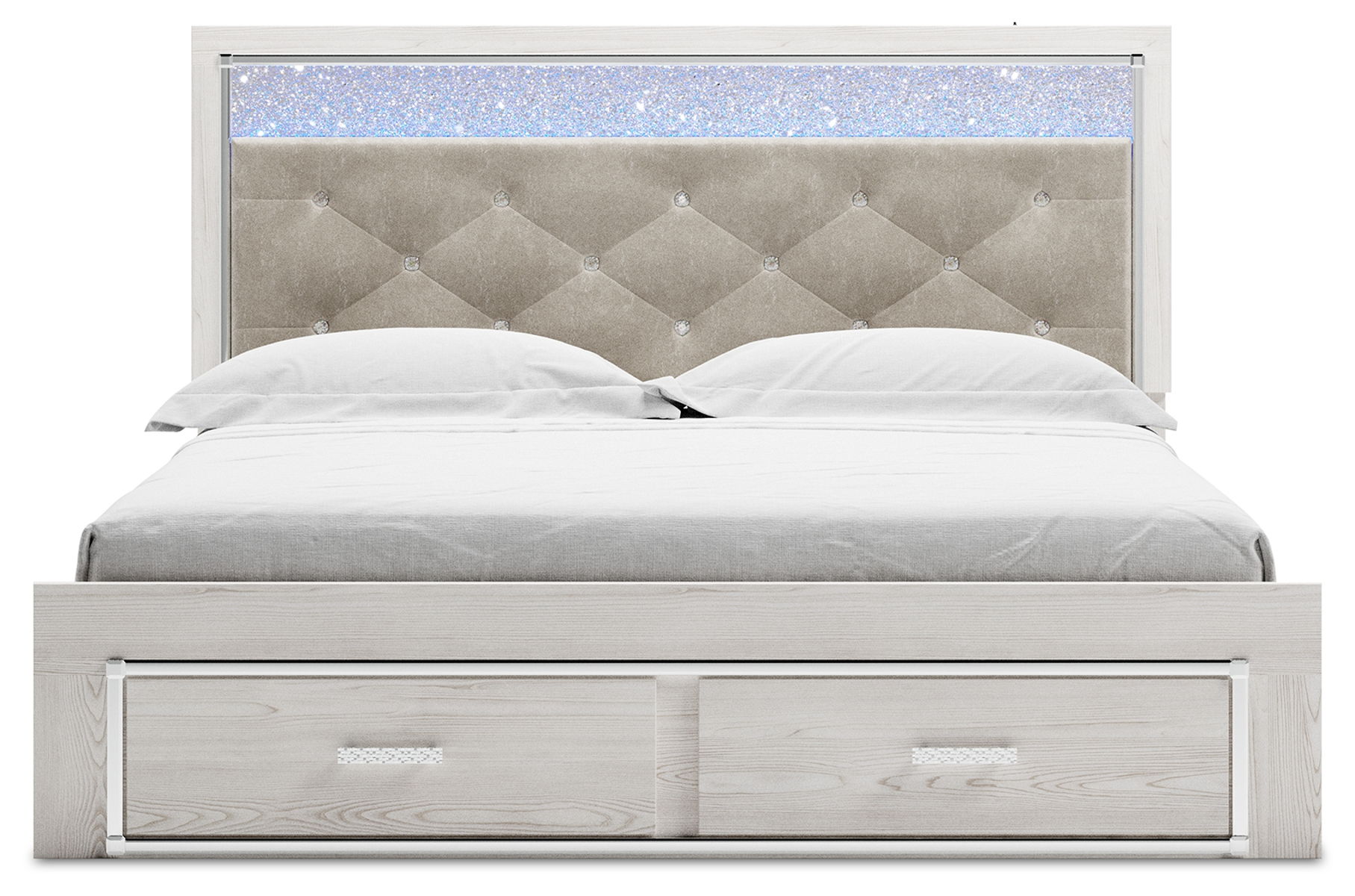 - Includes king upholstered panel headboard, storage footboard, platform rails and roll slats