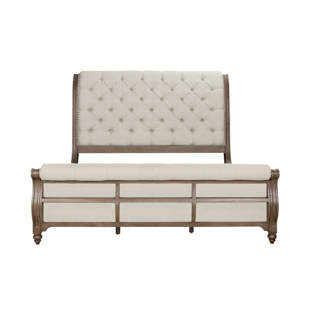 When details matter, choose the Americana Farmhouse sleigh bed. Crafted of poplar solids with oak veneers, this bed features a wire brushed finish with worm hole distressing. The headboard and footboard feature a button tufted upholstered linen rolled top panel, framed by shaped solid wood pilasters with nail heads accenting the frame of the upholstery. The footboard has an exposed frame to create a deconstructed feel. With the bolt-on rails and center support slat system, this bed is sure to last. Americana Farmhouse evokes a style unconstrained and intended to be personal with an authentic craftsman’s flair and artistry.