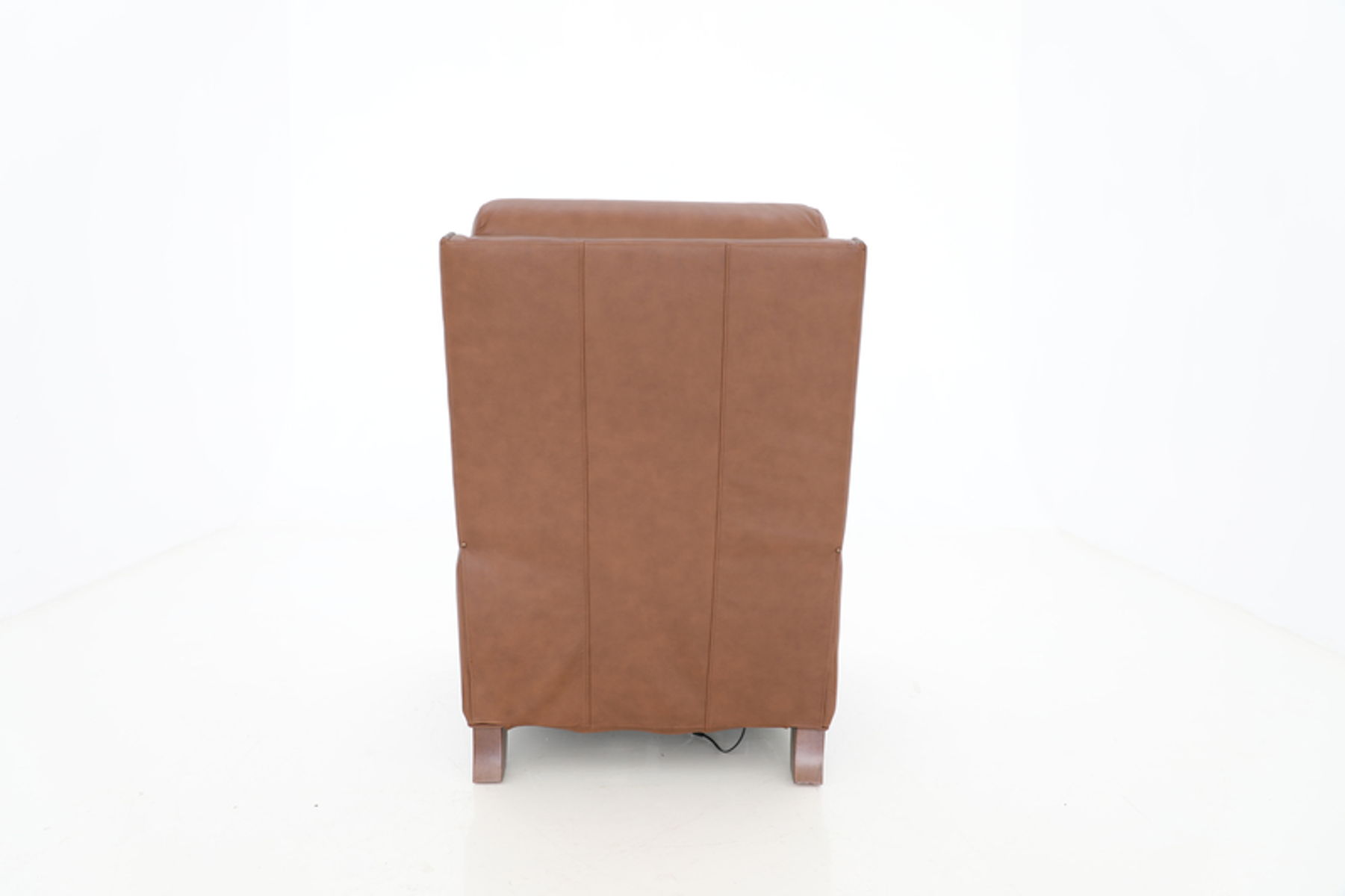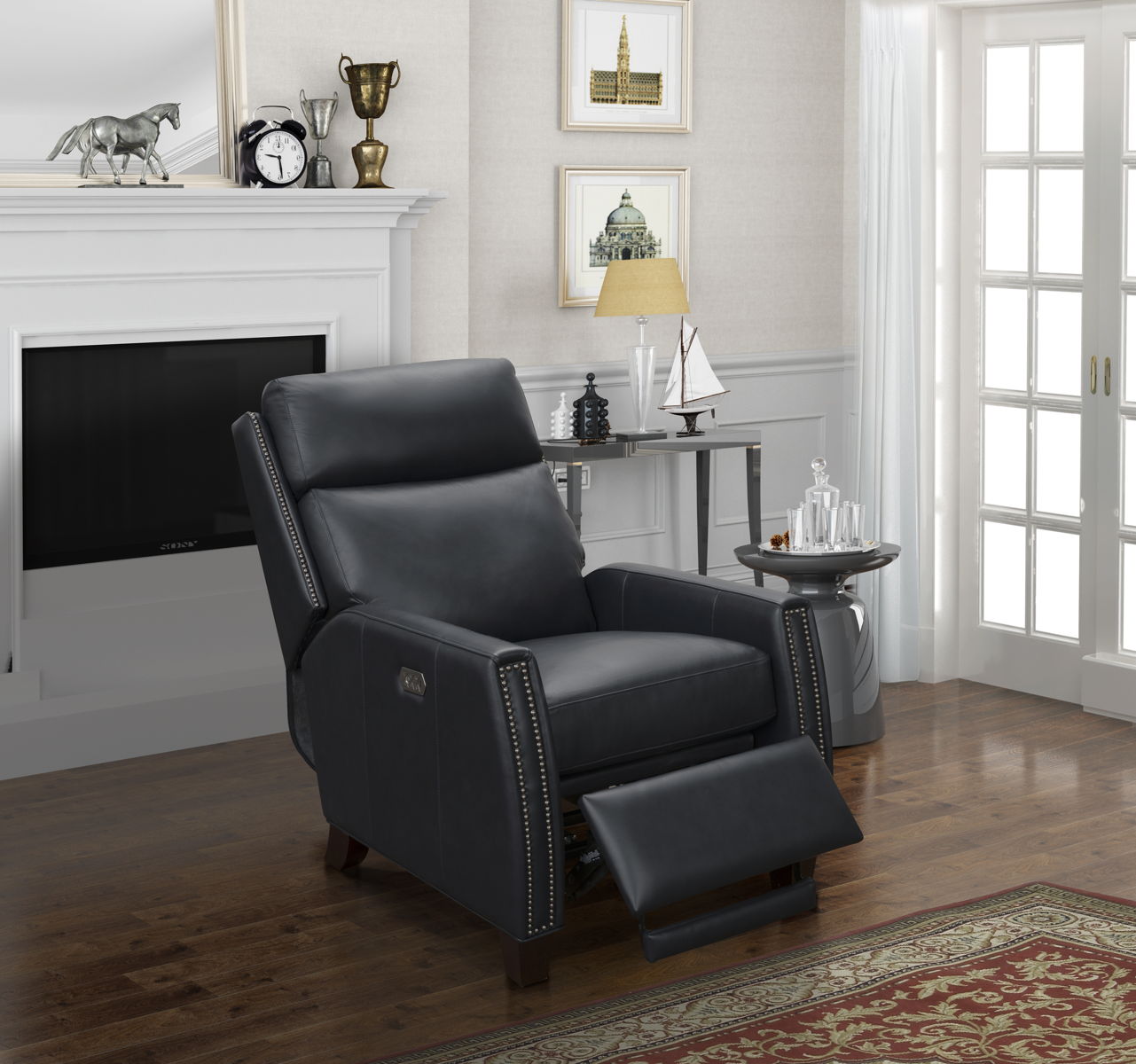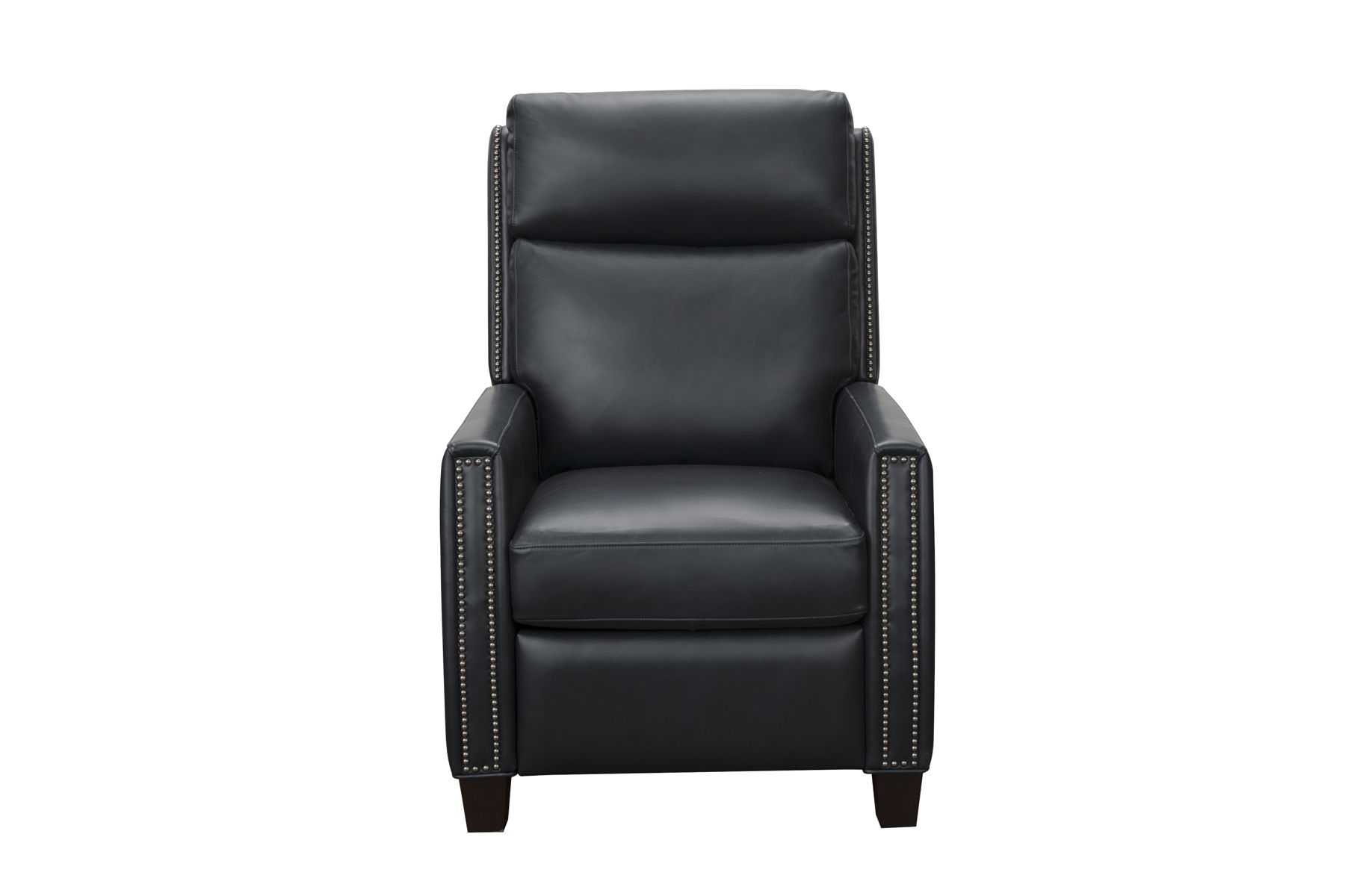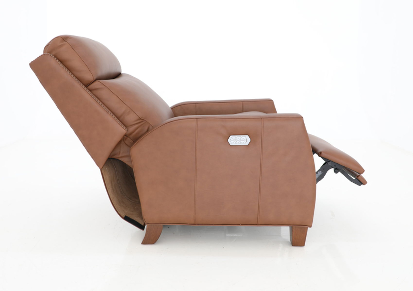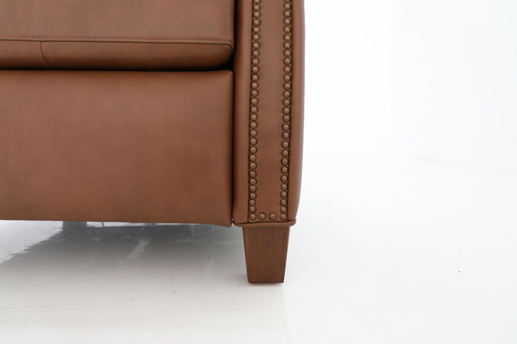 Triple Low Leg Recliner. 44.9” High Pub Back Design, Loose Welted Box Seat Cushion With Pocketed Coil Springs Encased In Foam, Wrapped In Dacron With A Feather Blend Topper, Footrest Extension, Nail Head Trim Accents, And Tapered Wood Legs Finished In A Warm Finish.