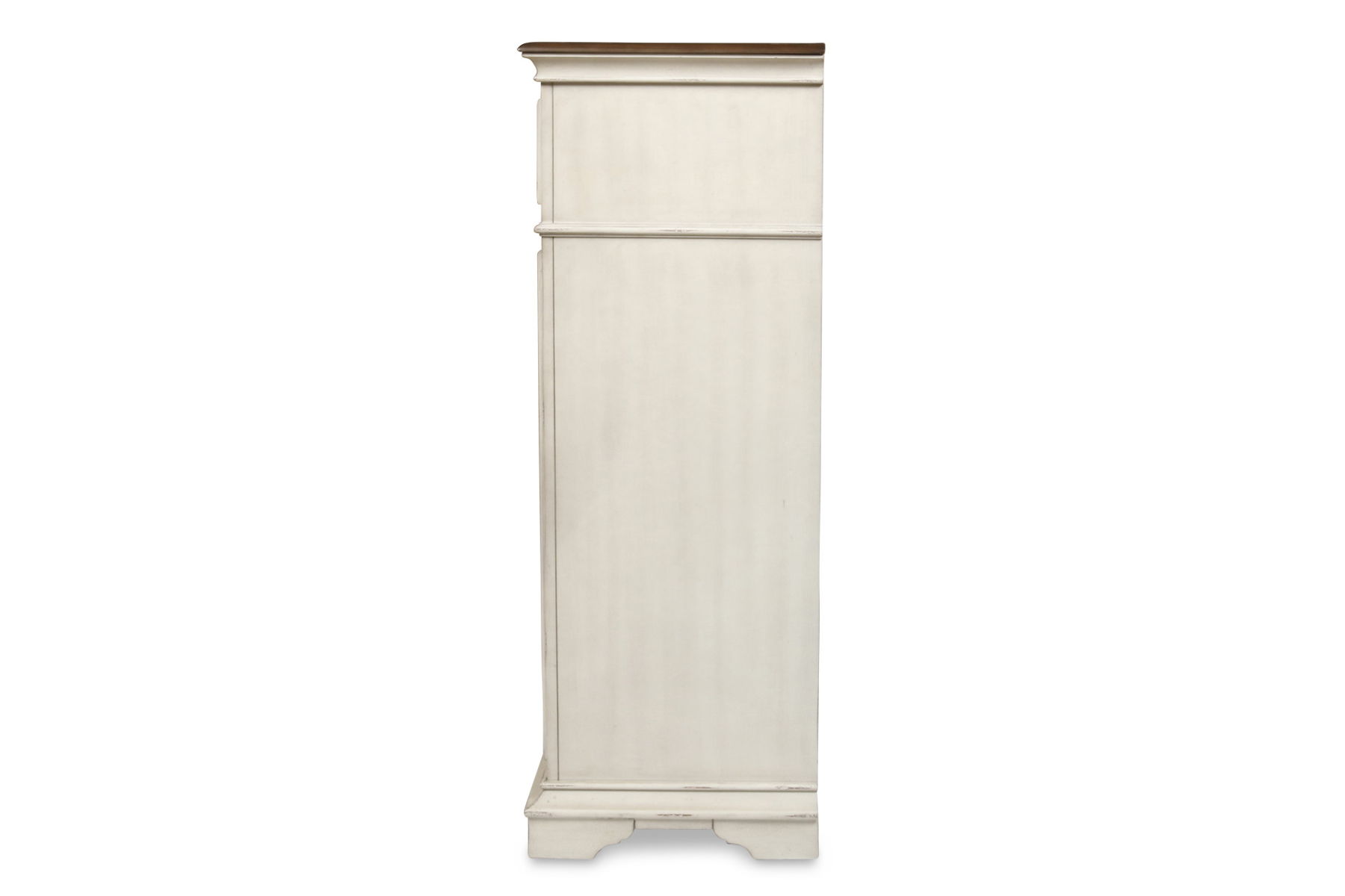 Complete your bedroom ensemble with the New Classic Furniture Anastasia 5 Drawer Chest in Antique White, a testament to real wood craftsmanship with solid poplar and oak veneer for enduring durability. The heirloom finish, achieved through a meticulous multi-step process involving wire brushing, clefts, rasping, threading, and rub throughs, grants each chest an upscale, vintage look, ensuring that no two pieces are exactly alike. The creamy off-white stain, enriched with brown and gray burnishing, radiates vintage French country cottage charm, accentuated by a rustic brown finish top that encapsulates the antique, old-world charm. The chest’s graceful composition is defined by picture frame drawer fronts, bracket feet, detailed crown molding aprons, and chamfered panel appliques, complemented by antique gold drop ball drawer pulls. Drawer operation is effortless with ball-bearing glides, providing a smooth and easy open performance. Enjoy clean and carefree storage with all drawers sanded and sealed, and top drawers lined with felt to safeguard delicates, watches, jewelry, and glasses. The bottom drawers are cedar-lined, offering a cozy haven for sweater storage. The time-tested quality is evident in the four-corner English dovetail joinery, ensuring a strong and durable piece of furniture.