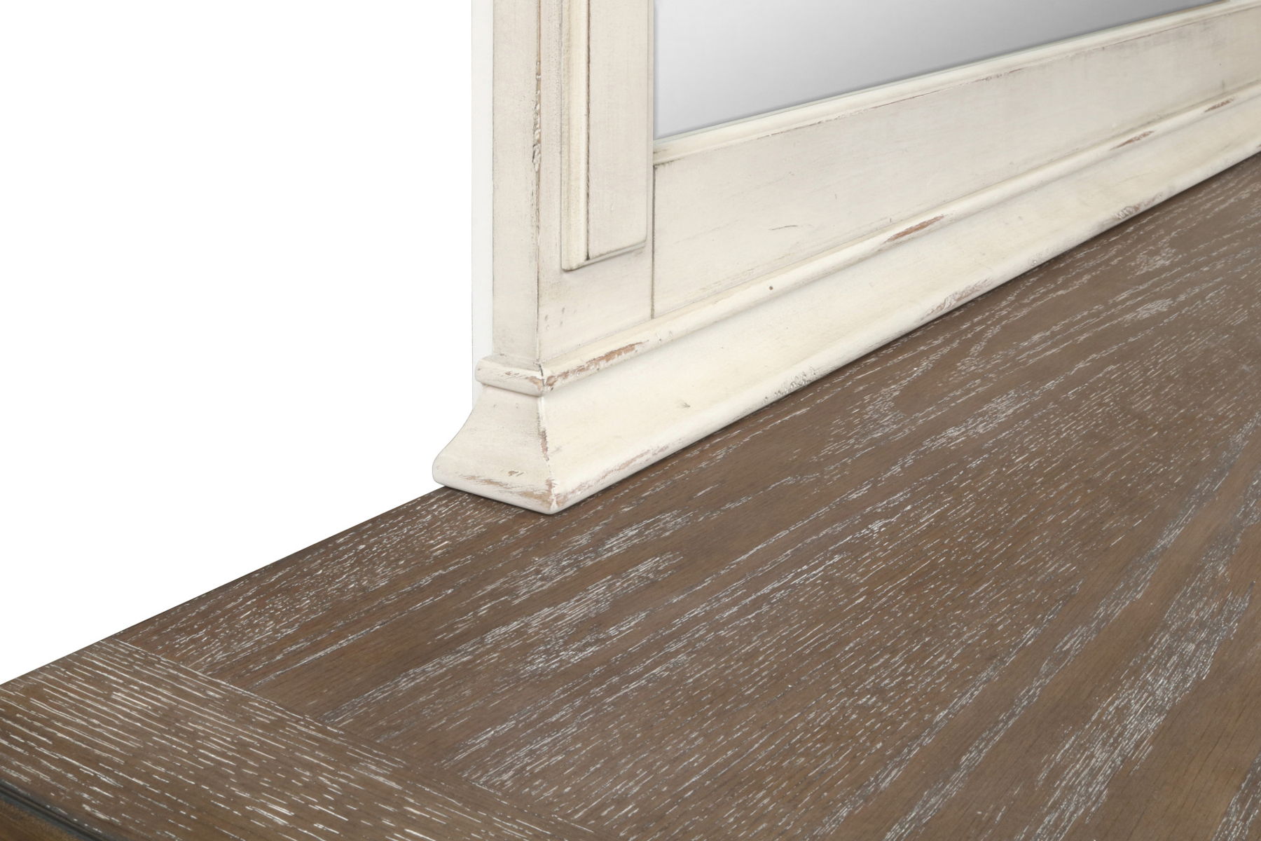 Enhance your space with the New Classic Furniture Anastasia Mirror in Antique White, a symbol of real wood craftsmanship with solid poplar and oak veneer ensuring enduring durability. The heirloom finish, achieved through a detailed multi-step process involving wire brushing, clefts, rasping, threading, and rub throughs, results in an upscale, vintage look where no two pieces are exactly alike. The creamy off-white stain, enriched with brown and gray burnishing, exudes vintage French country cottage charm. The mirror features a graceful composition with gently shaped moldings and chamfered panel appliques framing the low-distortion beveled glass, creating an aesthetically pleasing focal point.