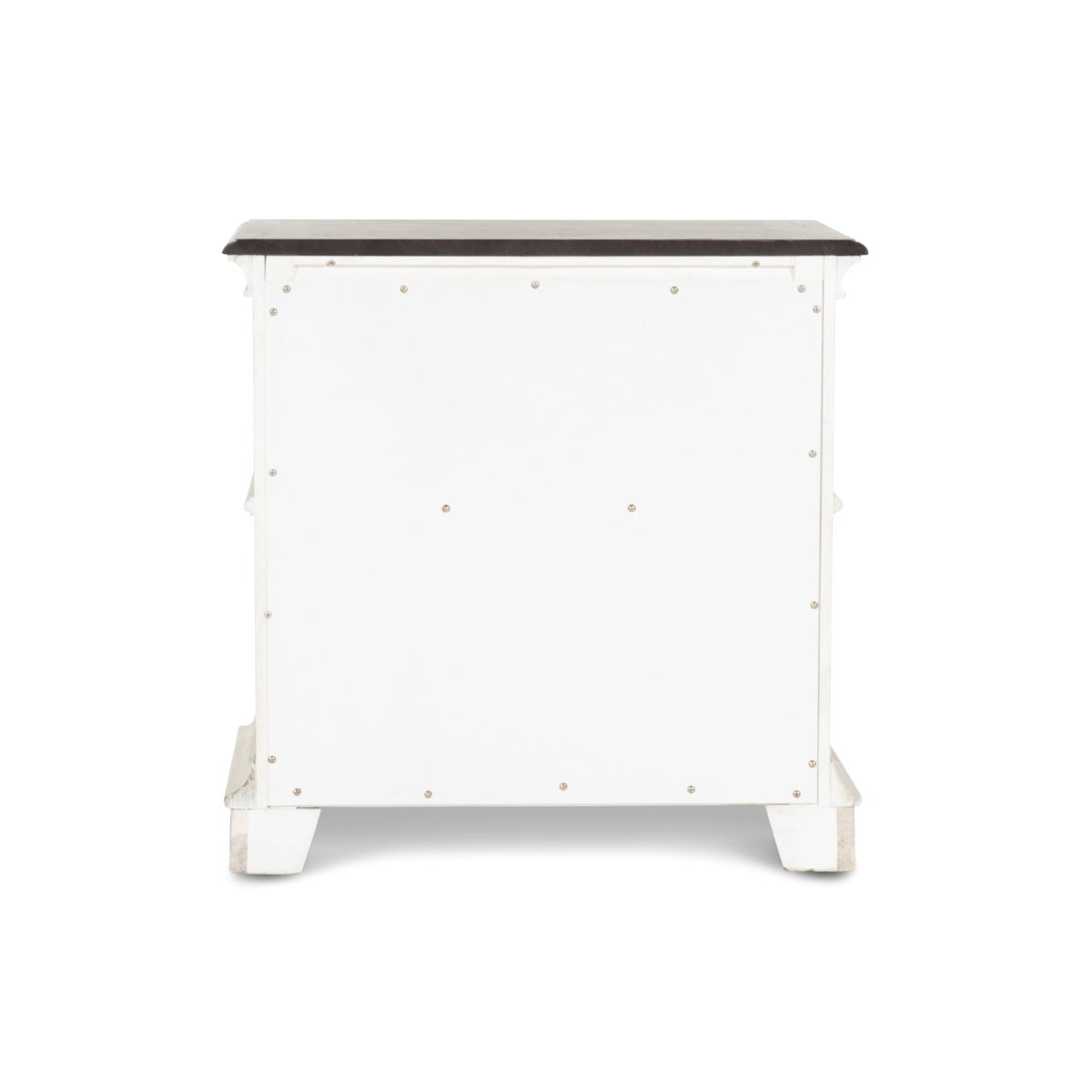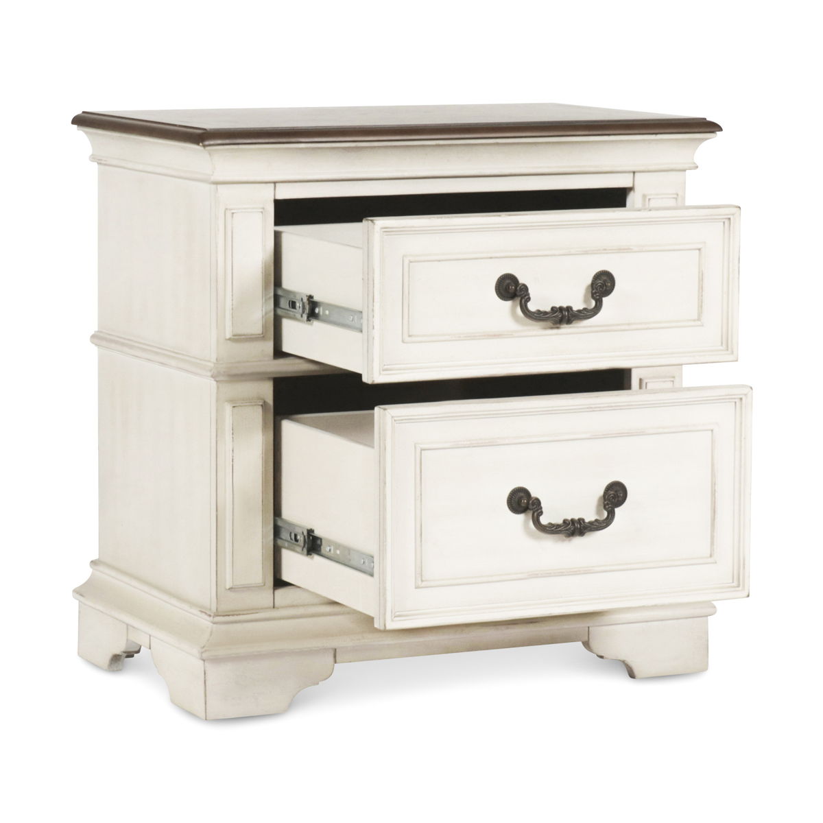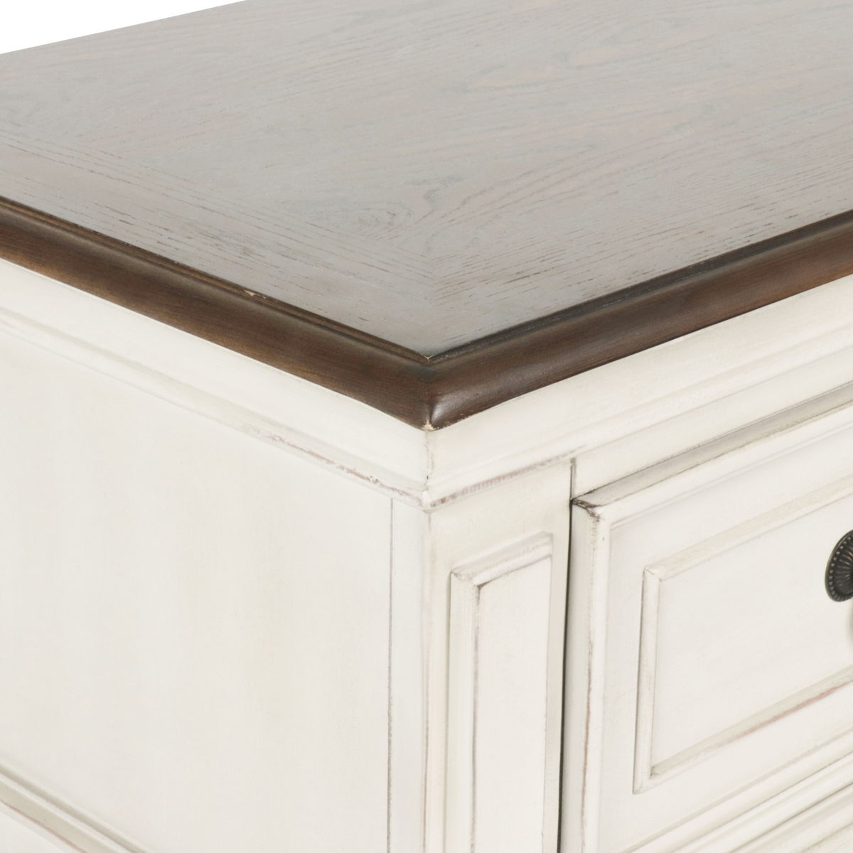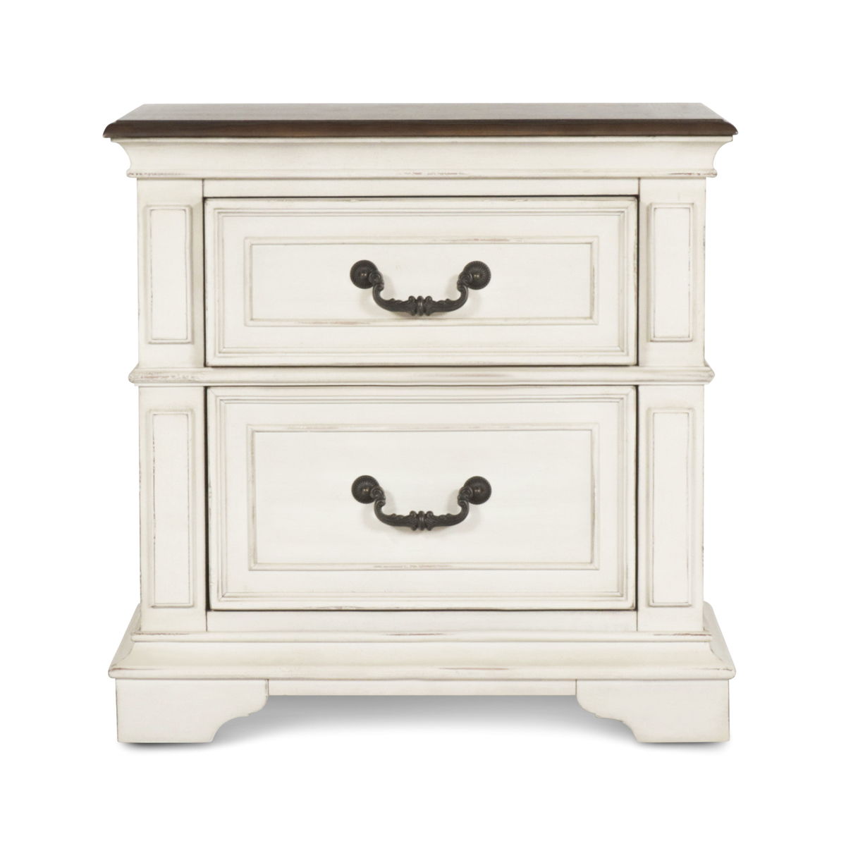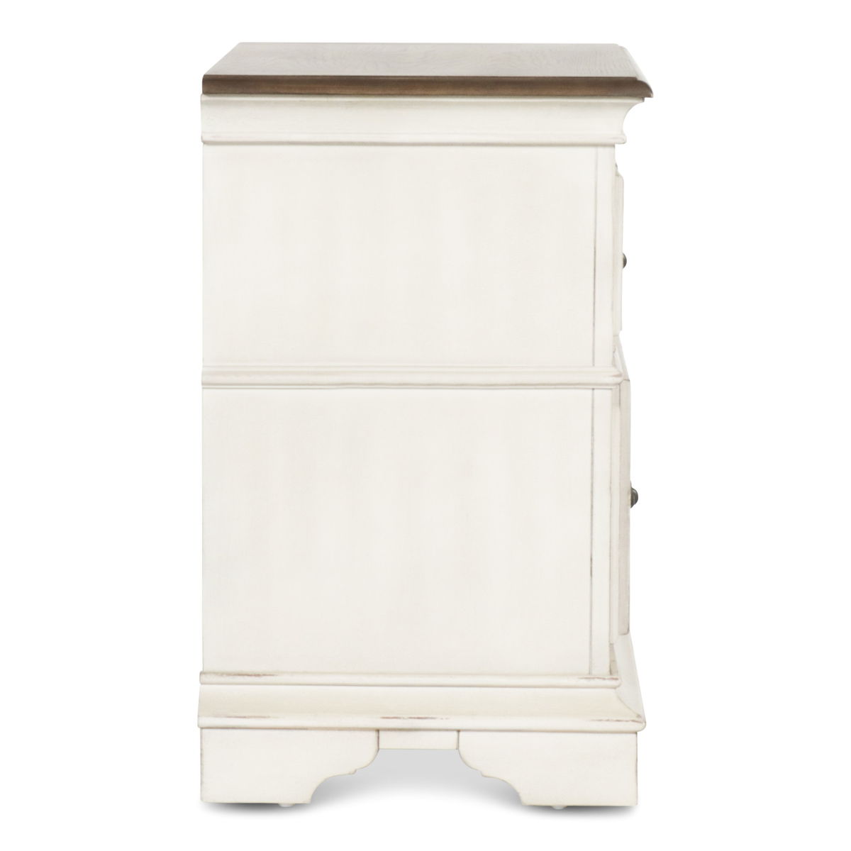 Complete your bedroom ensemble with the New Classic Furniture Anastasia 2 Drawer Nightstand. Crafted with real wood construction from solid poplar and oak veneer, this nightstand ensures long-lasting durability. The heirloom finish, achieved through a multi-step process involving wire brushing, clefts, rasping, threading, and rub throughs, delivers an upscale, vintage look where no two pieces are alike. The creamy off-white stain, enhanced with brown and gray burnishing, exudes vintage French country cottage charm, accentuated by a rustic brown finish top for an antique, old-world appeal. The graceful composition includes picture frame drawer fronts, bracket feet, detailed crown molding aprons, and chamfered panel appliques, adorned with antique gold drop ball drawer pulls. Effortless drawer operation with ball bearing glides ensures smooth and easy access. The nightstand offers clean and carefree storage with sanded and sealed drawers, and the top drawer is lined with felt to protect delicate items. Time-tested quality is evident in the four-corner English dovetail joinery, providing a strong and durable piece of furniture. Rest easy knowing that this nightstand complies with safety standards, offering a secure and stylish addition to your bedroom. With a 1-year limited warranty, it’s a practical and charming choice for your nighttime essentials.