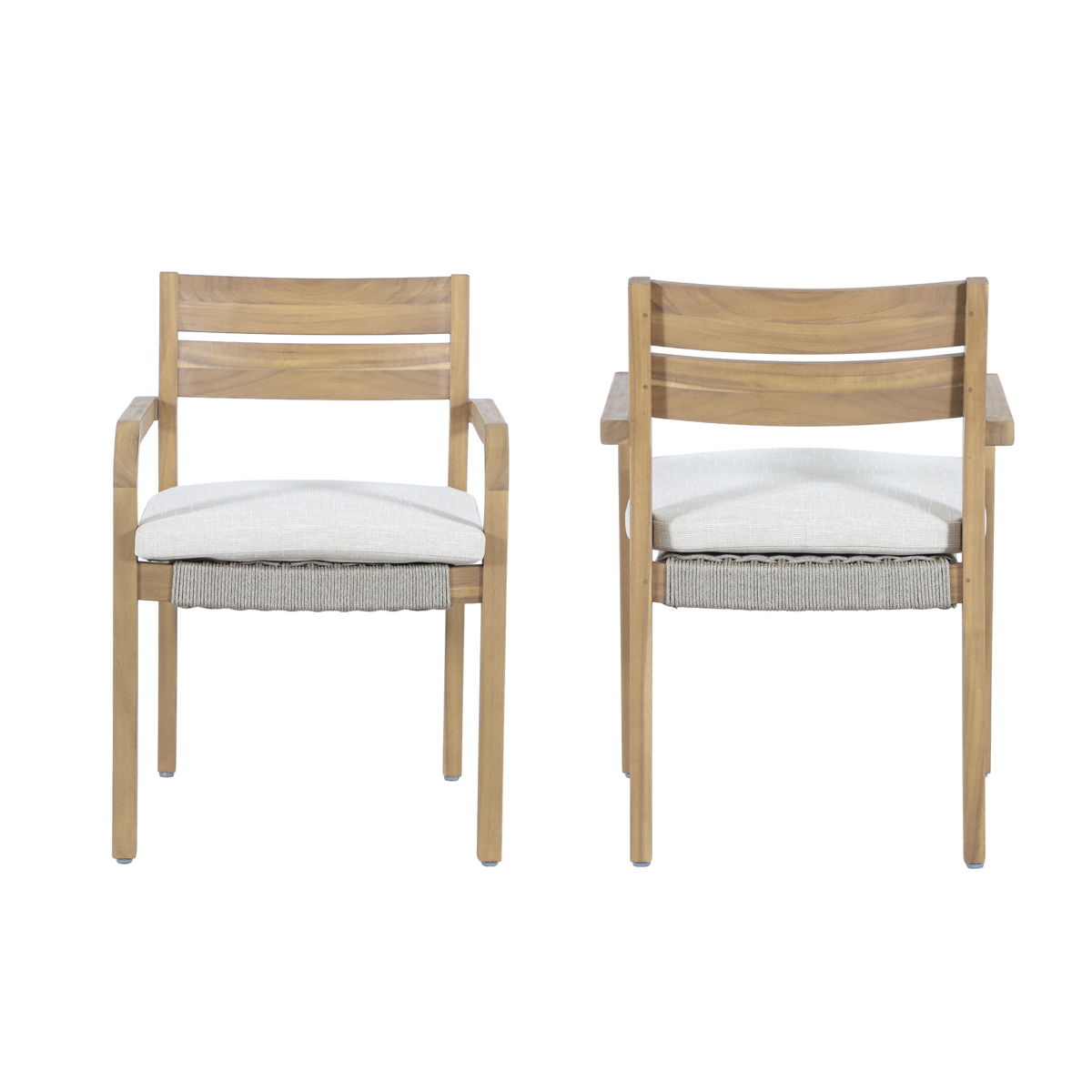 The Arden Dining Chair combines a solid Acacia wood frame with woven wicker backrests and cushioned seating for comfort and durability. Designed to resist outdoor elements, the all-weather wicker maintains its beauty while the padded cushions provide supportive seating. Ergonomic curved backs encourage relaxation, making these chairs perfect for long meals or casual gatherings. Stylish and functional, the Arden dining chairs complement the matching table and elevate outdoor dining spaces.