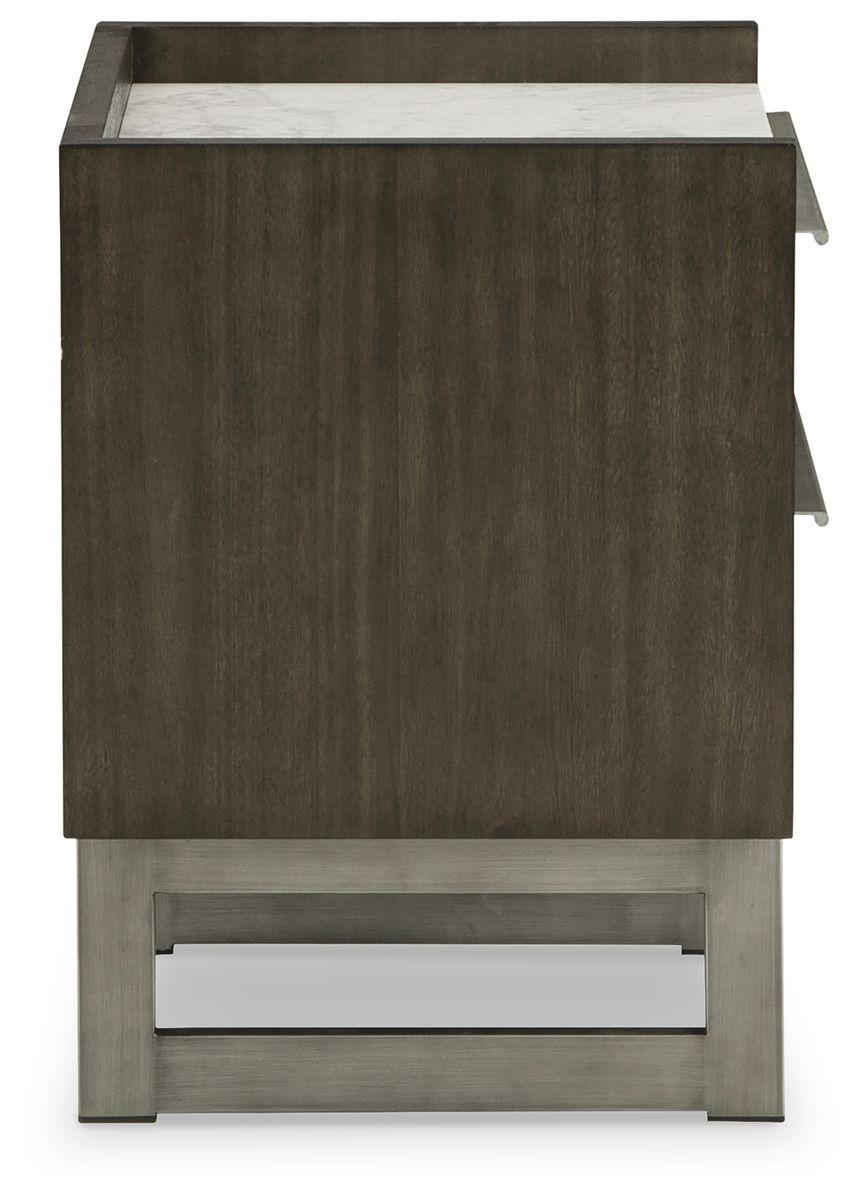 Clean lines lend sophistication and structure to this nightstand. Its complex rich grayish brown finish contrasts perfectly with a white marble top, while the streamlined silhouette features overlay slats to create visual interest. A metal base and bar pulls in a low-sheen steel finish add to this piece’s contemporary vibe.