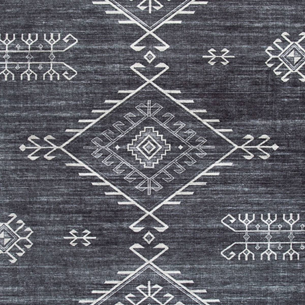 Drawing on Southwestern weaving motifs, this area rug features a repeating pattern with geometric borders. Its distressed design provides a distinctive look and feel for interiors ranging from modern contemporary to boho chic. A low pile height makes it ideal for high-traffic spaces. Rug is machine washable for fuss-free cleaning.