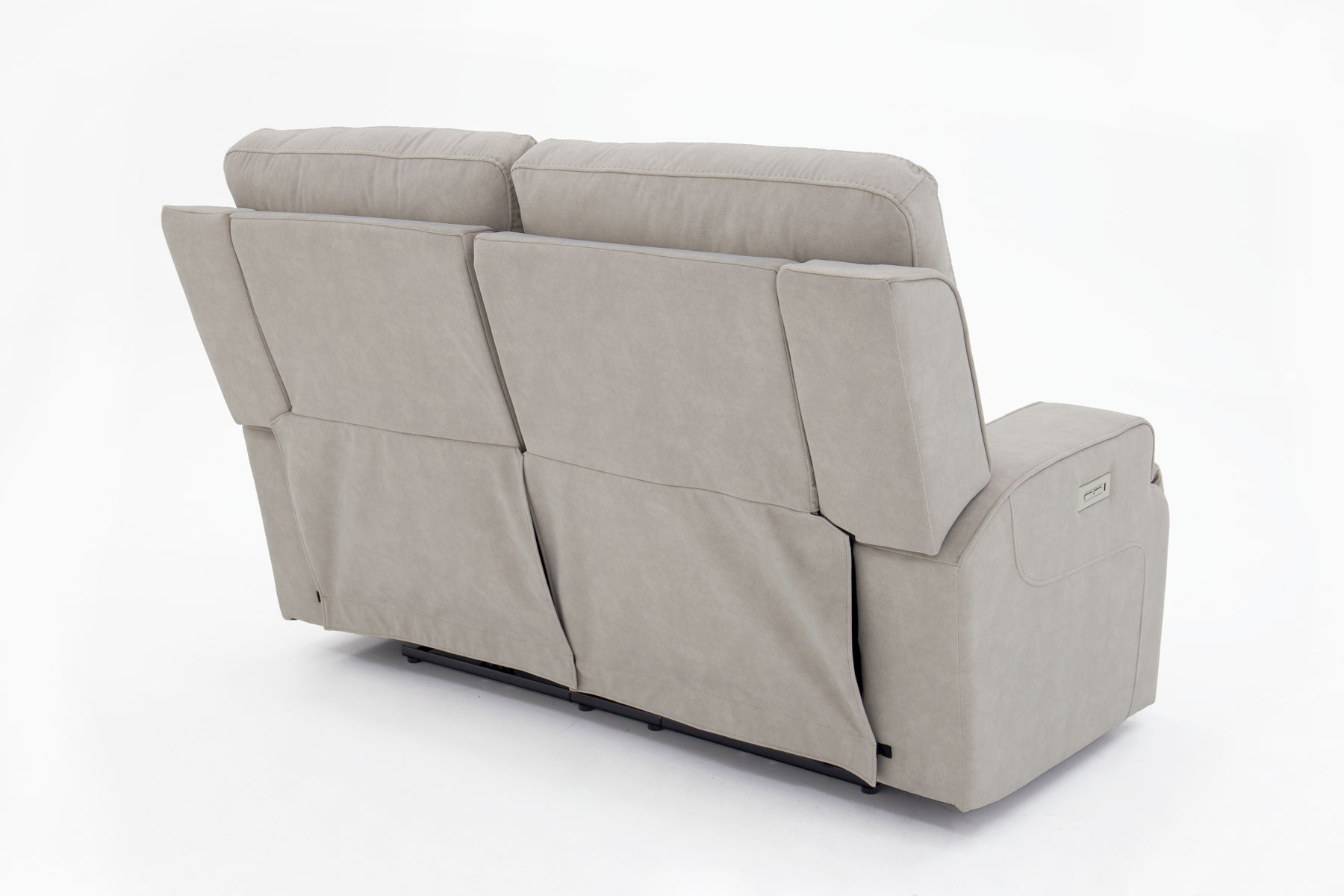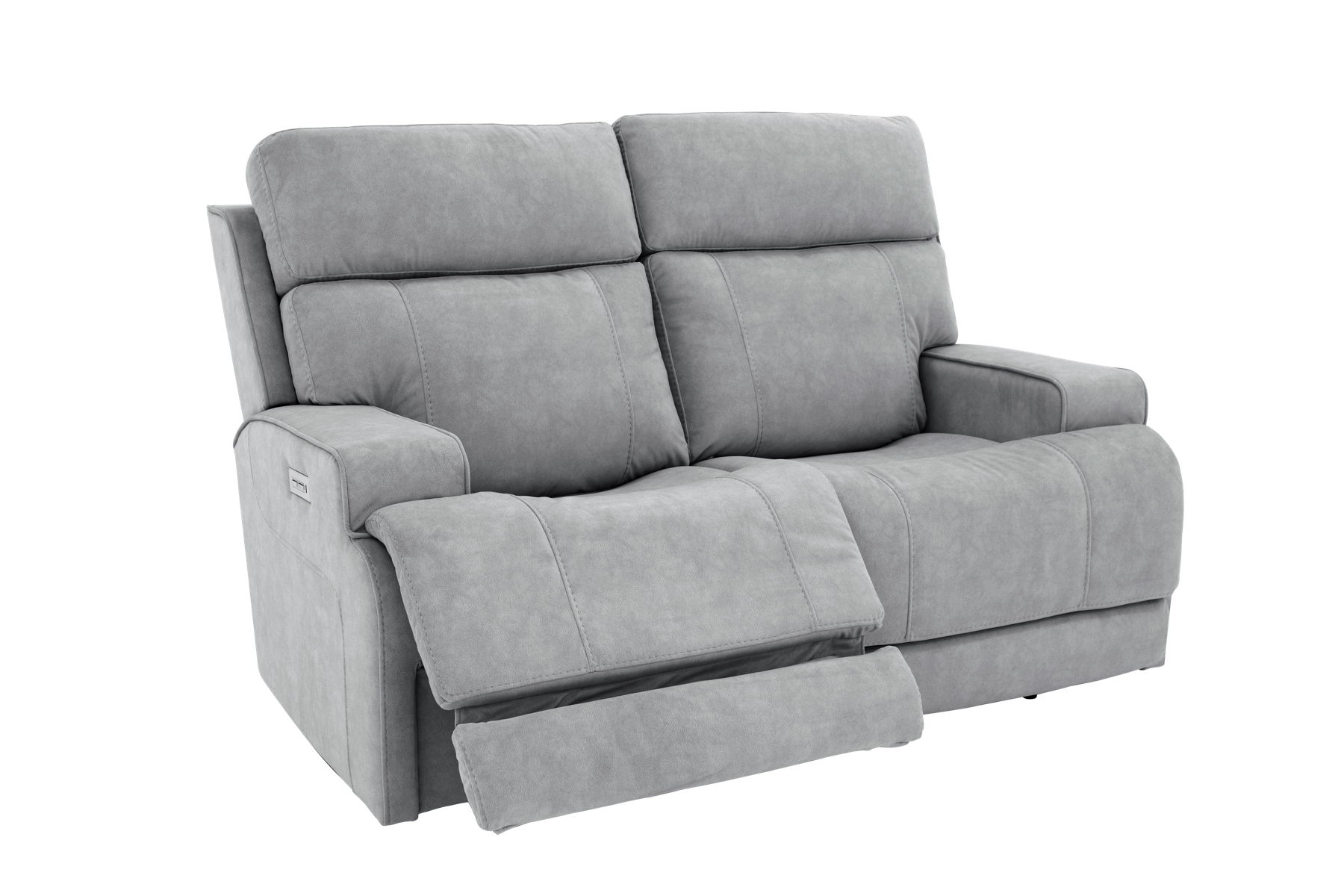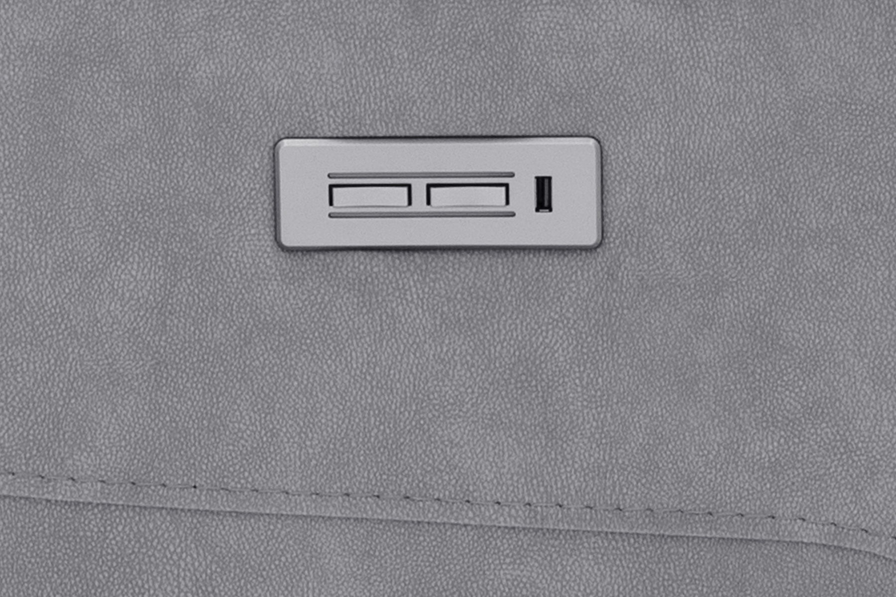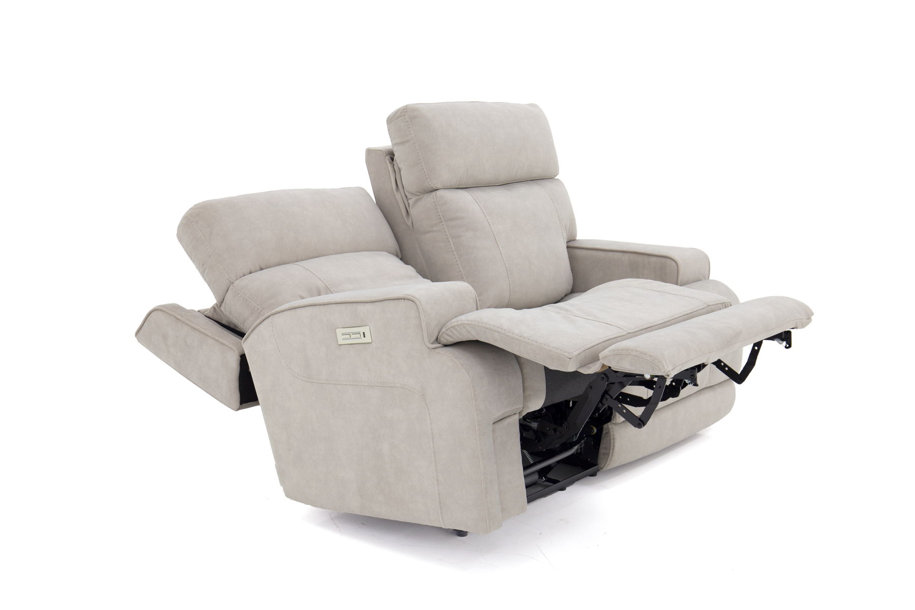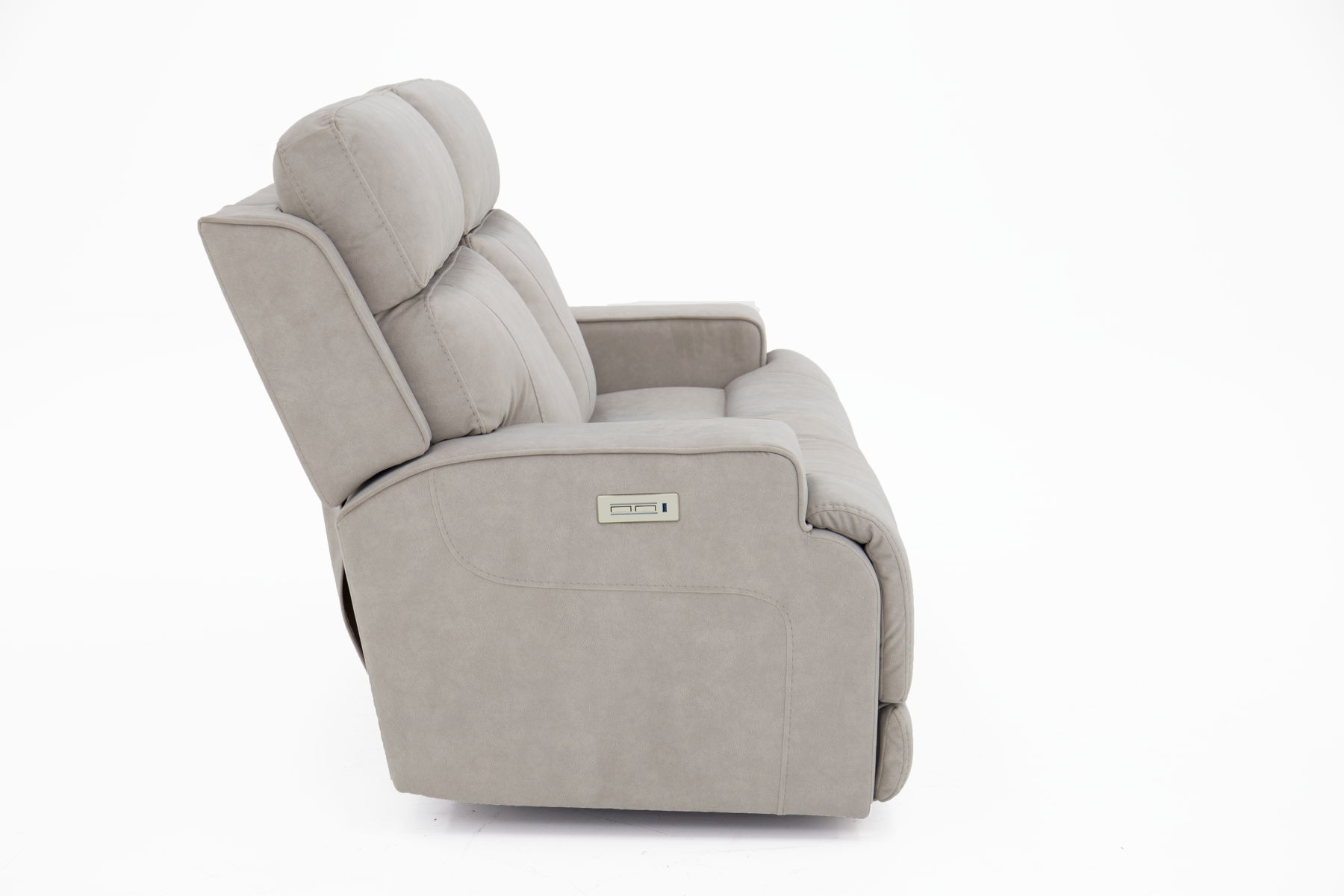 Contemporary Zero Gravity reclining sofa group. Features 89.5” power reclining sofa with zero gravity mechanism, steel seat box, power headrest, 3” footrest extension, side control panel with all close button and USB port. The group has bucketed pad over chaise pocketed coil seating, 42.5” high split pub back with power headrest, and plush welted track arms. Matching loveseat and recliner available. Only offered in fabric.