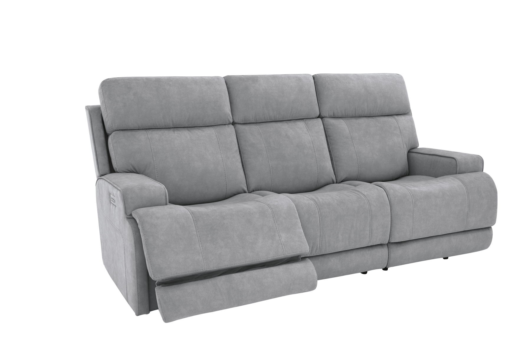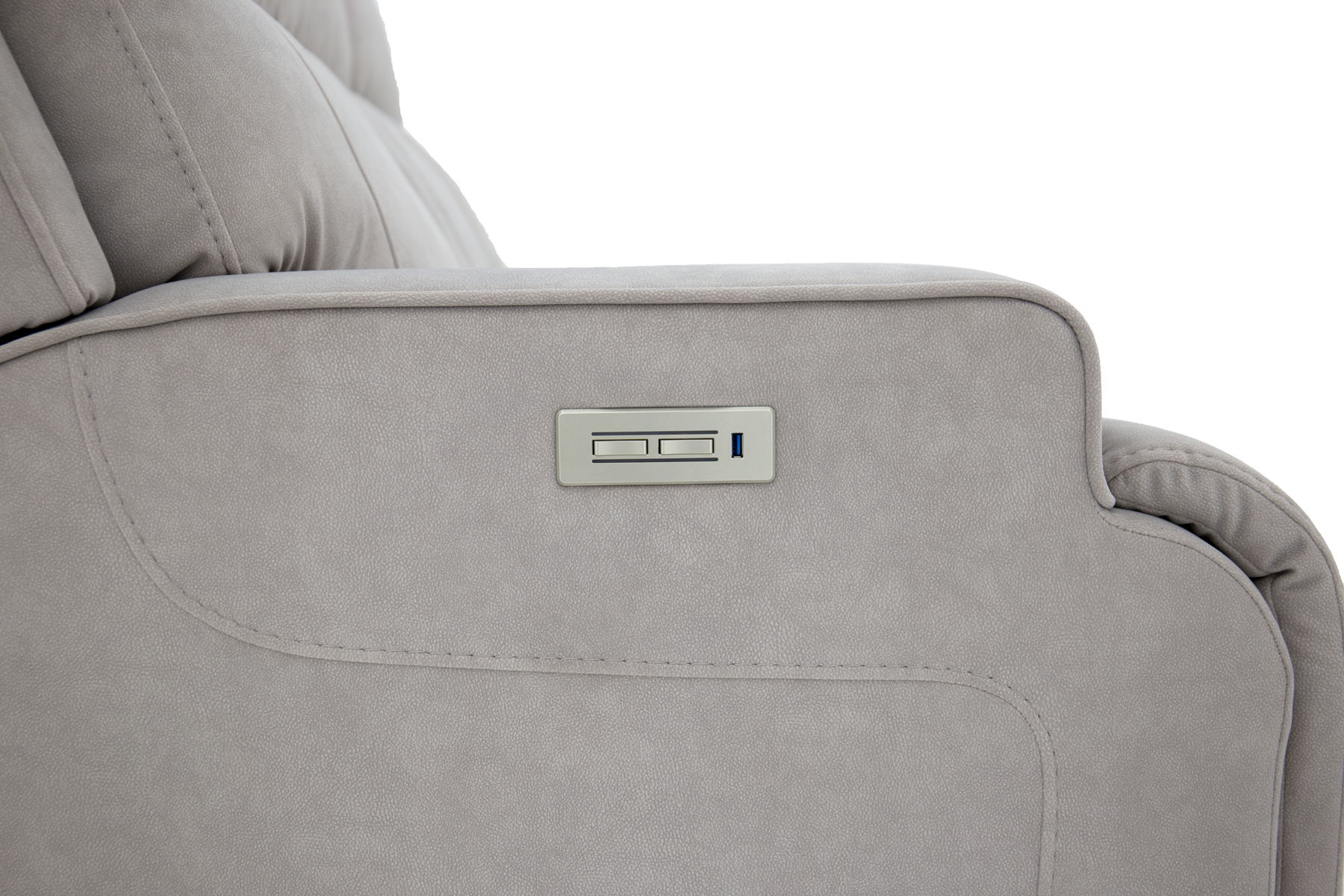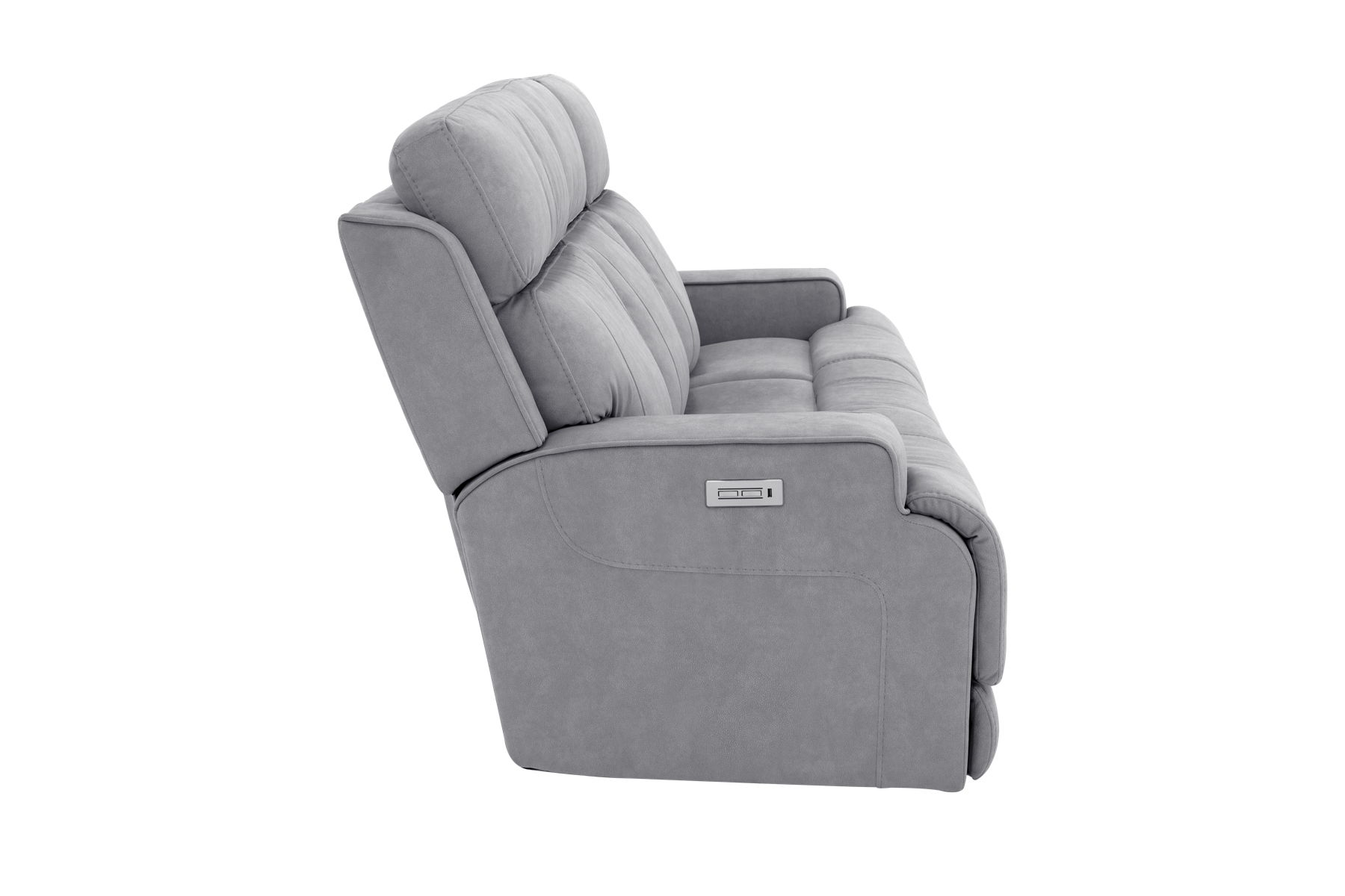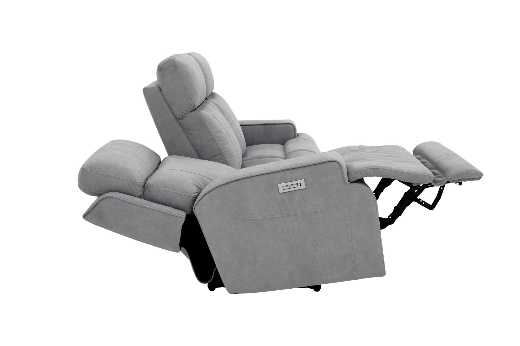 Contemporary Zero Gravity reclining sofa group. Features 89.5” power reclining sofa with zero gravity mechanism, steel seat box, power headrest, 3” footrest extension, side control panel with all close button and USB port. The group has bucketed pad over chaise pocketed coil seating, 42.5” high split pub back with power headrest, and plush welted track arms. Matching loveseat and recliner available. Only offered in fabric.