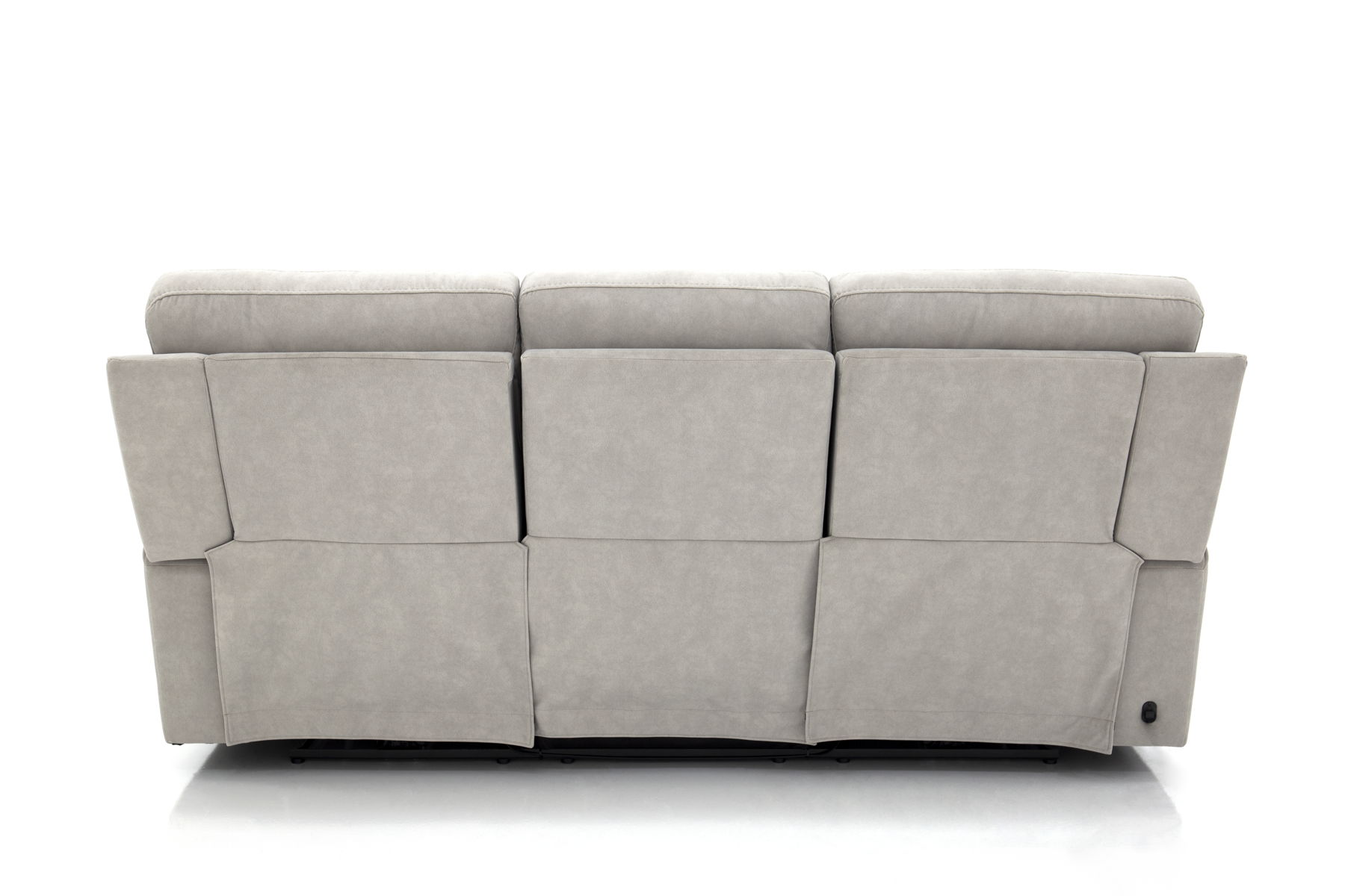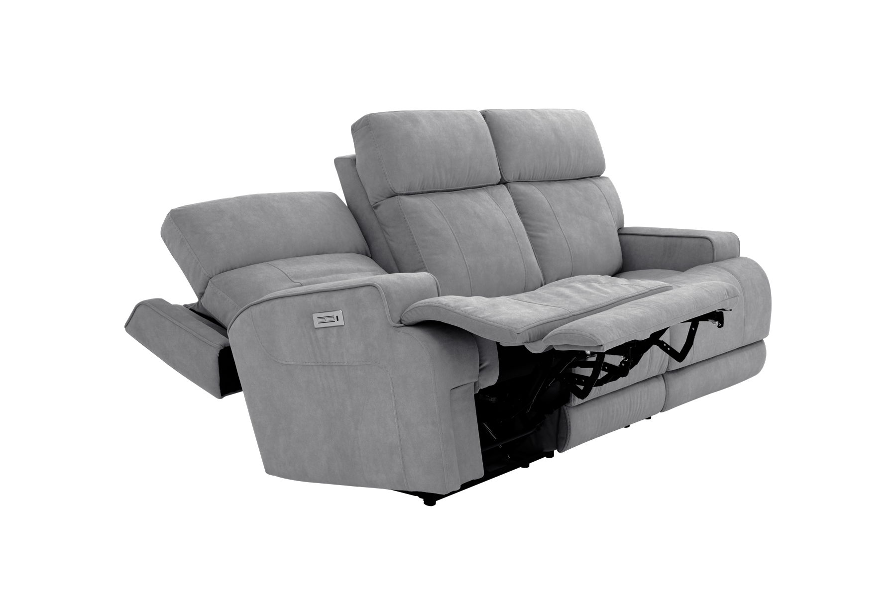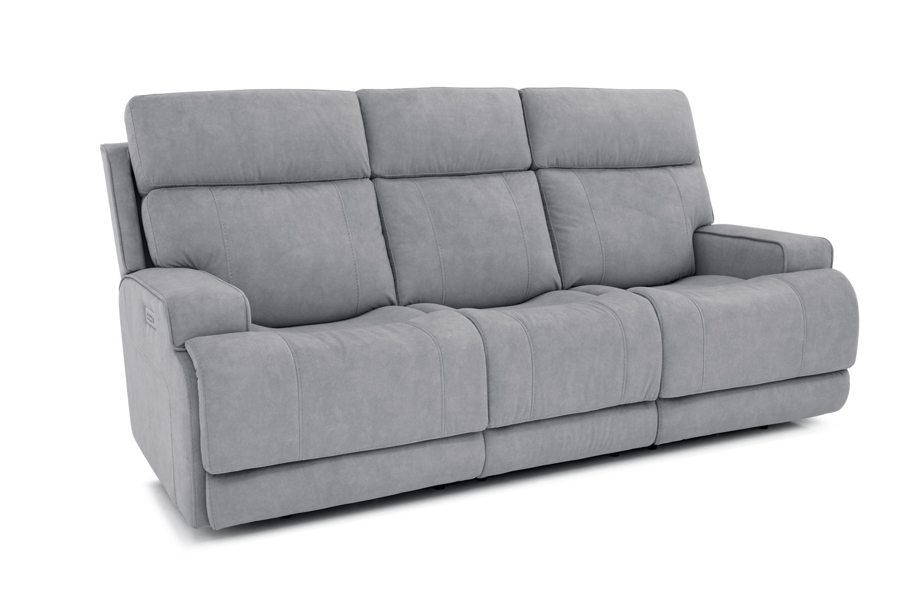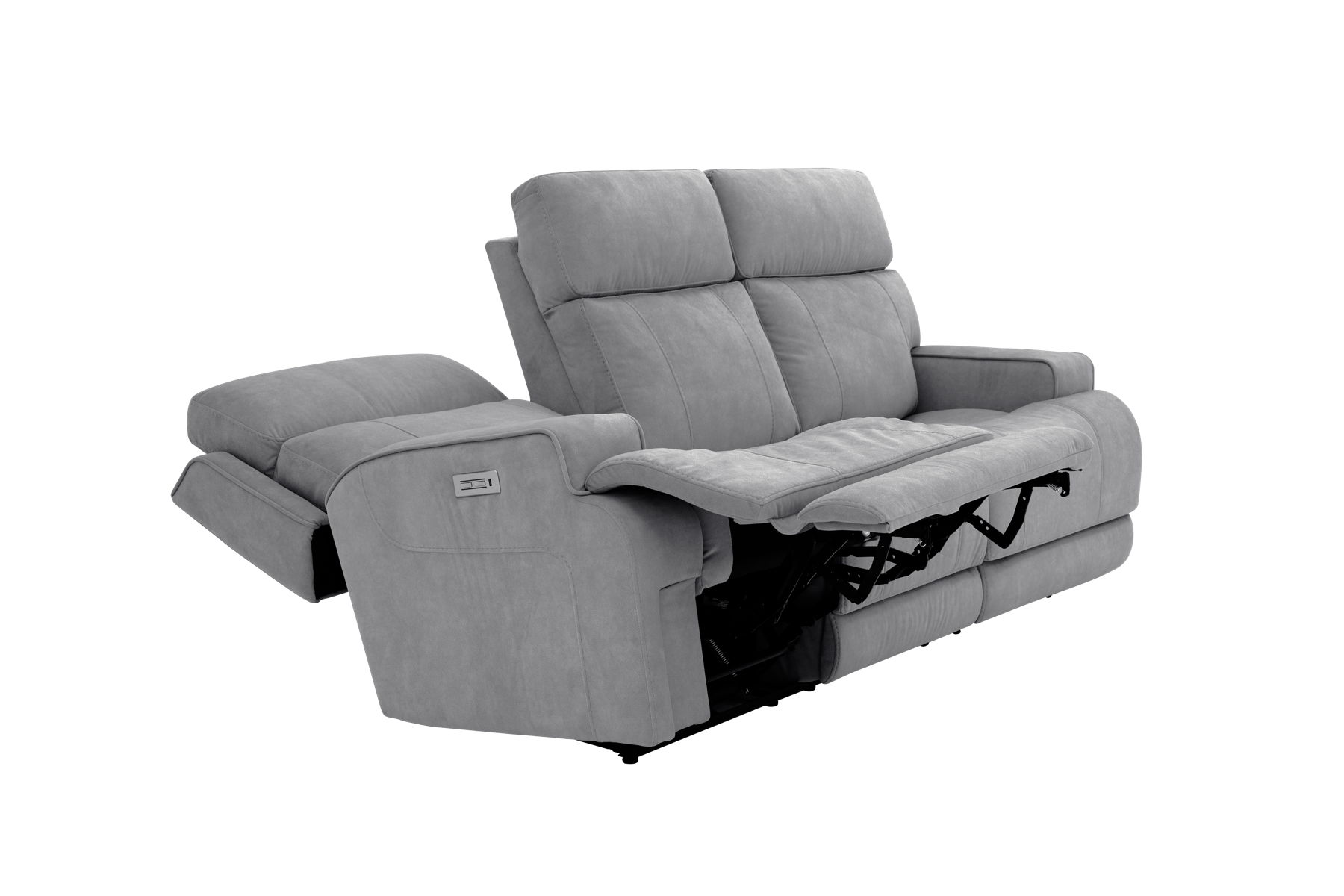 Contemporary Zero Gravity reclining sofa group. Features 89.5” power reclining sofa with zero gravity mechanism, steel seat box, power headrest, 3” footrest extension, side control panel with all close button and USB port. The group has bucketed pad over chaise pocketed coil seating, 42.5” high split pub back with power headrest, and plush welted track arms. Matching loveseat and recliner available. Only offered in fabric.
