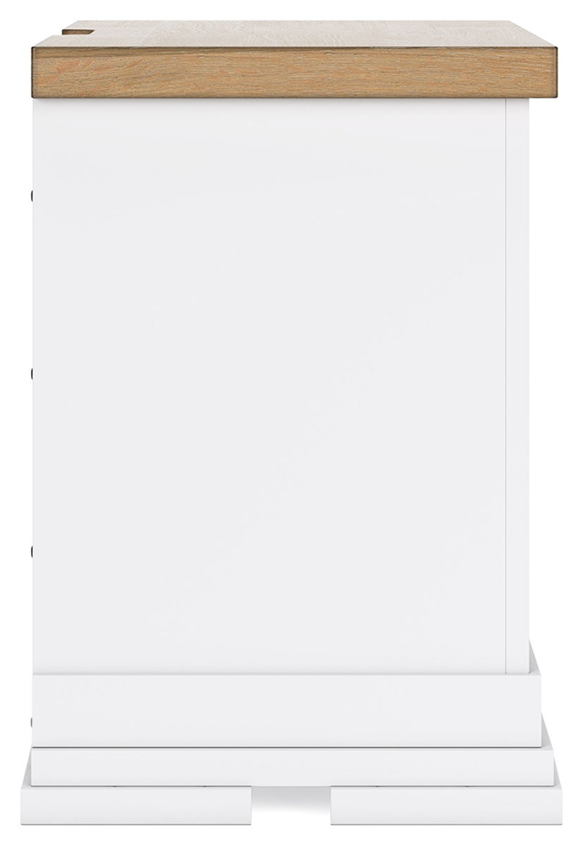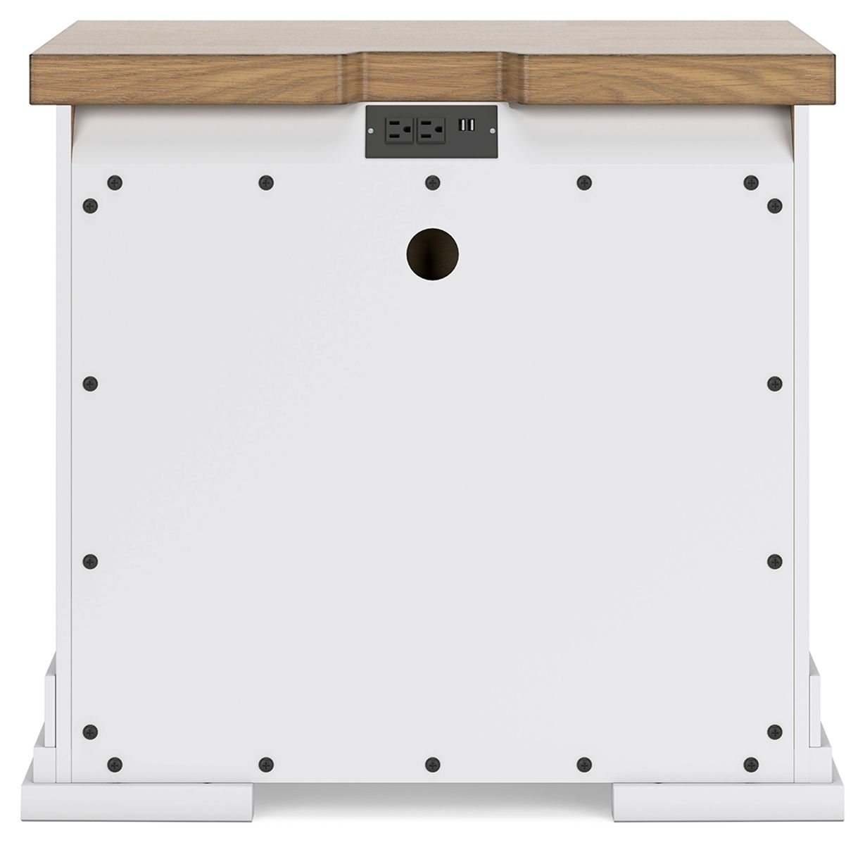 Casual style with substance. This two-tone nightstand raises the bar on comfortably cozy design in your soothing sanctuary. A sturdy silhouette with a classic white finish and black metal hardware exudes modern farmhouse vibes. The butcher block oak veneer top adds a relaxed aesthetic. And bedside charging for your go-to devices is made easy with power outlets and USB ports.