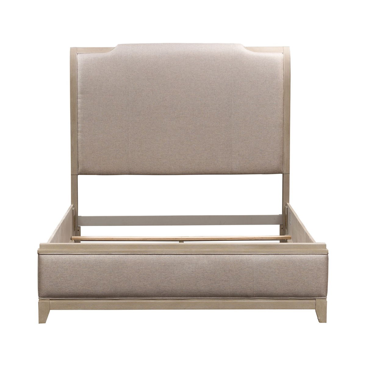 Invite this luxurious Belmar upholstered bed into your bedroom. Crafted with rubberwood solids and split heart oak veneers. The rolled top center with a wood frame and wood top footboard are upholstered in knubby linen that combines beautifully. Never question the reliability of the bed due to the bolt-on rails and center supported slat system.