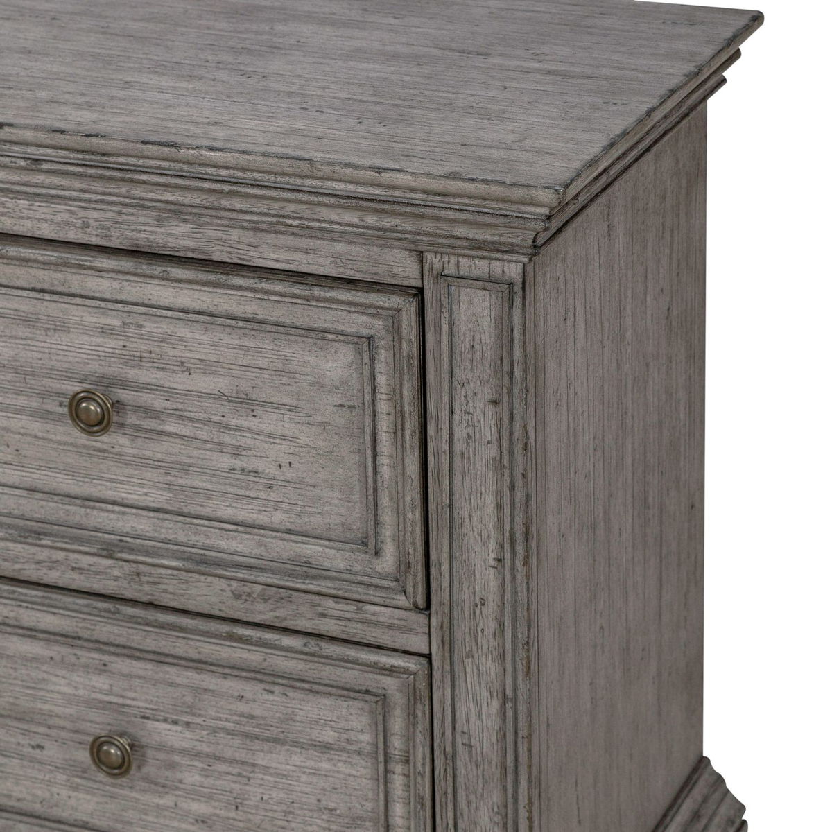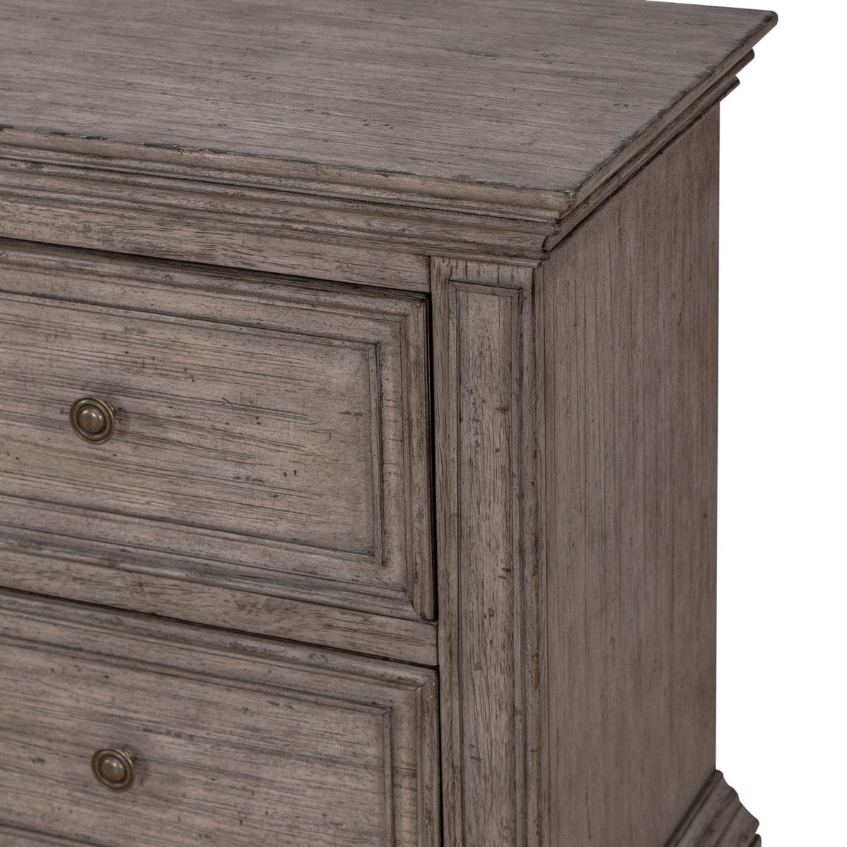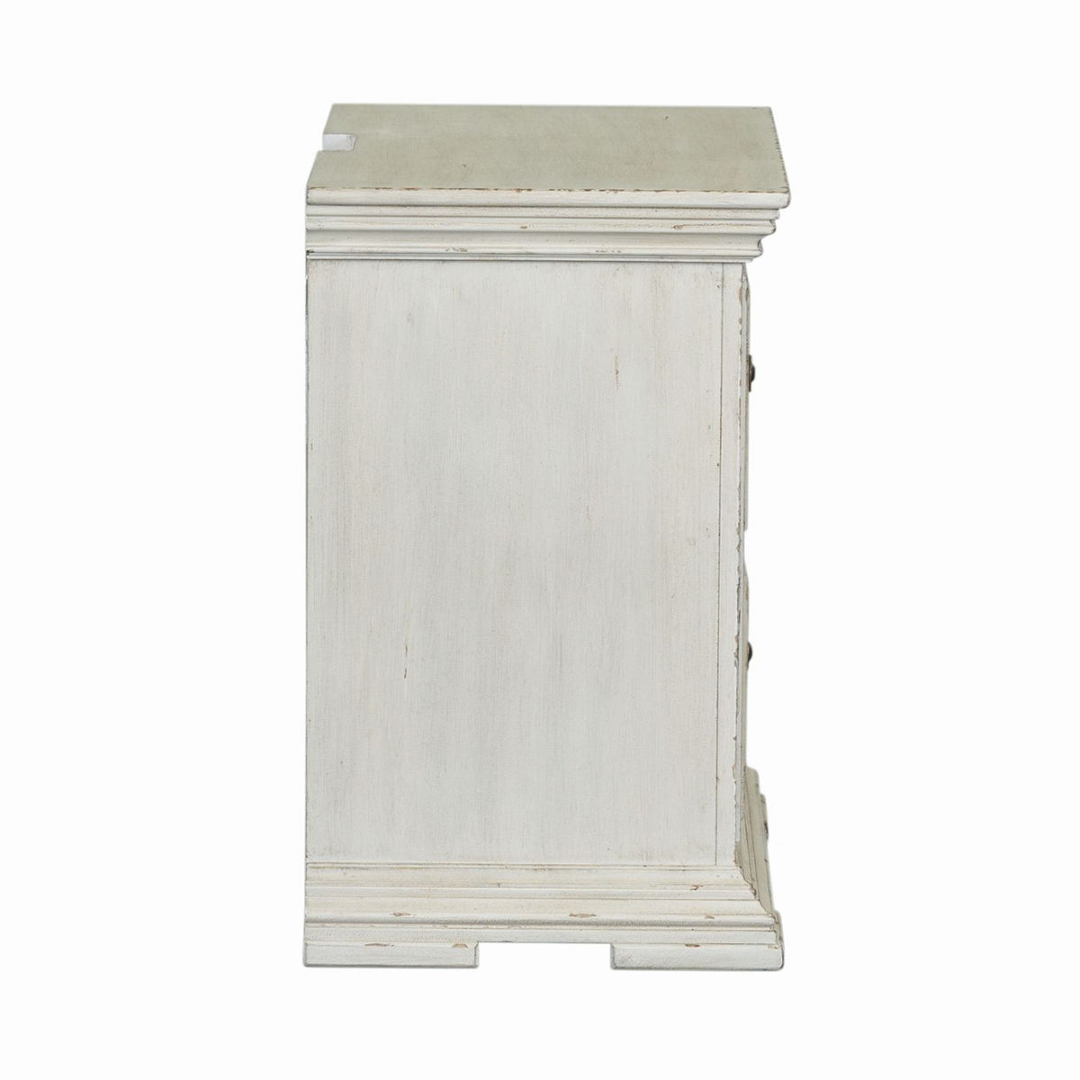 This unique 2 drawer night stand is the perfect way to accent your room with traditional living design. Accompanied by heavy distressing creates a truly unique look. Crafted with rubberwood solids and birch veneers, this night stand features fully stained interior drawers, premium felt lined top drawers and bottom case proofing, tied together effortlessly with antique pewter knob hardware. With today’s electronics in mind, this piece includes a charging stations for user convenience.