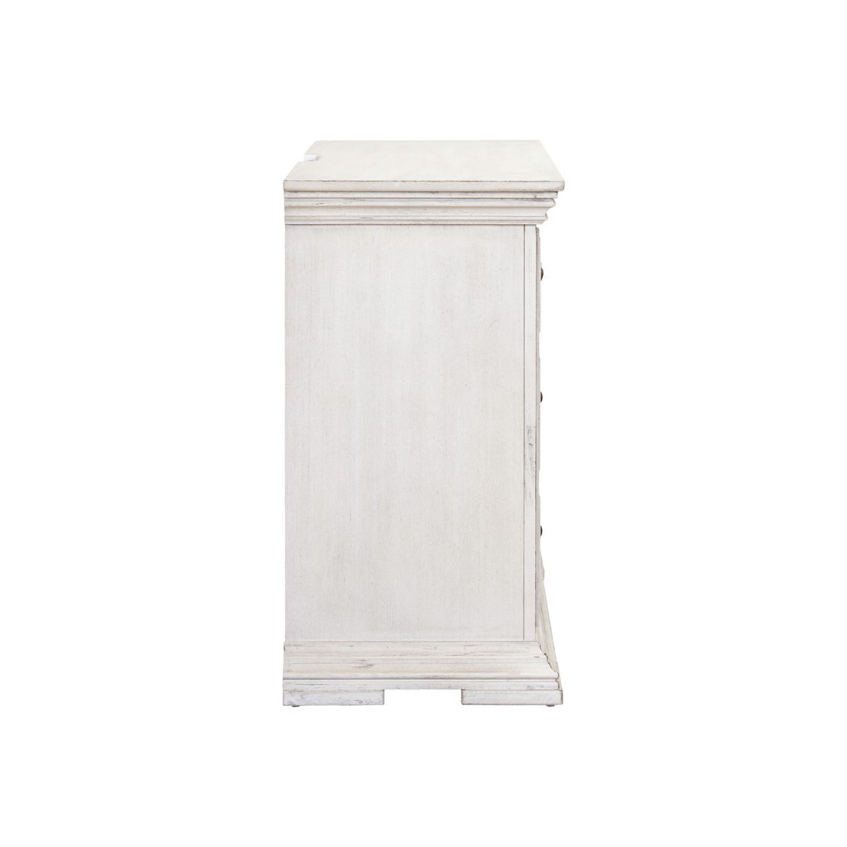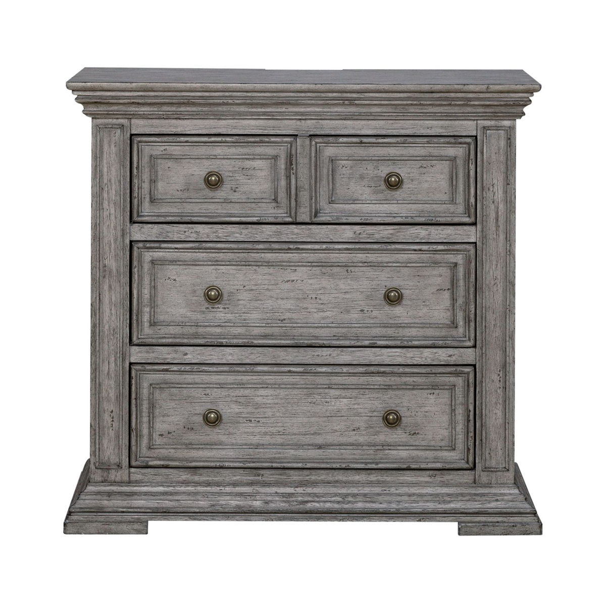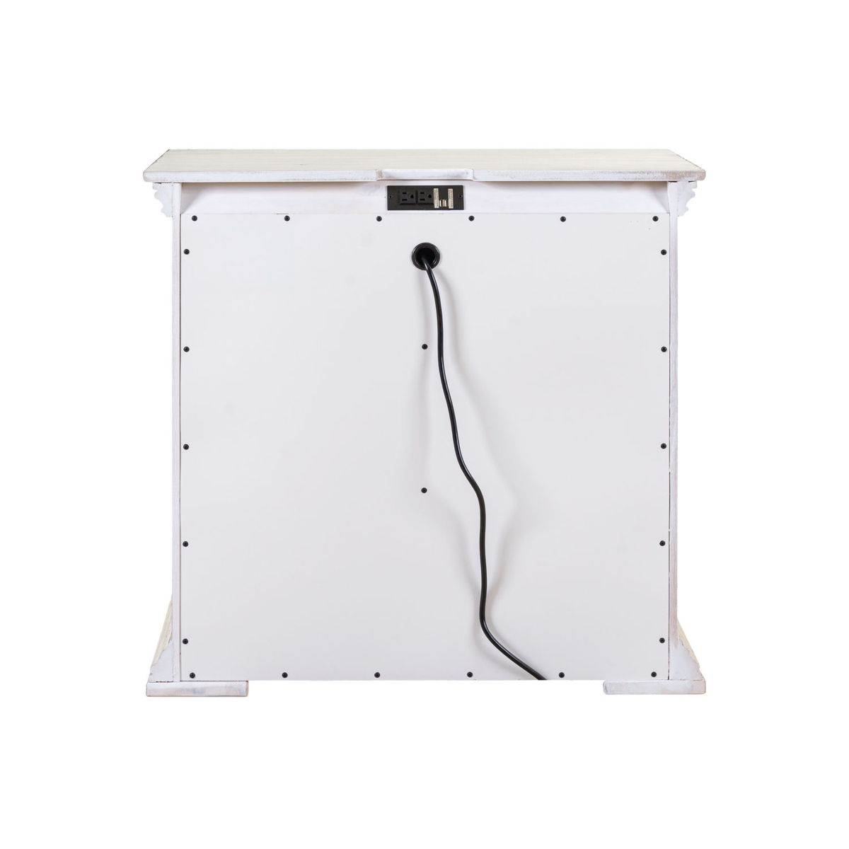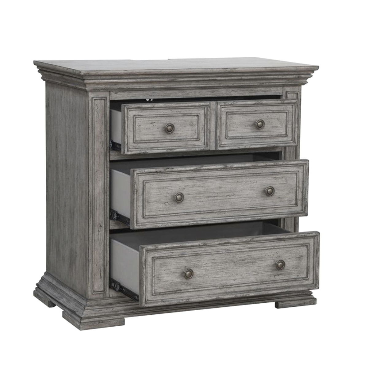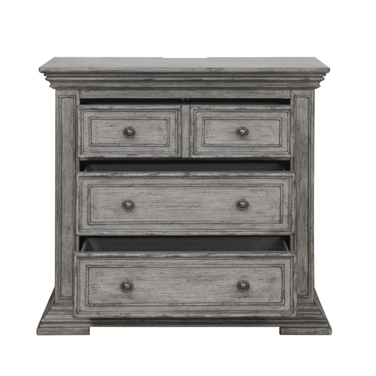 Incorporate this traditional, large scale bedside chest into your bedroom. The finish features heavy distressing, characterized by warm and intricate details. Enjoy the convenience of having a built-in charging station in the back of the night stand, featuring two USB ports and two outlets. The wood framed drawer fronts and block feet complete this traditional look, combing for a grand feel of the past with today’s luxurious lifestyle.