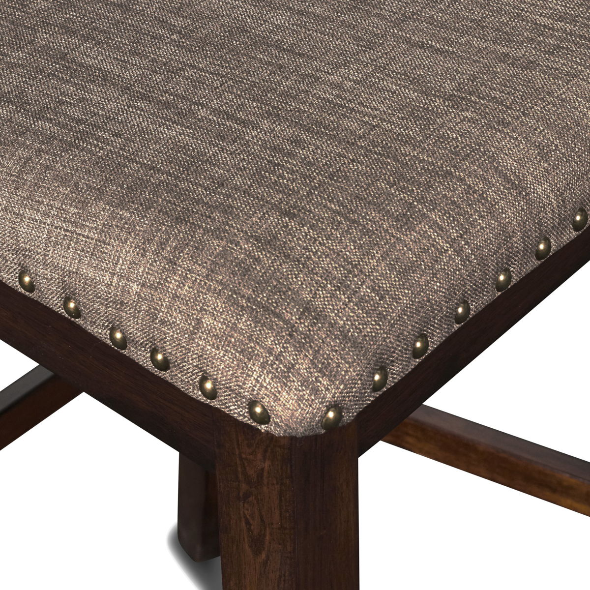 The Bixby Wood Splat Back Counter Height Chairs, available as a set of two, blend traditional elegance with modern functionality, making them a perfect addition to any dining area. Expertly crafted from solid Rubberwood, these chairs are designed for durability while highlighting the timeless beauty of natural wood. The rich espresso cherry finish, meticulously applied through a multi-step process, enhances the natural grain of the wood and adds a subtle, sophisticated sheen. Featuring a splatted back with a gracefully curved top rail and artfully fanned vertical slats, these chairs effortlessly complement both formal and casual dining settings. The high-density foam cushions ensure exceptional comfort, while the easy-care 100% polyester upholstery offers durability and practicality. Brass nailhead trim adds a touch of refined craftsmanship, making these chairs a stylish and functional choice for your dining space or kitchen counters.