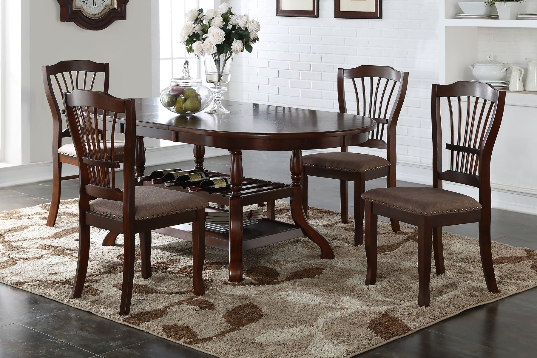 The Bixby Wood Dining Room Set is designed for those who appreciate a blend of classic style and practical functionality. Crafted from solid Rubberwood and real wood veneers, this set promises long-lasting durability while showcasing the natural beauty of wood. The rich finish, hand-applied in multiple steps, enhances the grain”s character and adds a sophisticated touch. The oval dining table, with its elegant turned pedestal base and integrated wine rack, is both a visual and functional centerpiece, making it suitable for both formal dining areas and cozy kitchen spaces. The table extends from 42″ to a generous 60″ with the included 18″ leaf, accommodating up to six guests, perfect for both intimate family meals and larger gatherings. The accompanying chairs, featuring splatted backs and high-density foam cushions, offer comfort and style, highlighted by brass nailhead trim. This set not only serves as a practical dining solution but also adds timeless charm to any home, making it an excellent choice for those looking to invest in a versatile and enduring dining set.