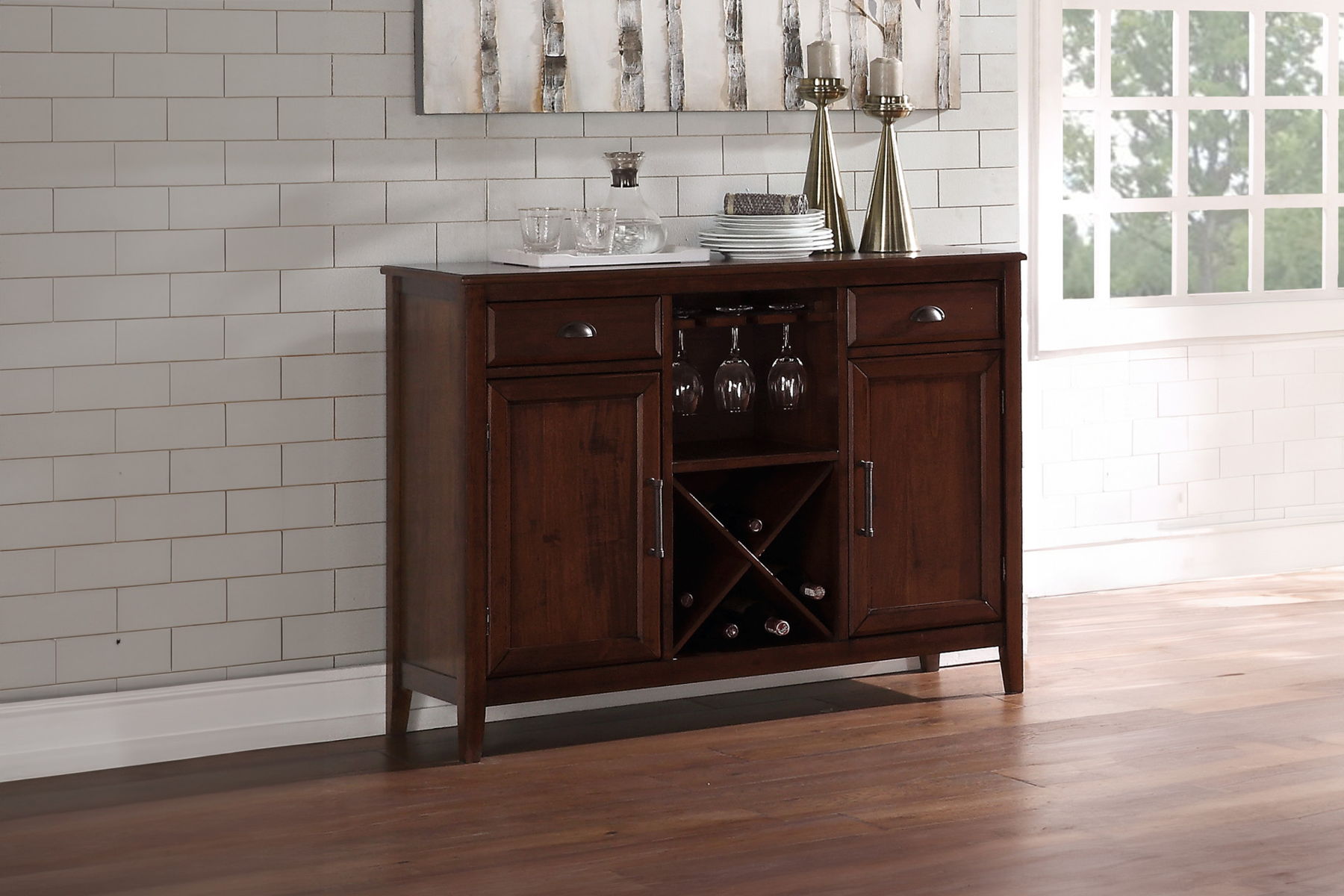 The Bixby Dining Server/Buffet Chest in Espresso is a versatile and stylish addition to any dining or entertaining space. Expertly crafted from solid Rubberwood, manufactured woods, and real wood veneers, this server is built to last while preserving the timeless beauty of natural wood. The rich espresso cherry finish, meticulously applied in a multi-step process, accentuates the wood’s natural grain and adds a subtle, sophisticated sheen. This sideboard is designed with both functionality and aesthetic appeal in mind, offering ample storage space with a built-in stemware holder and wine cubby, making it easy to keep your dining essentials organized and accessible. Whether used for everyday storage or as an elegant centerpiece during gatherings, this buffet chest combines practicality with a refined look that enhances any space.