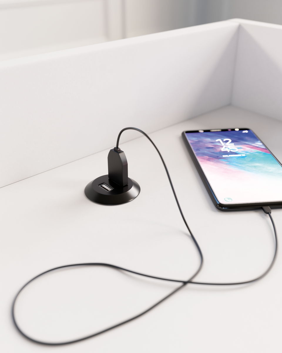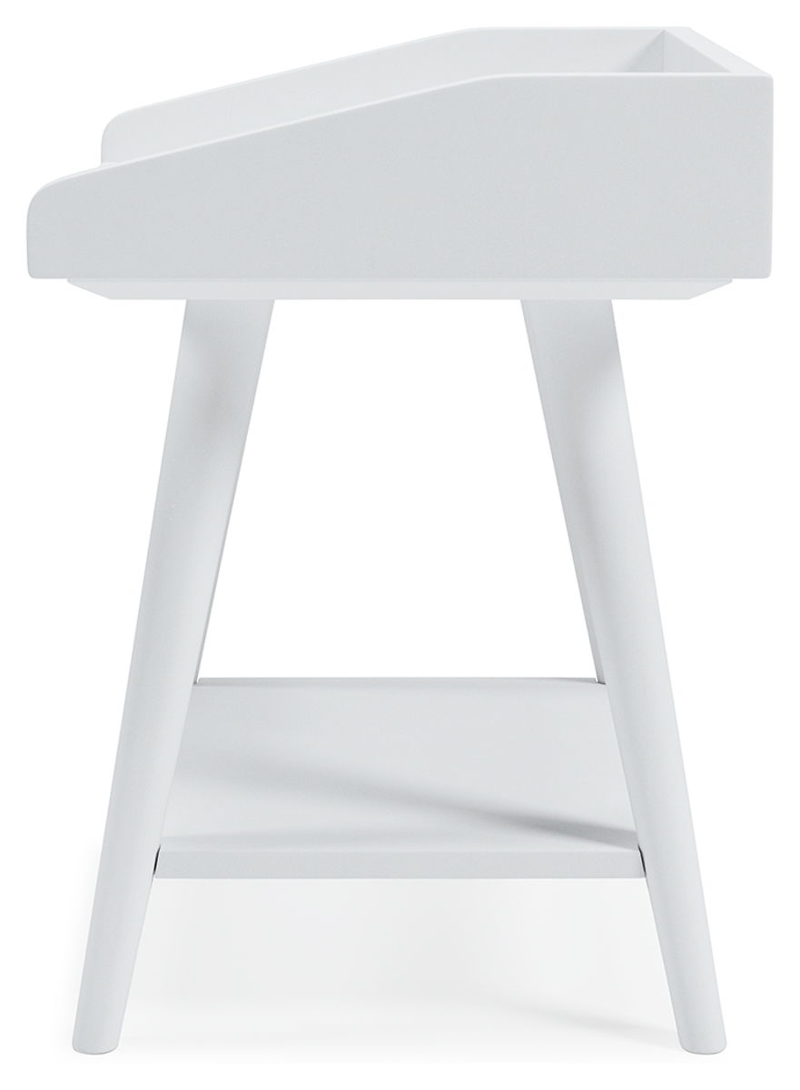 Display your decor with simple style on this accent table. Constructed of wood and engineered wood in a crisp, white finish, this table blends easily with your existing living room aesthetic or stands in as a kid’s bedside table. A gallery rail top, undermount shelf and dual USB chargers keep your life (and your look) simply sensational.