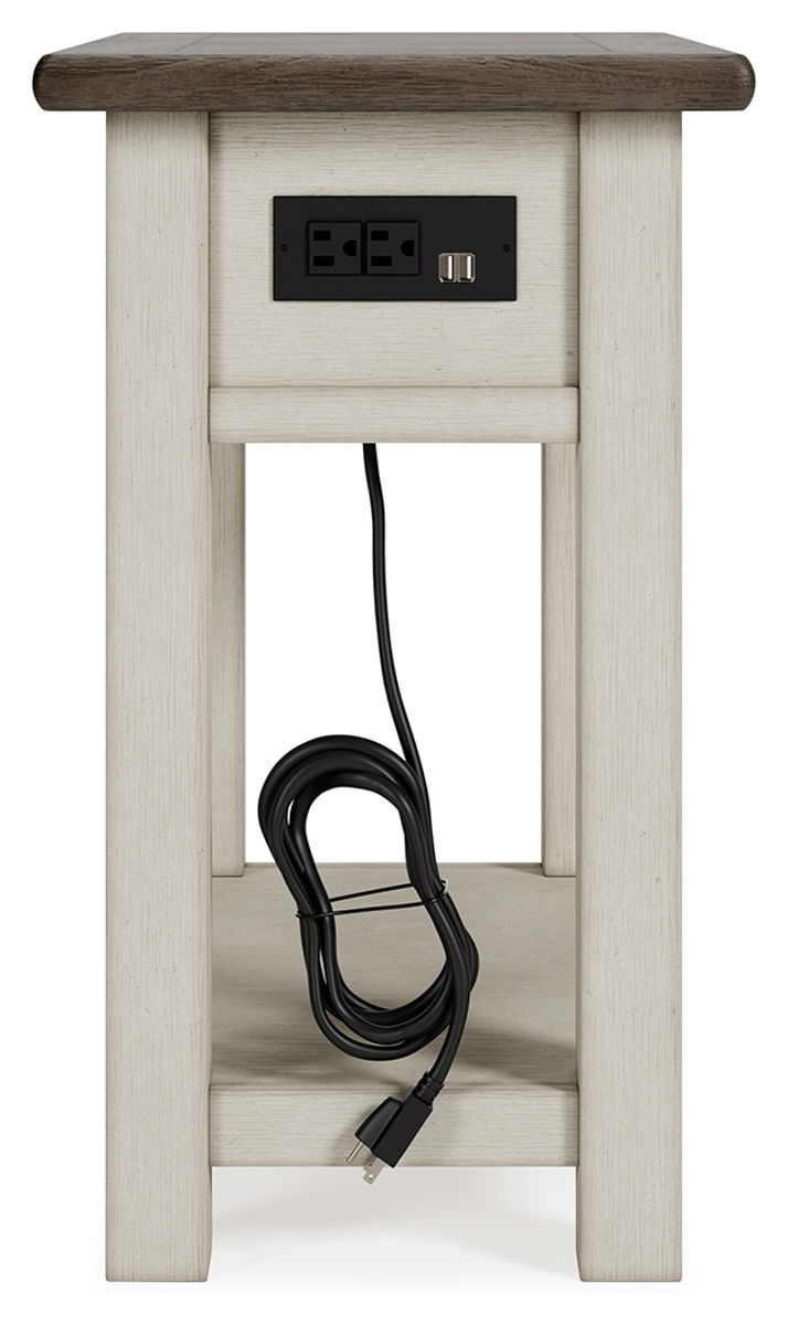 Whether your style is farmhouse fresh, shabby chic or country cottage, you’ll find this chairside end table dressed to impress. Its two-tone finish pairs weathered with antique for that much more quaint character. Charming elements include a plank-and-frame style top, black faceted hardware and a smooth-gliding drawer for remote controls and more. Integrated power supply with dual USB charging ports is ideal for keeping your personal devices at the ready.