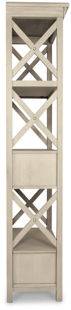 Need a stylish space to showcase dinnerware, pictures, decorations and more? This tall three-shelf display cabinet is a dream come true. The textured antiqued white finish provides a perfect backdrop for presentation. For the items you want to hide, there are two deep drawers. Embellished with the casual appeal of lattice sides, attractive crown moulding, clean lines and lightly distressed finish, this cottage-style shelf provides ample storage in such an artful way.