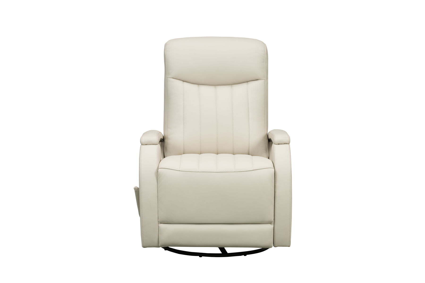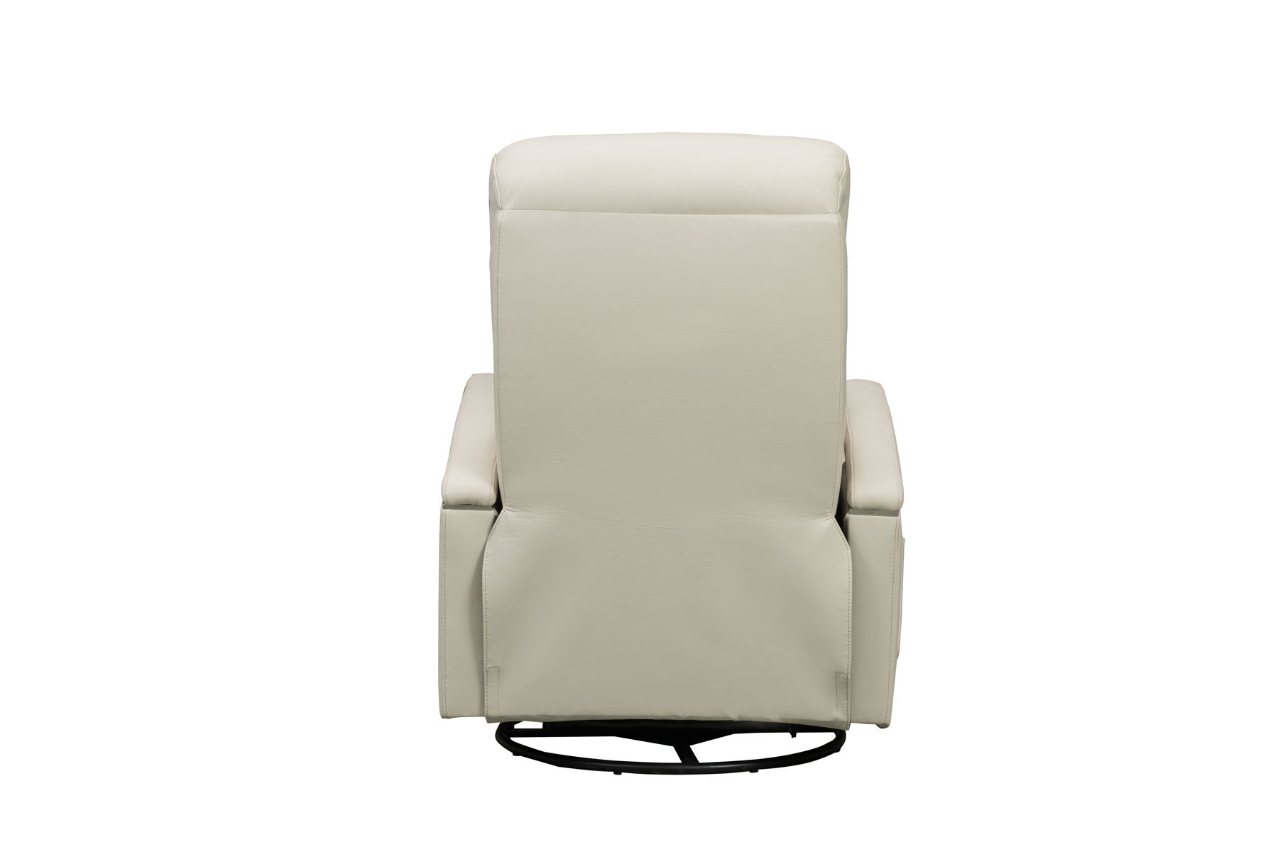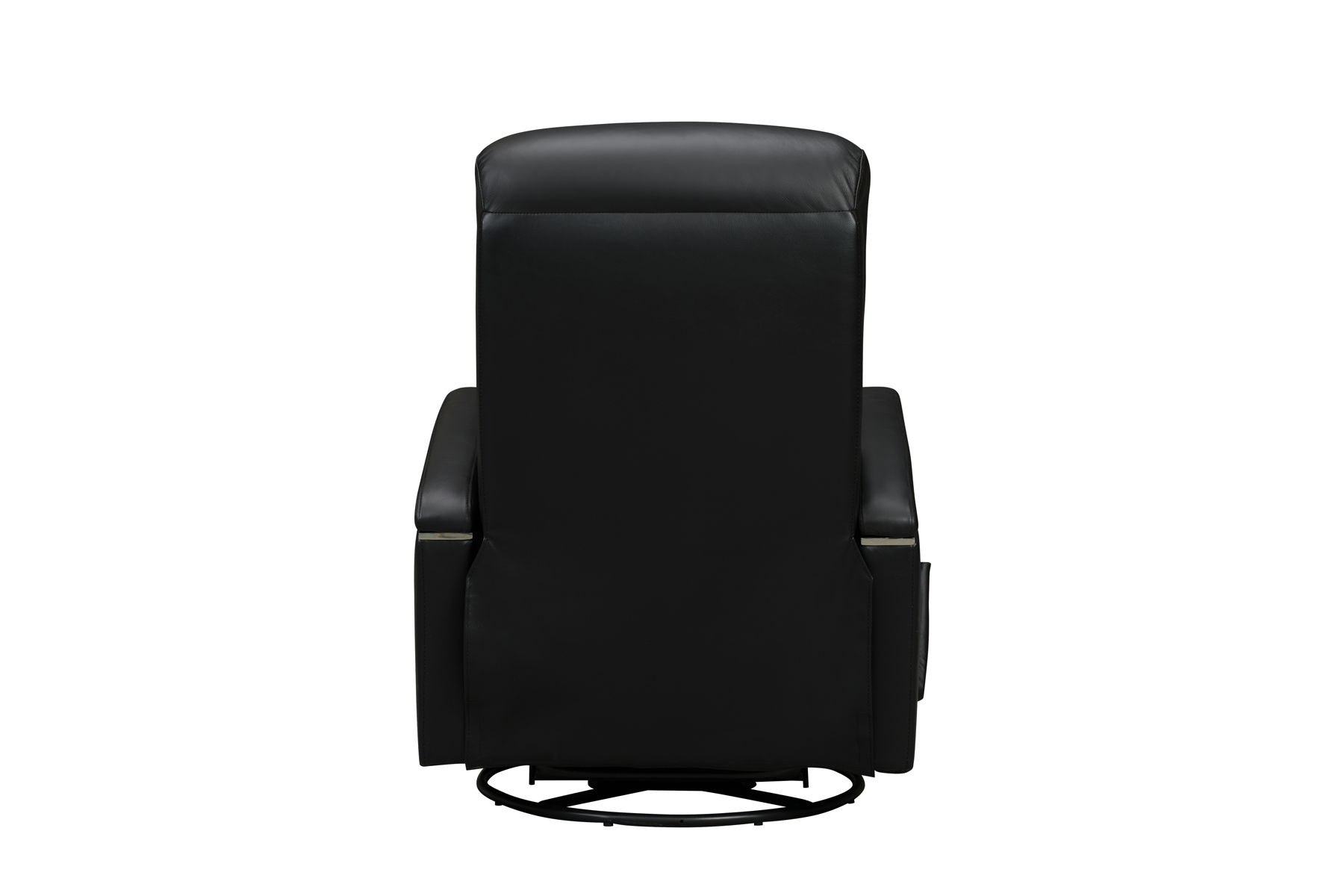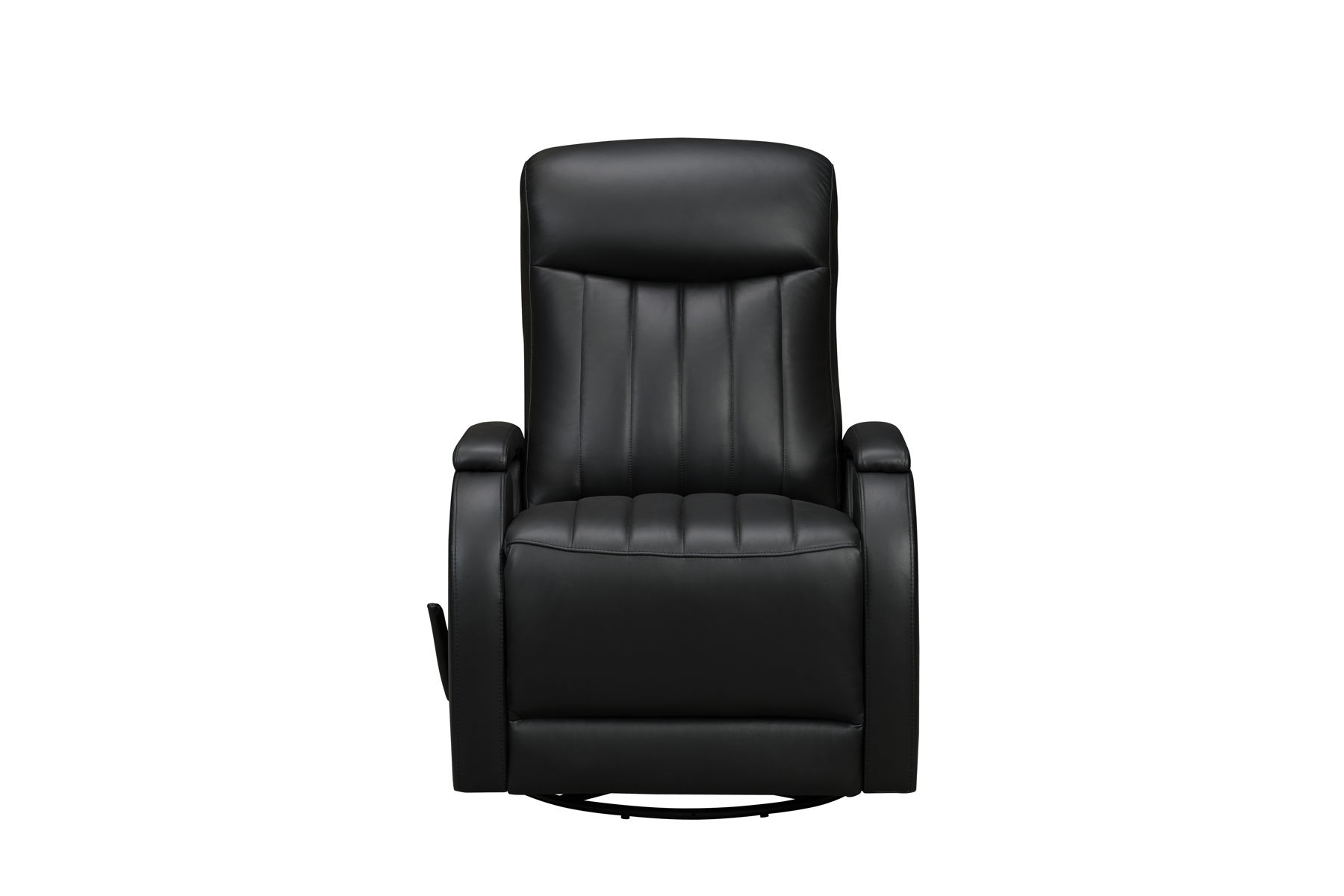 Modern open track arm design, 360-degree swivel glider recliner with handle activated recline. 4” channels on the seat & back, pad over chaise seating with pocketed coil springs, and plushily padded headrest and footrest for outstanding reclining comfort. Chrome accents under the arm pads and single needle top stitching thru out.