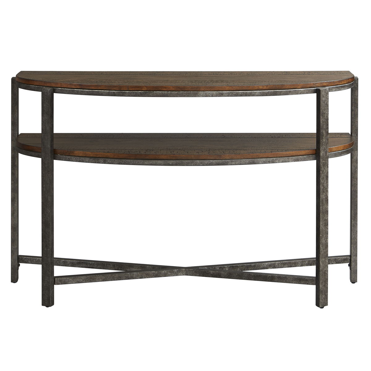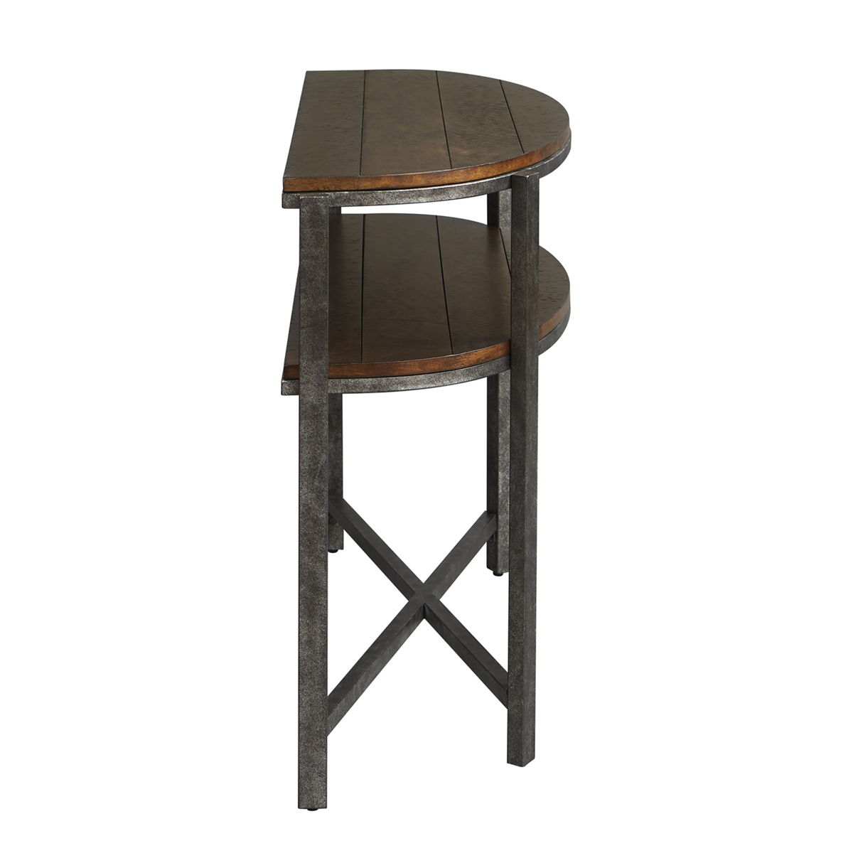Planked table tops are accented with square tube metal legs that flow into an x-design stretcher base. The tops are slightly raised for added dimension.