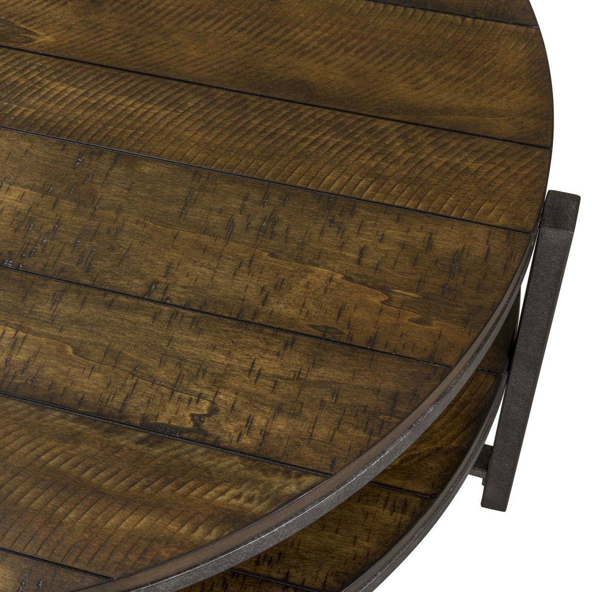 Planked table tops are accented with square tube metal legs that flow into an x-design stretcher base. The tops are slightly raised for added dimension.