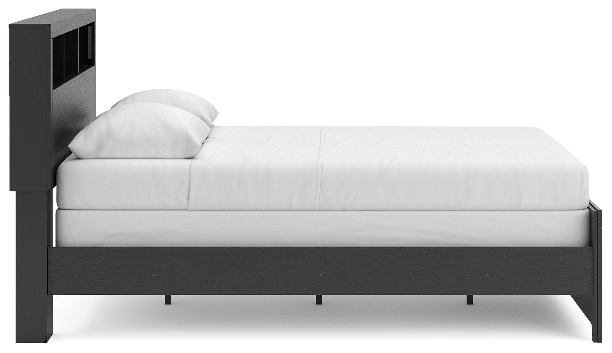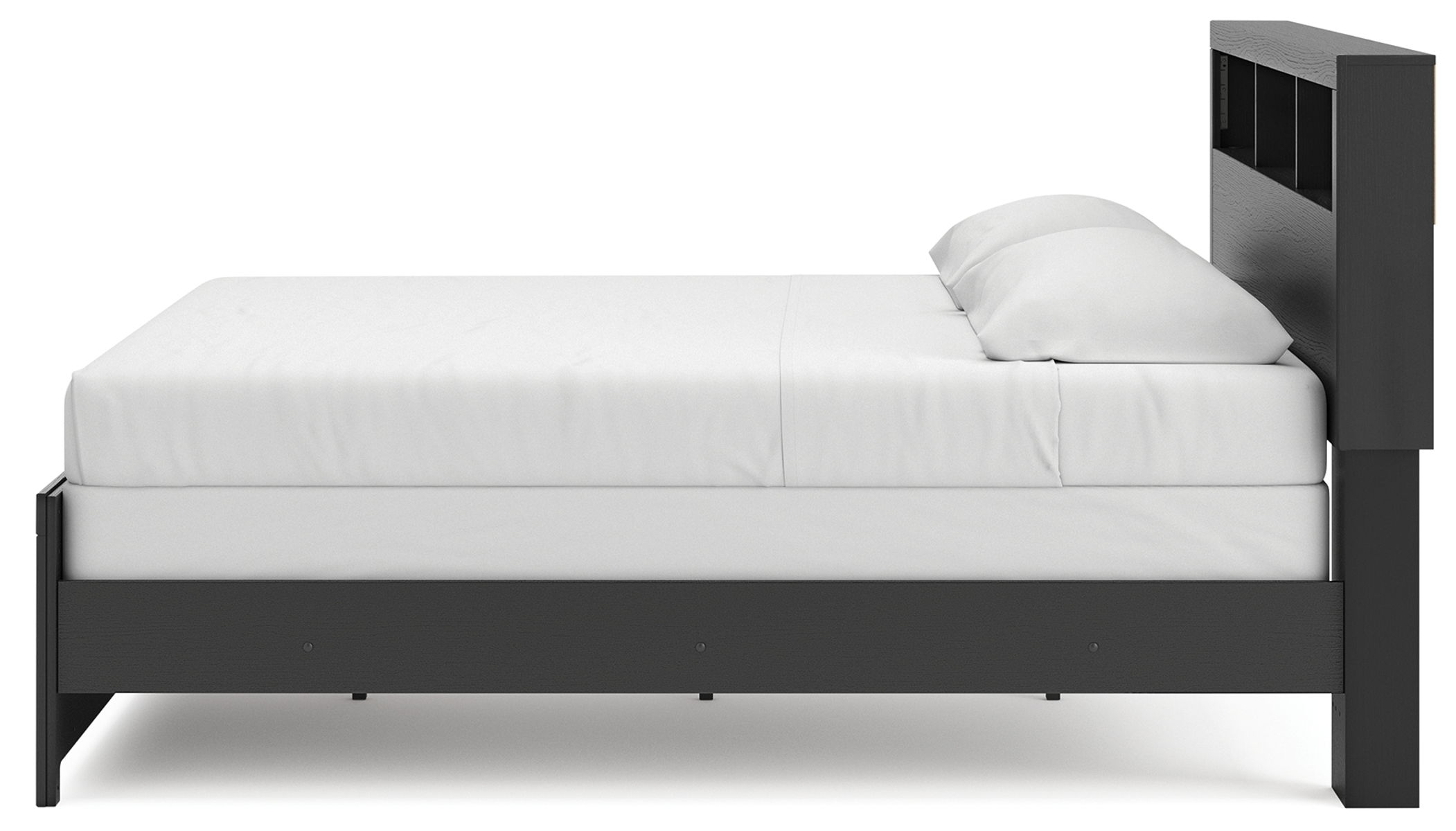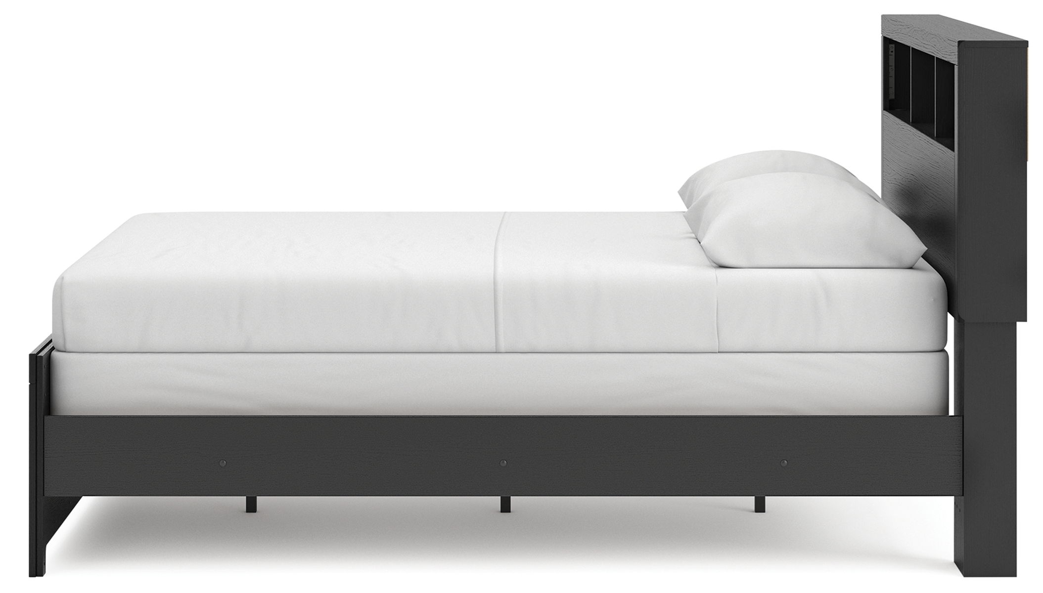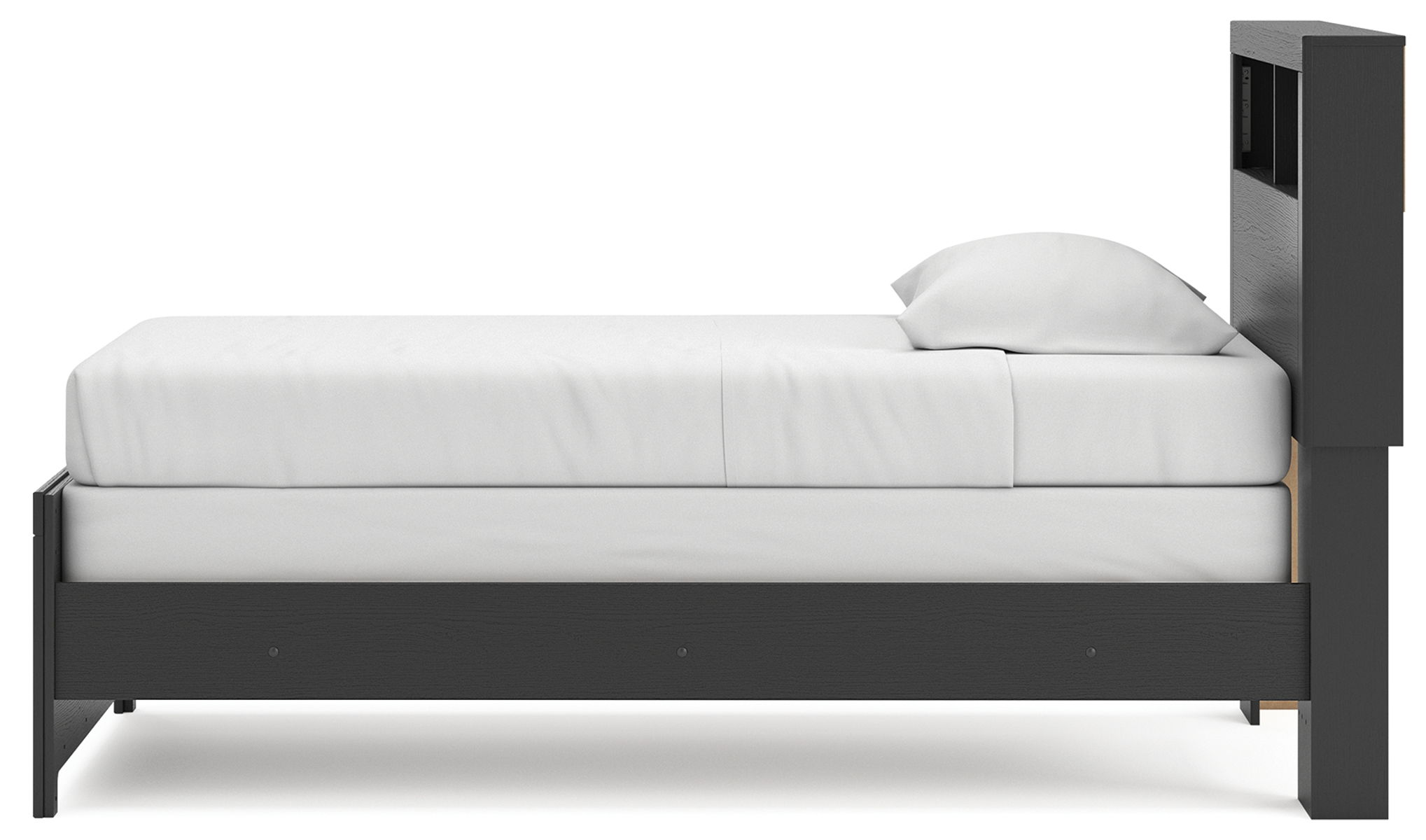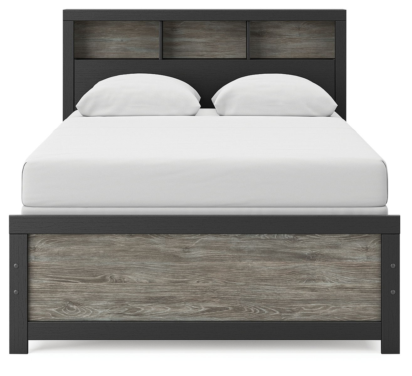 Comfy and versatile, this bookcase bed evokes the tranquil vibe you long for in your dream destination. Its two-tone textured look marries a rustic finish and a matte finish over replicated oak grain for neutral appeal. Three open cubbies in the headboard add space-saving storage, keeping favorite reads, bedtime essentials and so much more within easy reach.