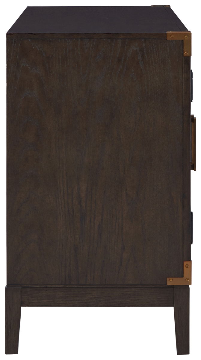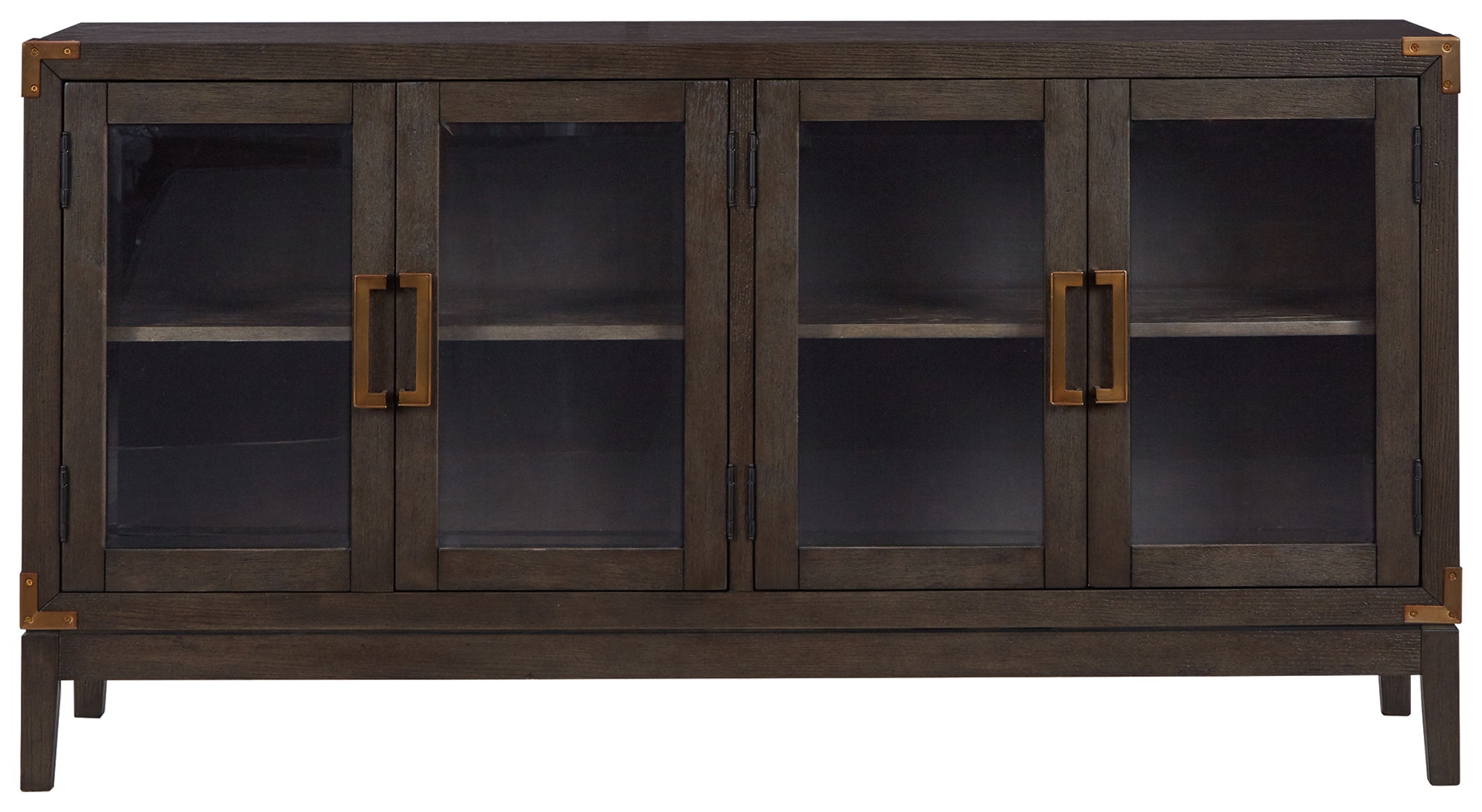 Dressed to thrill, this simply stunning dining server offers a high-design look at a down-to-earth price. Ultra sleek lines are accentuated with a dark waxy brown oak-tone finish that’s so easy on the eyes. Custom bar pulls on the double-door cabinets emphasize the server’s clean, modern lines, while their brass-tone finish and metal accents in the same coloration complete the upscale aesthetic. Beautiful inside and out, glass front doors showcase the adjustable shelving to create a display and storage piece with a timeless look that’s made to last.