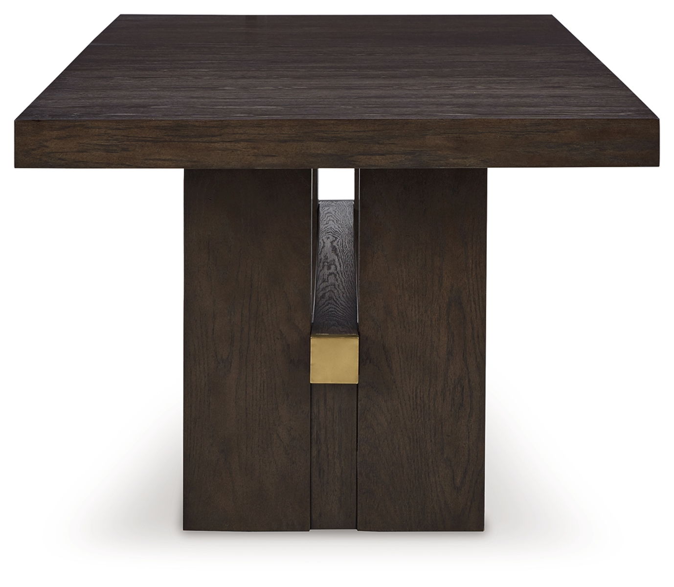 Dressed to thrill, this simply stunning dining room group offers a high-design look at a down-to-earth price. Ultra sleek lines are accentuated with a dark oak-tone finish that’s so easy on the eyes. Clean-lined and modern, the double pedestal base and thick edge tabletop showcase quality craftsmanship and attention to detail. The stunning host and armless chairs offer a high-design look at a down-to-earth price. Whether you’re hosting family meals or holiday entertaining, it has a timeless look that’s made to last.