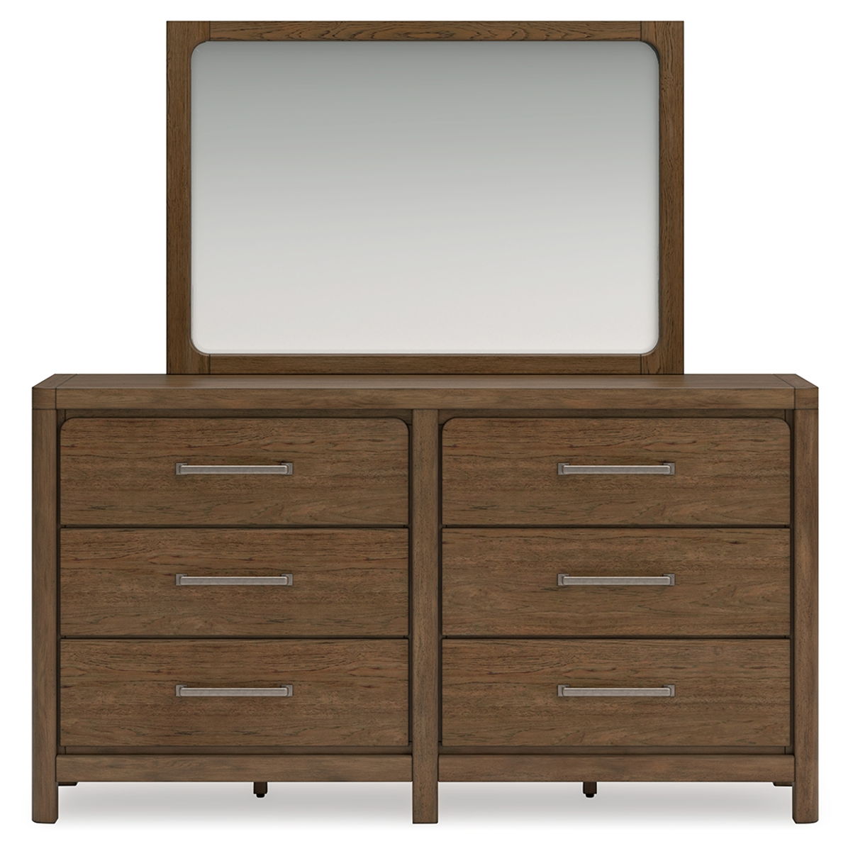 This dresser with mirror sits comfortably at the intersection of modern lodge and farmhouse aesthetics. Your warm and welcoming disposition is reflected in the charming architectural elements and light brown glazed finish. Even with its poise, the piece remains practical. Smooth-gliding drawers tuck away necessities, defining your bedroom with reliable function and style.