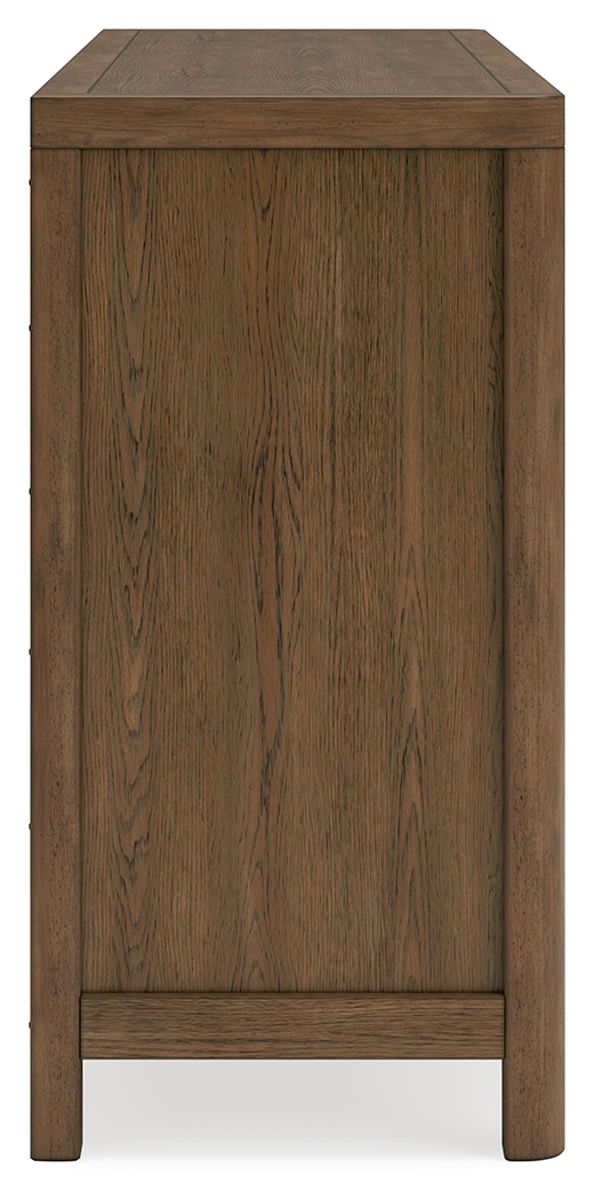 This dresser sits comfortably at the intersection of modern lodge and farmhouse aesthetics. Your warm and welcoming disposition is reflected in the charming architectural elements and light brown glazed finish. Even with its poise, the dresser remains practical. Smooth-gliding drawers tuck away necessities, defining your bedroom with reliable function and style.