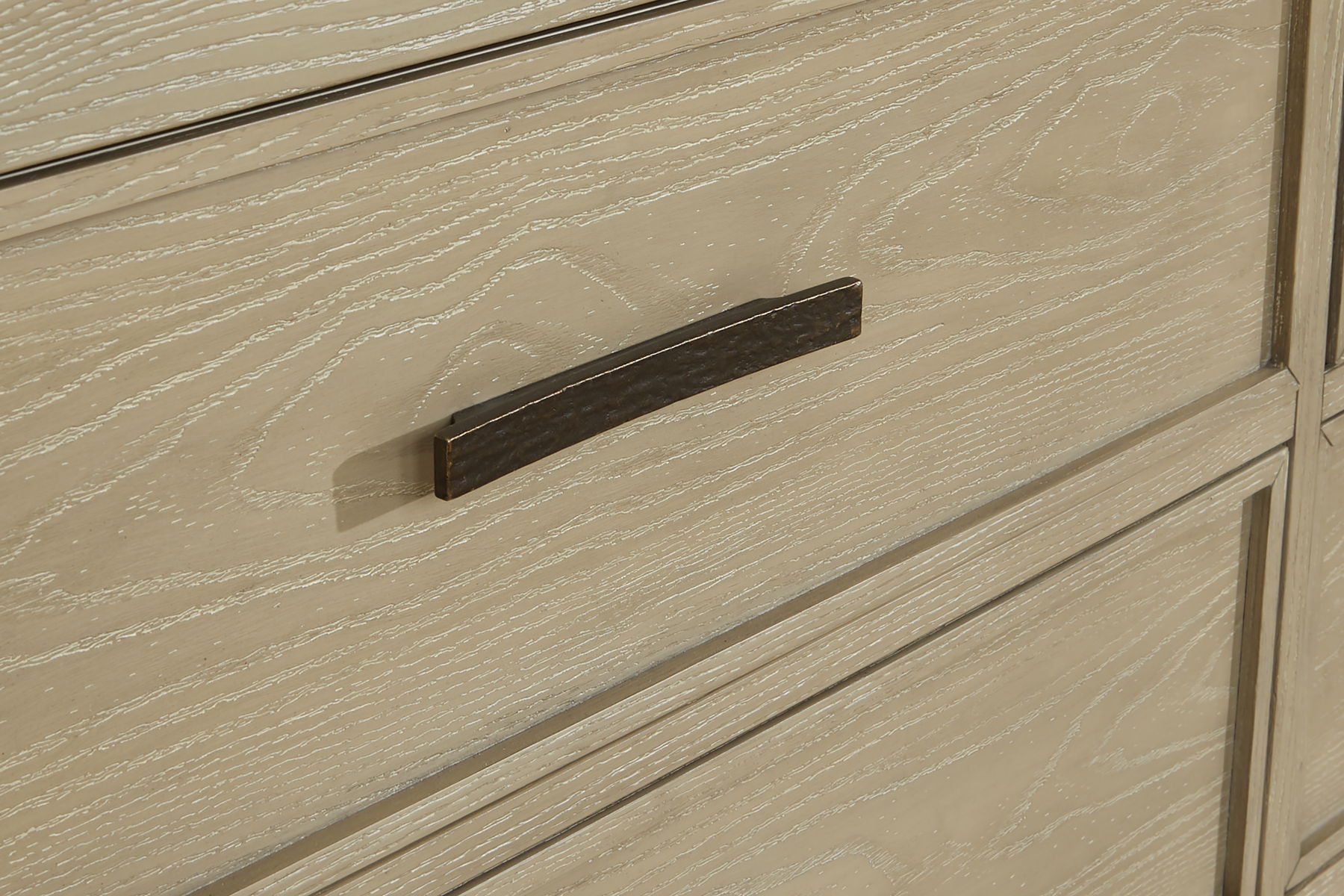 - Gray wash finish highlighted with a white glaze; embossed oak wood grain texture