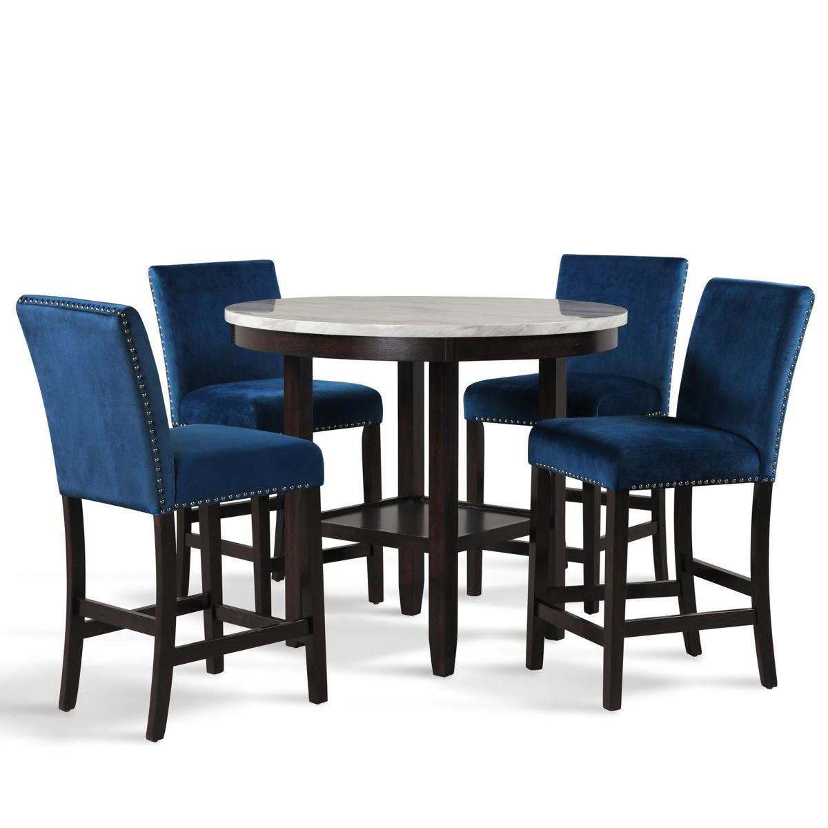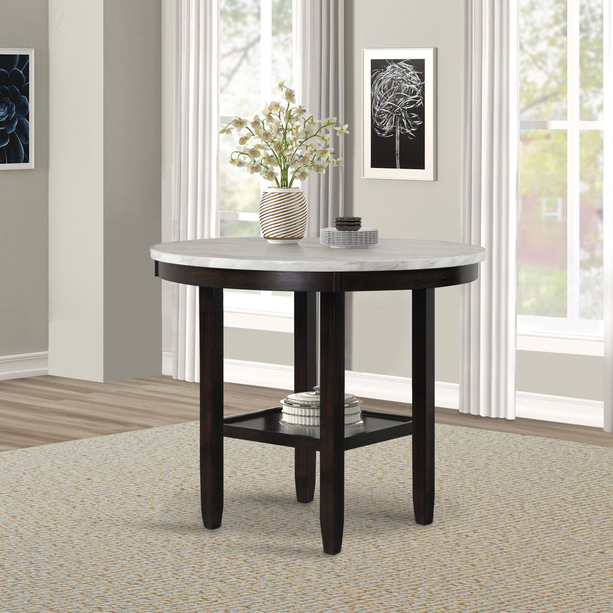 Glam up your dining space with the Celeste 42″ Round Counter Table. Crafted for lasting durability, this counter table features solid Rubberwood legs and robust manufactured wood components. The heat and water-resistant faux marble top, finished with a glossy coat, not only enhances its contemporary glamour but also ensures effortless cleaning and protection from daily wear. The sleek combination of a white surface with gray veining against deep espresso legs creates a modern ambiance for your space. Invest in this quality-built, heat, and water-resistant counter table to seamlessly blend style and practicality in your home.