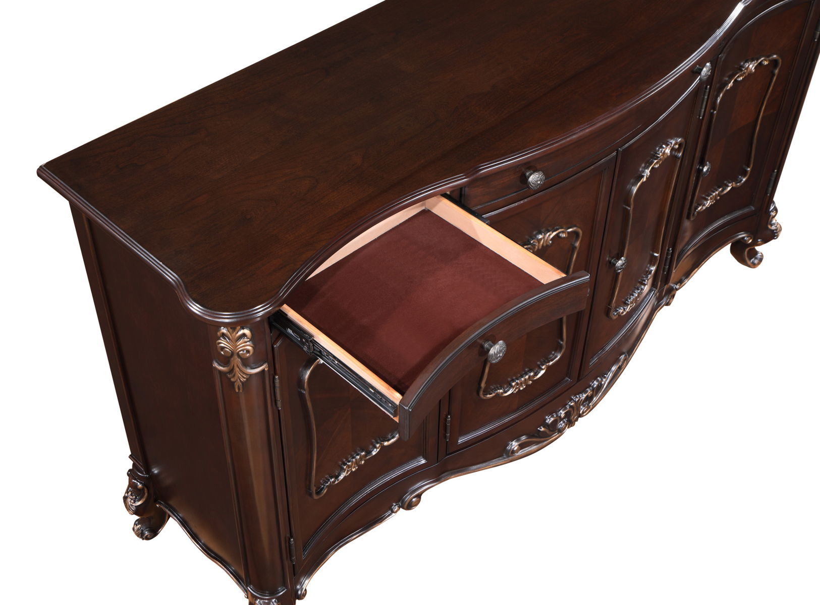 The Royal Classics Constantine 2-Piece China Buffet and Hutch Set in cherry is a stunning blend of heirloom craftsmanship and practical design, making it an elegant addition to any dining space. This set includes a china buffet base and a hutch top, both expertly crafted from solid pine and premium fancy face birch veneers, ensuring long-lasting beauty and durability. The meticulous multi-step finish enhances the natural grain of the wood, while burnished gold tipping highlights the intricate carvings, adding a luxurious touch. Inspired by 18th-century Rococo style, the ornate detailing brings a regal elegance and sophistication to your home. The mirrored hutch offers ample display space, beautifully illuminated with interior lighting to showcase your finest china and collectibles. Three velvet-lined drawers in the buffet securely store flatware, while the spacious open shelving behind the doors provides convenient storage for larger items. Combining beauty and functionality, this china cabinet is perfect for adding both style and versatility to your dining room.