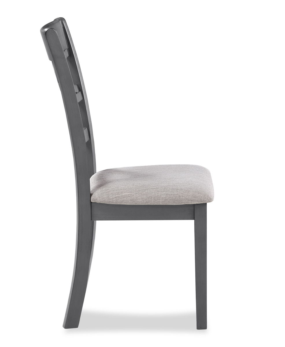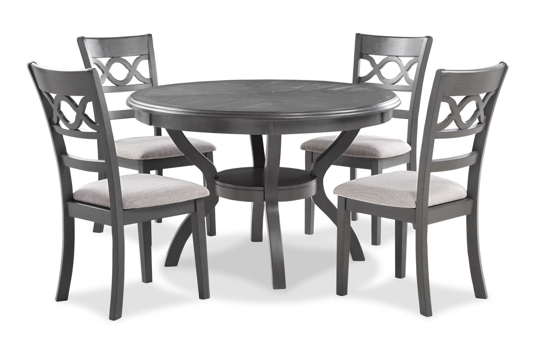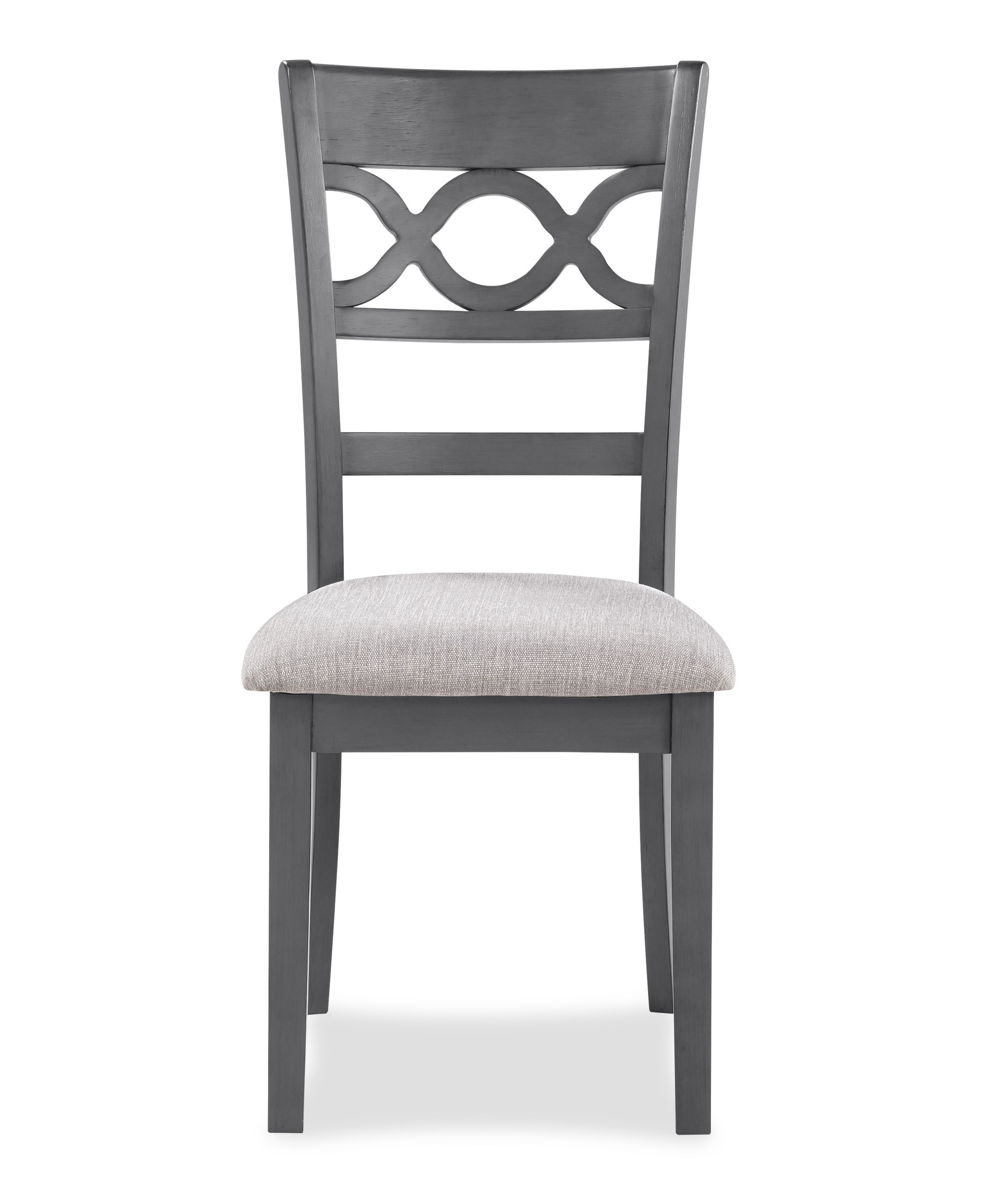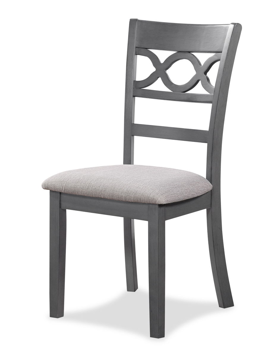 The graceful Cori Dining Table and Chair Set is built with durability and comfort in mind. This dining set provides spacious seating for four and a handy storage shelf located under the table top to store dinnerware or decor. The dining table apron, table legs and dining chair legs are crafted of solid Rubberwood to add strength and stability. The distinctive reverse diamond Mindi wood veneer dining table top accents the beautiful wood grains which are highlighted by the multi-step finish. The set includes four comfortable dining chairs with 100% polyester seat cushions. The final touch is Cori’s signature interlocking chain design on the chair back, giving this welcoming dining set a touch of sophistication. The result is a casual, contemporary dining set, perfect for your dining room or kitchen.