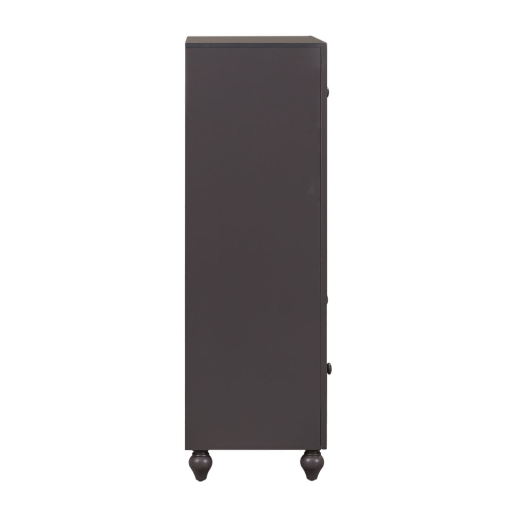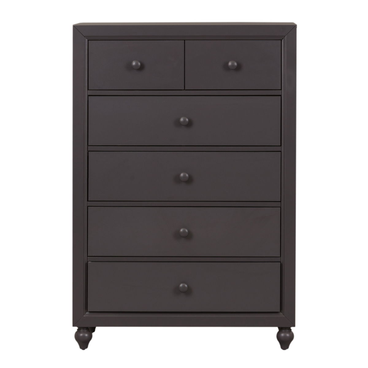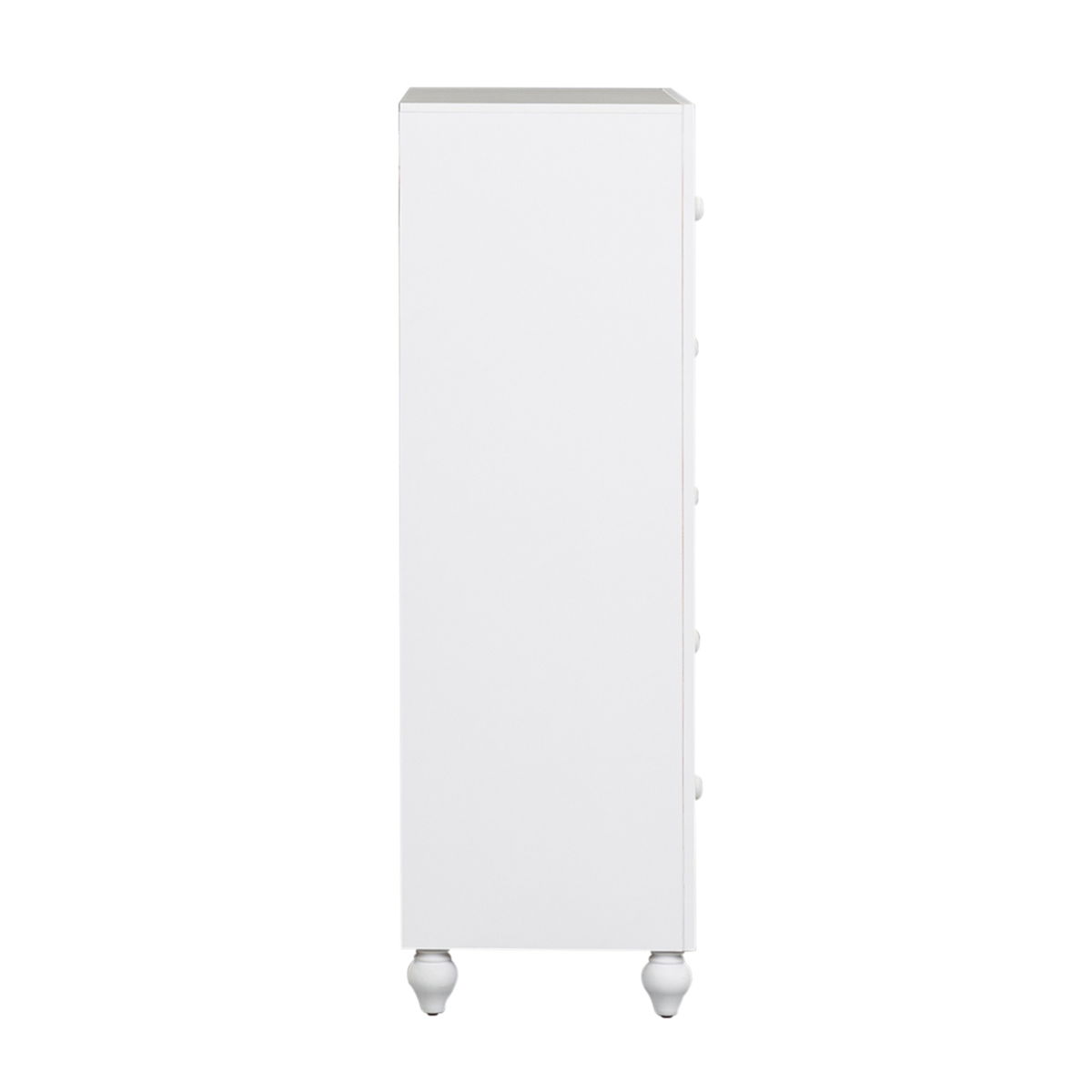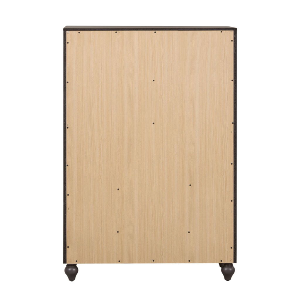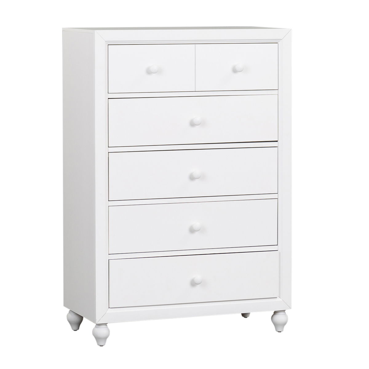 Indulge in cottage design with the Cottage View 5 drawer chest. Crafted by melamine and a rubberwood solid frame, this piece features kenlin drawer glides, bottom case dust proofing, solid wood picture framed molding, laminate drawer interior, bluff cut top drawers, wood knob hardware, and is anchored by bun feet. This piece is available in an alternate finish and the melamine is scratch resistant, sure to make this piece last in any home.