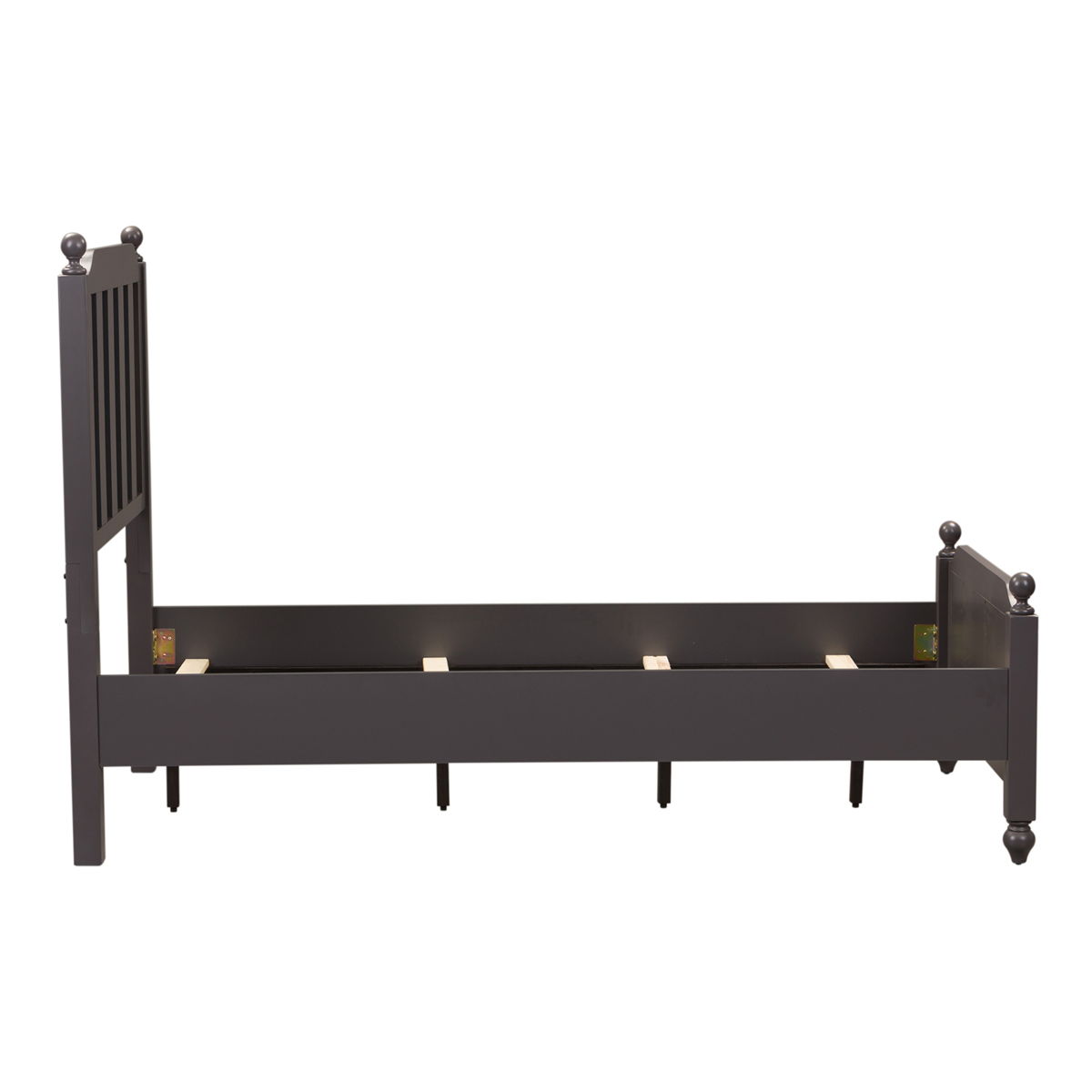 Fall into the cottage view panel bed at night. Crafted of melamine and a rubberwood solid frame, this piece features a dark gray finish, a square post bed with round finials and slat overlays, anchored by bun feet. Never question the reliability of this bed with the hook on rails and center supported slat system. This piece is offered in an alternative finish, sure to complement any space effortlessly.