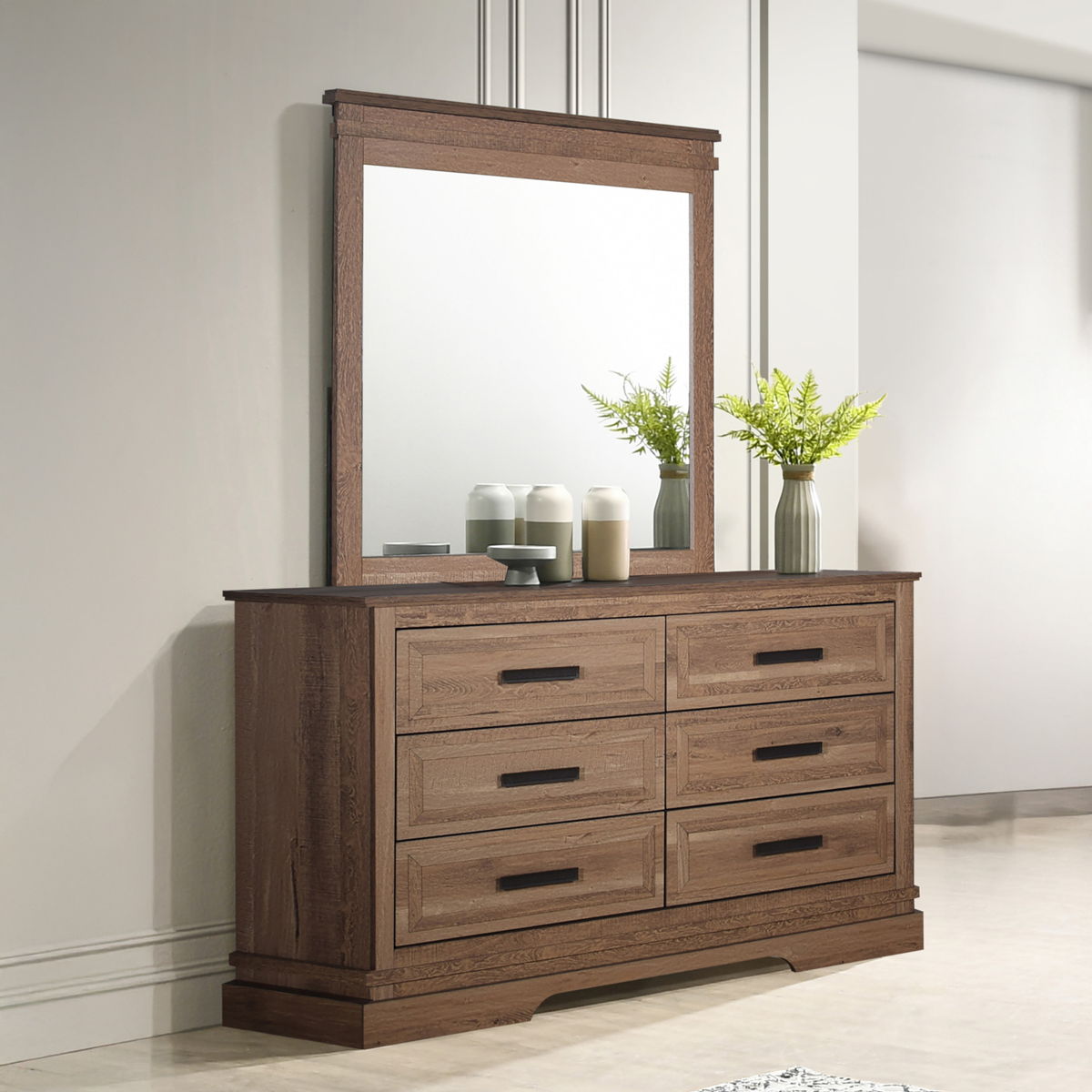 The Coventry Hall Mirror in Pecan offers durable and stylish construction, making it an ideal addition to any bedroom. Crafted from high-quality manufactured woods and topped with eco-friendly decorative laminate, this mirror ensures long-lasting use and stability. The modern rustic design combines the warmth and texture of natural wood with clean lines and minimalism, making it versatile enough to complement various decor styles. The eco-friendly laminate not only captures the organic look of natural wood but also resists scratches, stains, and moisture, maintaining its beauty over time. The low-distortion glass provides a clear and true reflection, adding both functionality and elegance to your space. The Coventry Hall Mirror is a practical and sophisticated choice for enhancing your bedroom decor.
