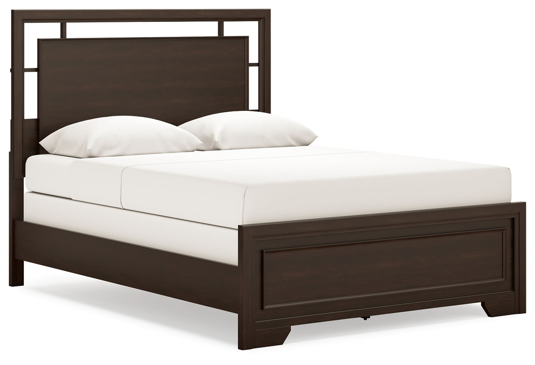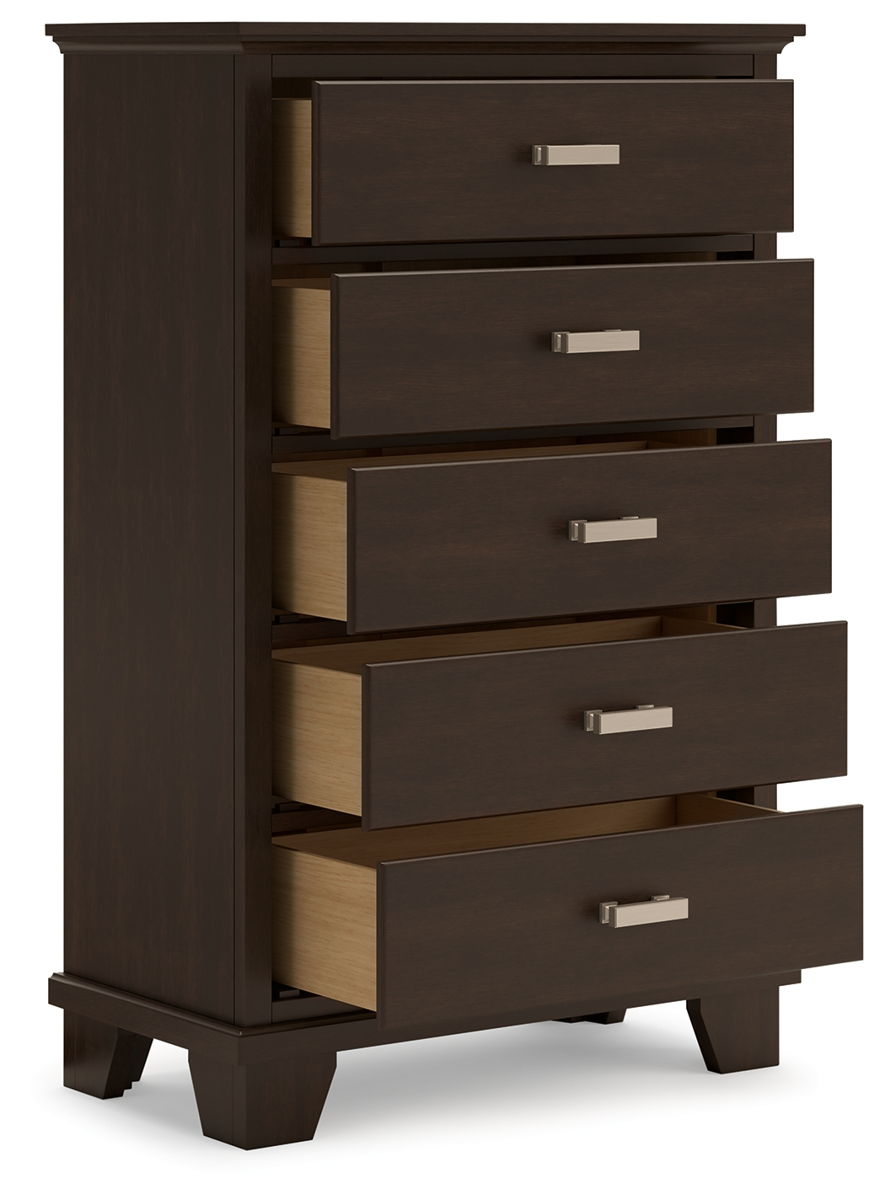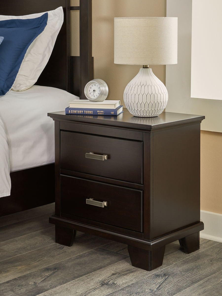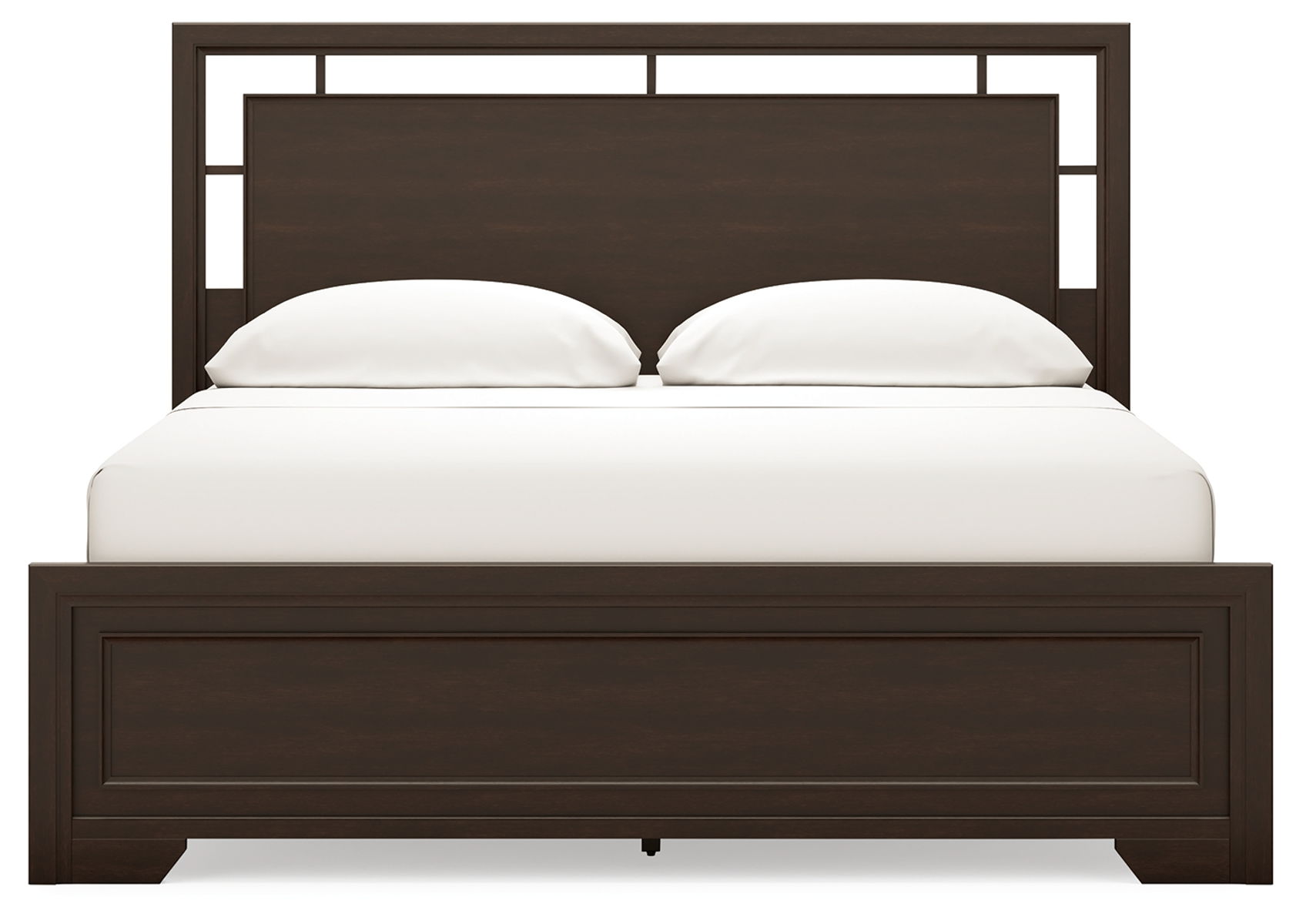 Transitional design. Made with hardwood solids, wood veneer, and MDF substrates. Transitional styled cases with a Metropolitan flare. Drawers feature English dovetail construction, a clean wood grain laminate interior and metal center guides. Metal bar pulls with a bright nickel color finish. Panel bed features a floating headboard panel design with a stylish picture framed footboard. Such a refined way to wake up your bedroom style.