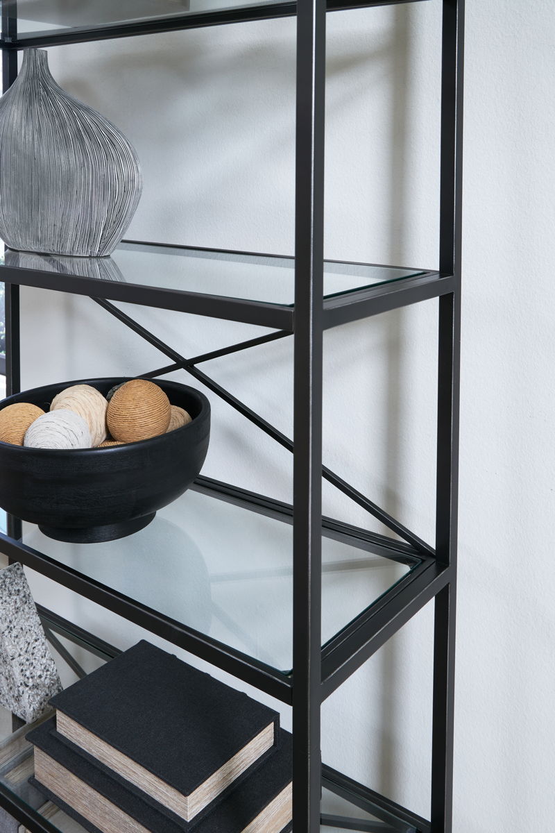 This bookcase proves that traditional designs are simply timeless. Five spacious glass shelves offer plenty of room to display today’s meaningful mementos and awesome accessories. With a classic antiqued black finish, it’s just got that ageless appeal.