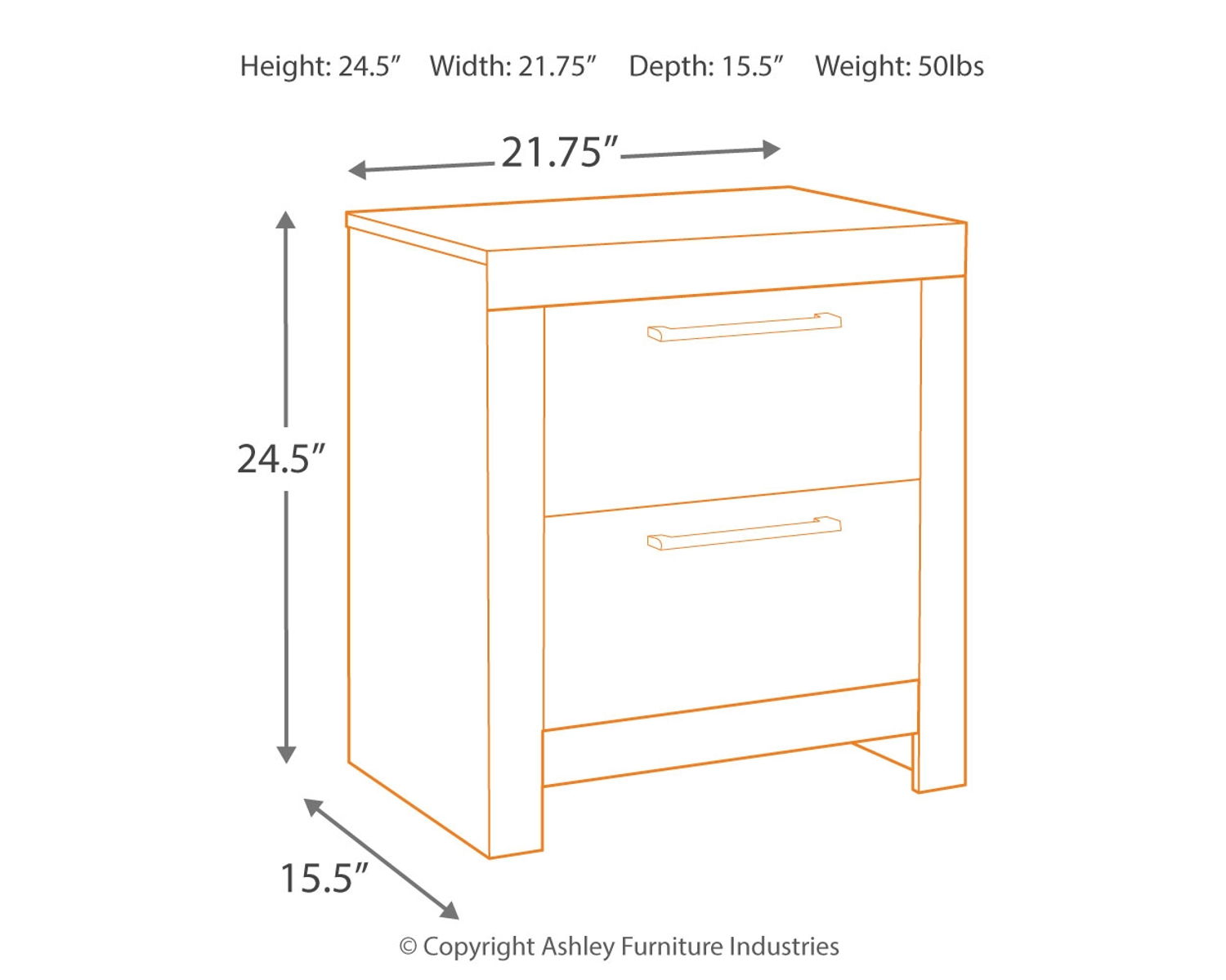 Modern yet hefty. This nightstand makes an urban eclectic statement. Its seasoned raw wood look merges with the clean-lined design we love today. A muted rustic finish over replicated pine grain maintains its authenticity. Roomy drawers are flanked with attractive framed fronts and pilasters. Handles with an antiqued gunmetal finish complete this beauteous look with easy-to-pull function.