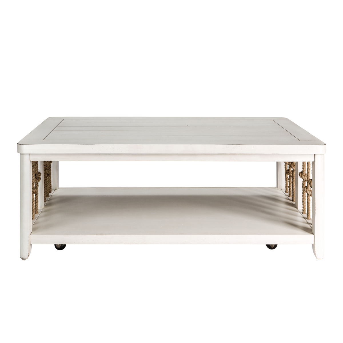 Dockside is a great eclectic look with coastal style. Knotted rope creates the end panels on the tables and planked tops add to the casual style. The rectangular cocktail features casters and the storage trunk has weaved rope pilasters with a cedar inside lining.