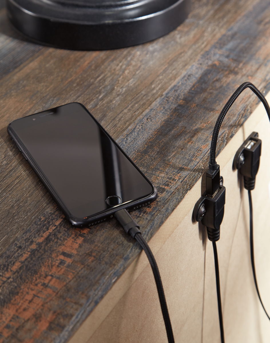 When merged in just the right way, rustic and industrial styles can make one happy marriage. Case in point: this bookcase bedroom group with storage. A refined take on barn board beauty, its complex, replicated wood grain showcases hints of burnt orange and teal tones for a sense of weatherworn authenticity. Three open cubbies lined with a dimming LED light strip keep bedtime reads top of mind. Underneath the bed: four smooth-gliding drawers and four open cubbies that accommodate casually cool storage bins.