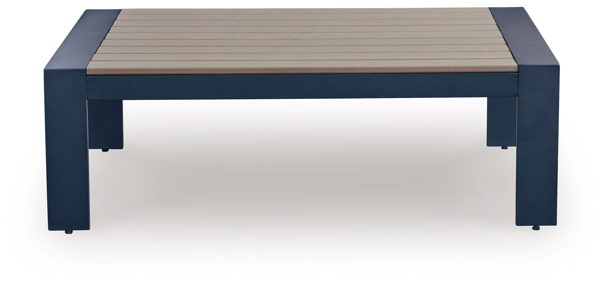Easy-breezy beauty, made to withstand the elements. This outdoor table makes a serene statement on your deck or patio with its soothing shade of blue and contrasting wood-look top. And with durable materials providing added longevity, this table is a smartly-stylish addition to your outdoor oasis.