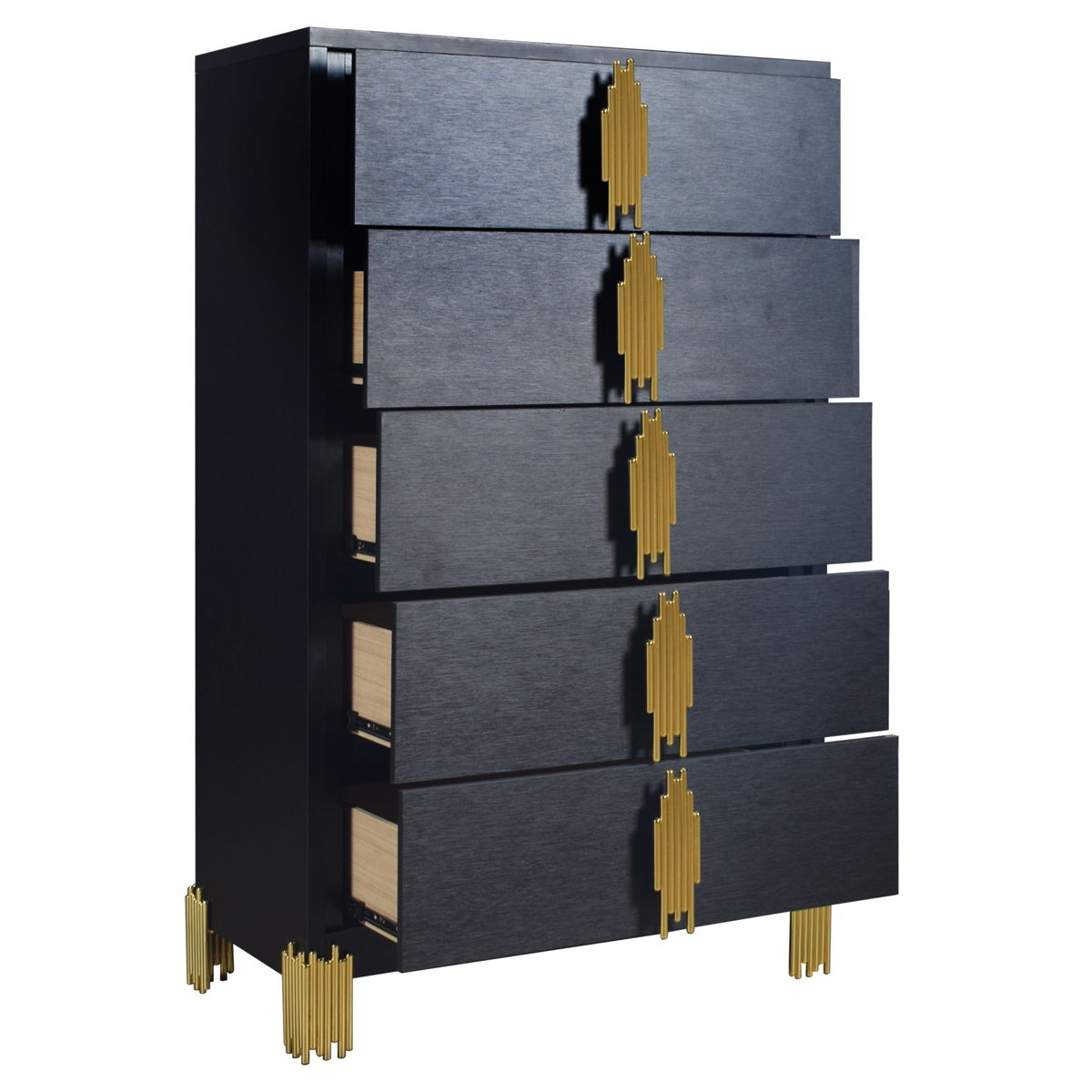 introducing the Empire 5 Drawer Chest in sleek black, a chic storage solution for your bedroom. Crafted with durable eco-friendly materials and a sophisticated finish, this chest exudes contemporary elegance. Its gleaming gold tiered drawer pulls and feet evoke the enchanting allure of a city skyline at night, adding a touch of glamour to your space. Inside, the drawers are meticulously crafted with English dovetail joinery and ball bearing glides, ensuring smooth and reliable operation. Enhance your bedroom with the Empire 5 Drawer Chest, where beauty meets quality for a truly captivating ambiance.