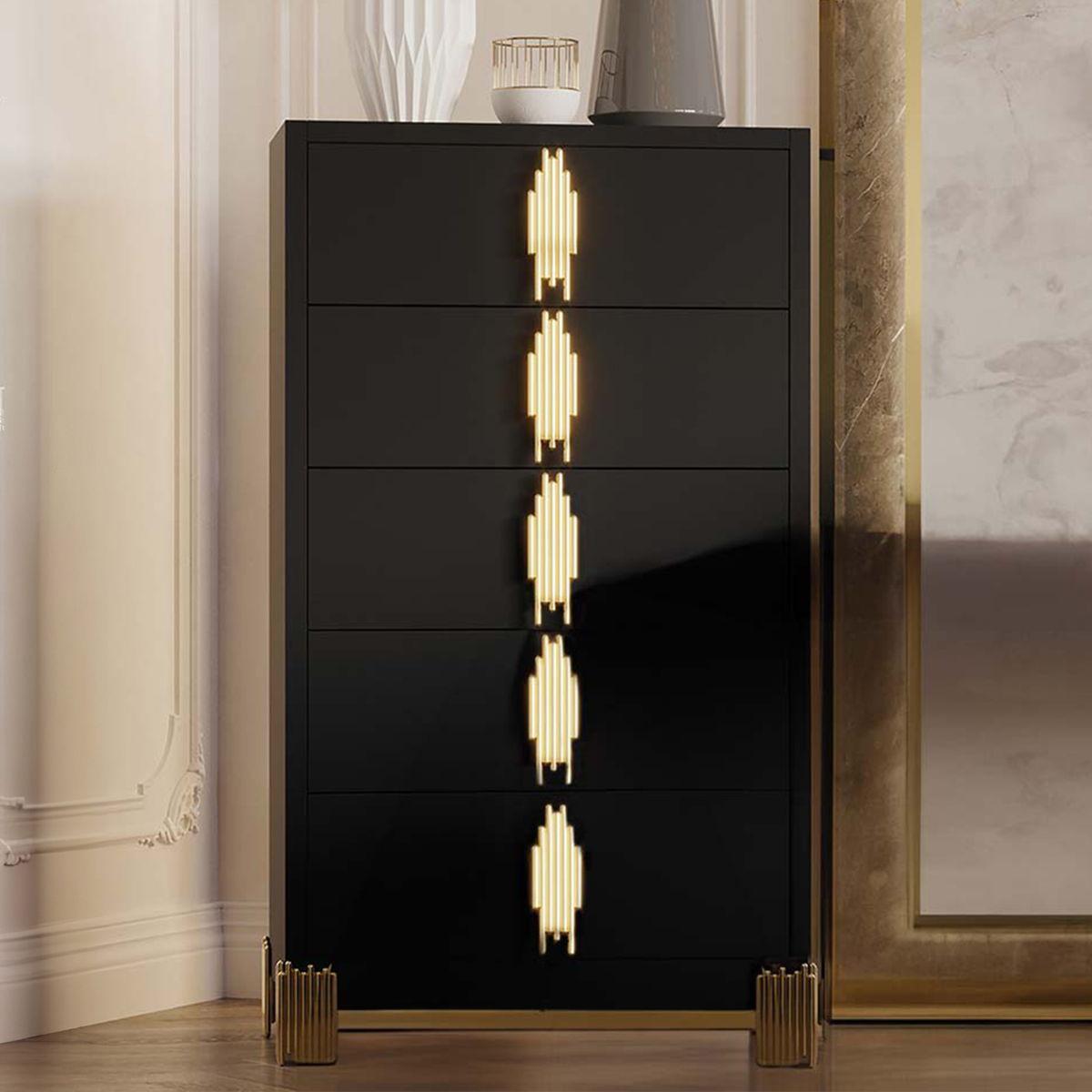 - Modern Metro Style: Its gleaming gold tiered drawer pulls and feet capture the feel of a nighttime city skyline glimmering with starlight.