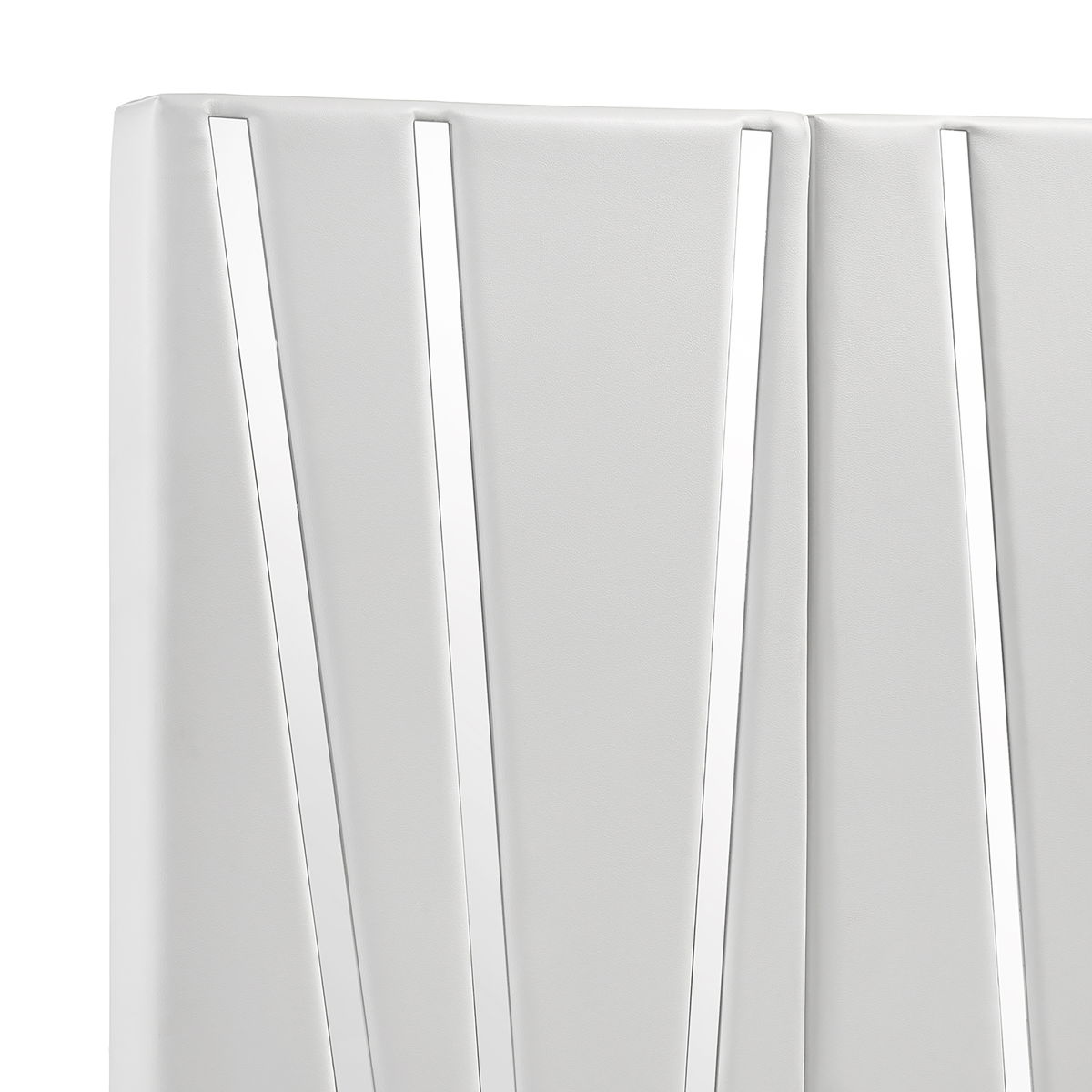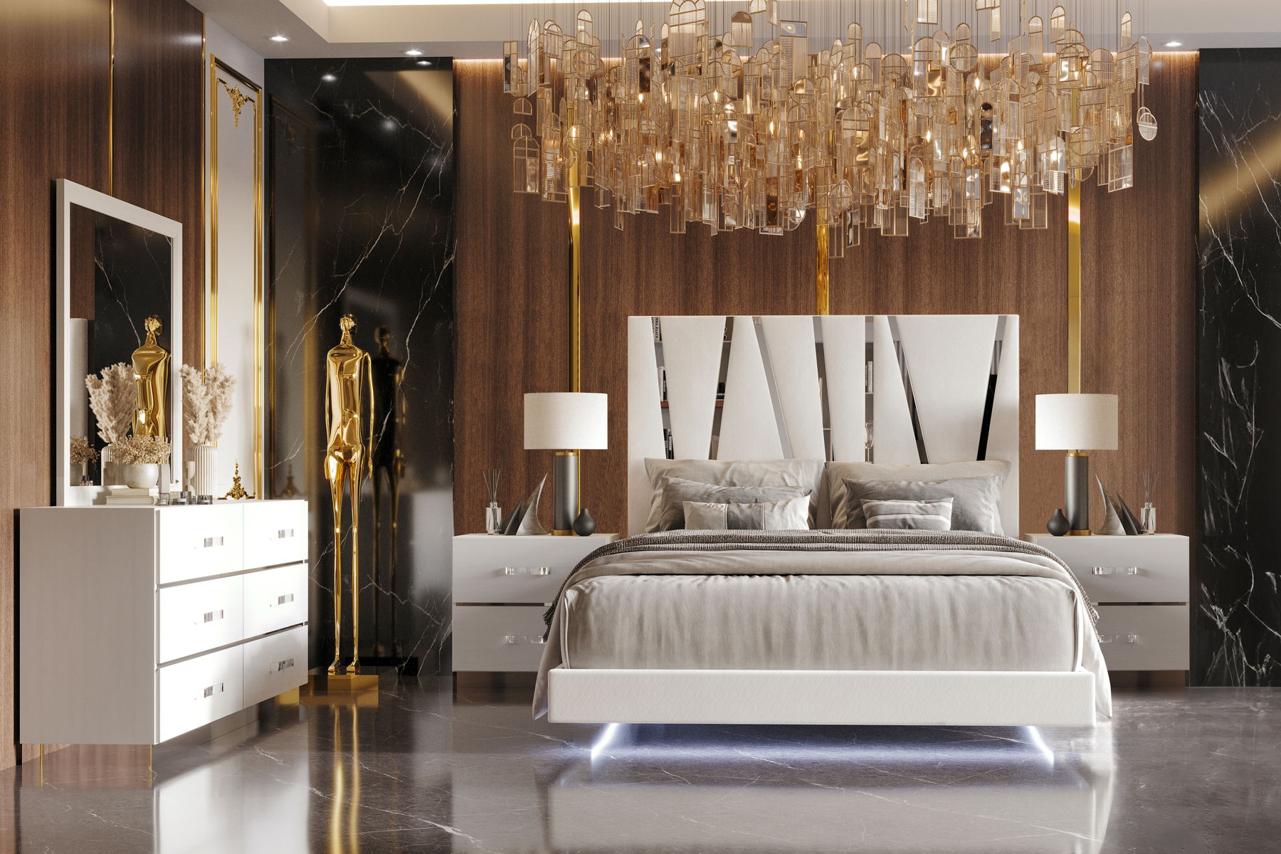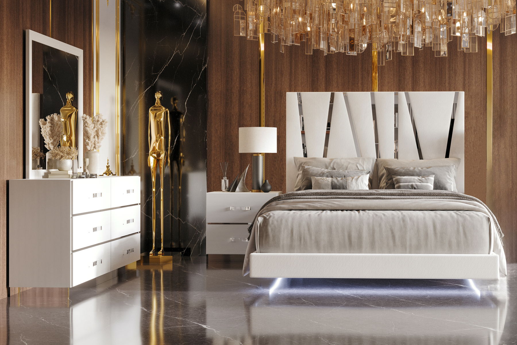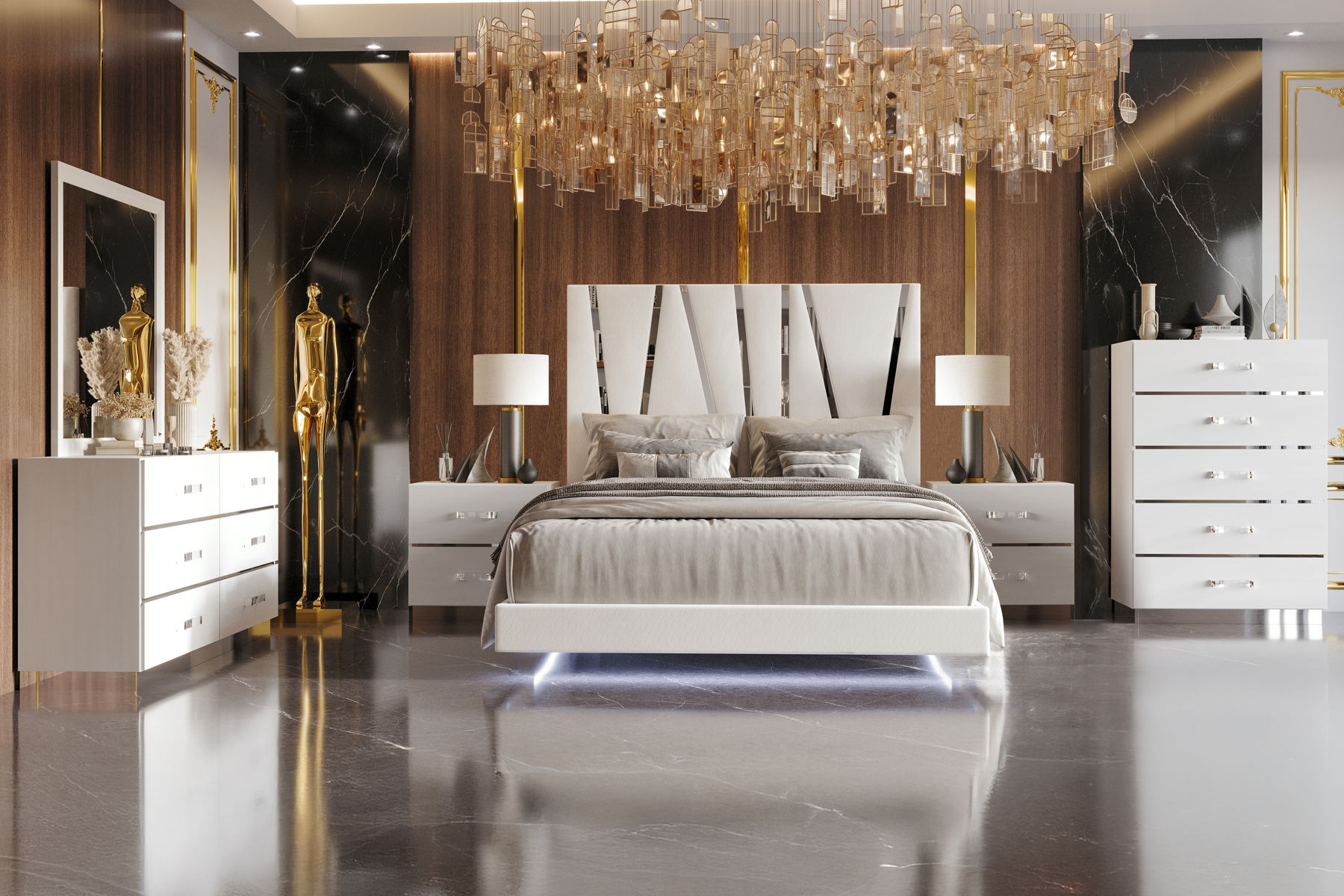 The Europa Panel Wall Bed offers a blend of modern elegance and practical design. This set includes a panel bed, two nightstands, and two nightstand back panels. The sleek, integrated headboard wall and nightstands creates a seamless and sophisticated look, enhanced by the white finish, mylar accents, and acrylic drawer pulls. Built with quality craftsmanship, the eco-friendly manufactured woods ensure durability, while the surfaces are finished with a glossy white topcoat and padded upholstery for added comfort. The bed features upscale extras like soft blue base lighting that reflects off the silver mylar bases, casting an ambient glow. The sturdy drawers, constructed with dovetail joinery and ball bearing glides, provide durable, easy-glide storage with snag-free interiors. The 2-drawer nightstands offer ample storage for bedside essentials. Choose the Europa Panel Wall Bed for a luxurious and contemporary addition to your bedroom.